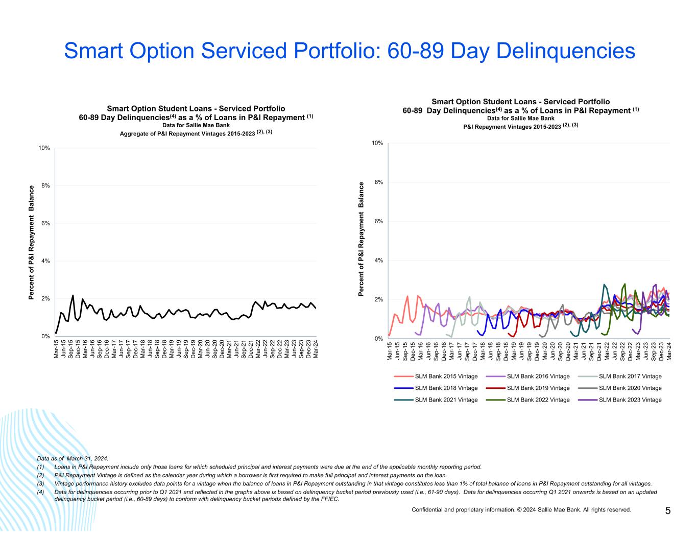 Confidential and proprietary information. © 2024 Sallie Mae Bank. All rights reserved. 4 Smart Option Serviced Portfolio: 30-59 Day Delinquencies 0% 2% 4% 6% 8% 10% M ar -1 5 Ju n- 15 Se p- 15 D ec -1 5 M ar -1 6 Ju n- 16 Se p- 16 D ec -1 6 M ar -1 7 Ju n- 17 Se p- 17 D ec -1 7 M ar -1 8 Ju n- 18 Se p- 18 D ec -1 8 M ar -1 9 Ju n- 19 Se p- 19 D ec -1 9 M ar -2 0 Ju n- 20 Se p- 20 D ec -2 0 M ar -2 1 Ju n- 21 Se p- 21 D ec -2 1 M ar -2 2 Ju n- 22 Se p- 22 D ec -2 2 M ar -2 3 Ju n- 23 Se p- 23 D ec -2 3 M ar -2 4 Pe rc en t o f P & I R ep ay m en t B al an ce Smart Option Student Loans - Serviced Portfolio 30-59 Day Delinquencies(4) as a % of Loans in P&I Repayment (1) Data for Sallie Mae Bank Aggregate of P&I Repayment Vintages 2015-2023 (2), (3) Data as of March 31, 2024. (1) Loans in P&I Repayment include only those loans for which scheduled principal and interest payments were due at the end of the applicable monthly reporting period. (2) P&I Repayment Vintage is defined as the calendar year during which a borrower is first required to make full principal and interest payments on the loan. (3) Vintage performance history excludes data points for a vintage when the balance of loans in P&I Repayment outstanding in that vintage constitutes less than 1% of total balance of loans in P&I Repayment outstanding for all vintages. (4) Data for delinquencies occurring prior to Q1 2021 and reflected in the graphs above is based on delinquency bucket period previously used (i.e., 31-60 days). Data for delinquencies occurring Q1 2021 onwards is based on an updated delinquency bucket period (i.e., 30-59 days) to conform with delinquency bucket periods defined by the FFIEC. 0% 2% 4% 6% 8% 10% M ar -1 5 Ju n- 15 Se p- 15 D ec -1 5 M ar -1 6 Ju n- 16 Se p- 16 D ec -1 6 M ar -1 7 Ju n- 17 Se p- 17 D ec -1 7 M ar -1 8 Ju n- 18 Se p- 18 D ec -1 8 M ar -1 9 Ju n- 19 Se p- 19 D ec -1 9 M ar -2 0 Ju n- 20 Se p- 20 D ec -2 0 M ar -2 1 Ju n- 21 Se p- 21 D ec -2 1 M ar -2 2 Ju n- 22 Se p- 22 D ec -2 2 M ar -2 3 Ju n- 23 Se p- 23 D ec -2 3 M ar -2 4 Pe rc en t o f P & I R ep ay m en t B al an ce Smart Option Student Loans - Serviced Portfolio 30-59 Day Delinquencies(4) as a % of Loans in P&I Repayment (1) Data for Sallie Mae Bank P&I Repayment Vintages 2015-2023 (2), (3) SLM Bank 2015 Vintage SLM Bank 2016 Vintage SLM Bank 2017 Vintage SLM Bank 2018 Vintage SLM Bank 2019 Vintage SLM Bank 2020 Vintage SLM Bank 2021 Vintage SLM Bank 2022 Vintage SLM Bank 2023 Vintage
