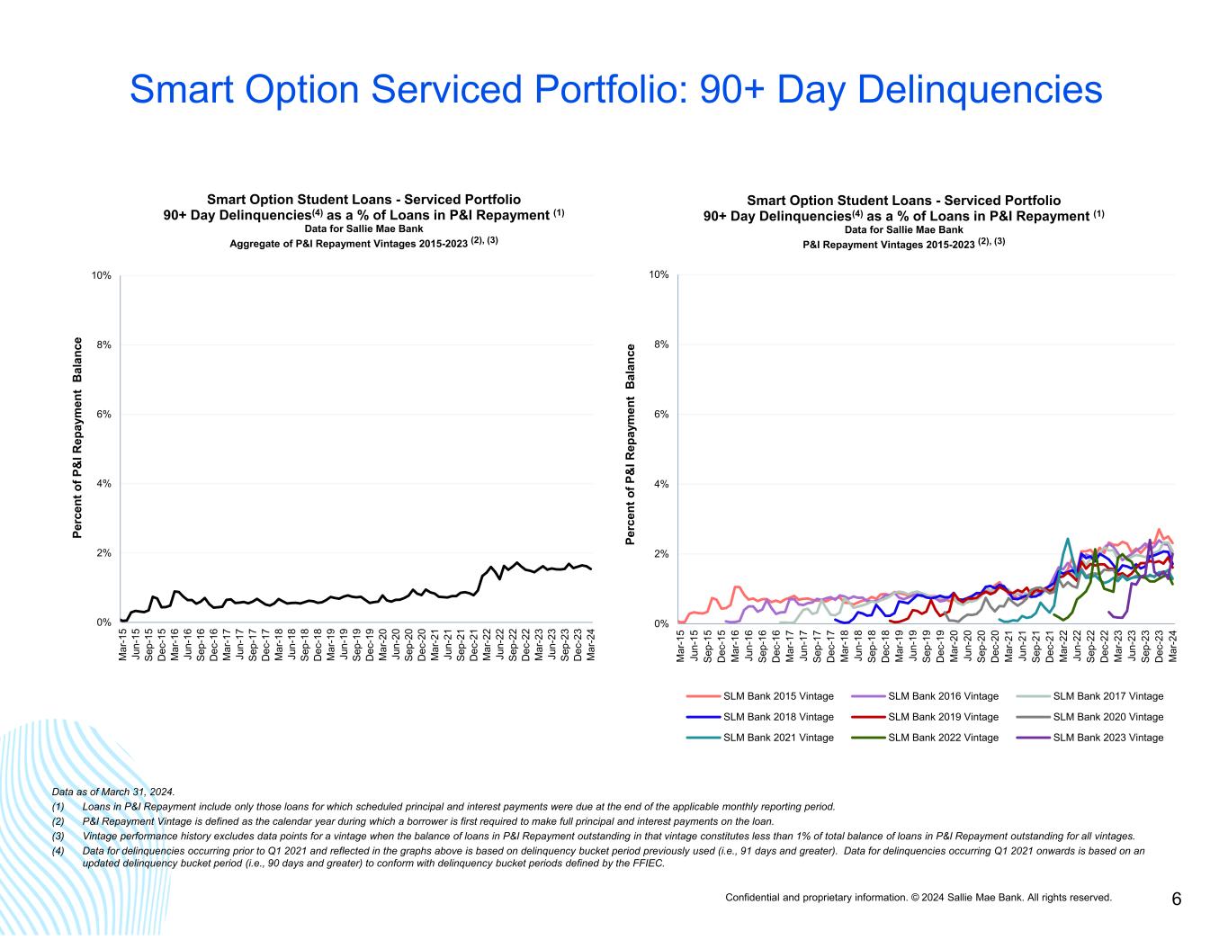 Confidential and proprietary information. © 2024 Sallie Mae Bank. All rights reserved. 5 Smart Option Serviced Portfolio: 60-89 Day Delinquencies 0% 2% 4% 6% 8% 10% M ar -1 5 Ju n- 15 Se p- 15 D ec -1 5 M ar -1 6 Ju n- 16 Se p- 16 D ec -1 6 M ar -1 7 Ju n- 17 Se p- 17 D ec -1 7 M ar -1 8 Ju n- 18 Se p- 18 D ec -1 8 M ar -1 9 Ju n- 19 Se p- 19 D ec -1 9 M ar -2 0 Ju n- 20 Se p- 20 D ec -2 0 M ar -2 1 Ju n- 21 Se p- 21 D ec -2 1 M ar -2 2 Ju n- 22 Se p- 22 D ec -2 2 M ar -2 3 Ju n- 23 Se p- 23 D ec -2 3 M ar -2 4 Pe rc en t o f P & I R ep ay m en t B al an ce Smart Option Student Loans - Serviced Portfolio 60-89 Day Delinquencies(4) as a % of Loans in P&I Repayment (1) Data for Sallie Mae Bank Aggregate of P&I Repayment Vintages 2015-2023 (2), (3) 0% 2% 4% 6% 8% 10% M ar -1 5 Ju n- 15 Se p- 15 D ec -1 5 M ar -1 6 Ju n- 16 Se p- 16 D ec -1 6 M ar -1 7 Ju n- 17 Se p- 17 D ec -1 7 M ar -1 8 Ju n- 18 Se p- 18 D ec -1 8 M ar -1 9 Ju n- 19 Se p- 19 D ec -1 9 M ar -2 0 Ju n- 20 Se p- 20 D ec -2 0 M ar -2 1 Ju n- 21 Se p- 21 D ec -2 1 M ar -2 2 Ju n- 22 Se p- 22 D ec -2 2 M ar -2 3 Ju n- 23 Se p- 23 D ec -2 3 M ar -2 4 Pe rc en t o f P & I R ep ay m en t B al an ce Smart Option Student Loans - Serviced Portfolio 60-89 Day Delinquencies(4) as a % of Loans in P&I Repayment (1) Data for Sallie Mae Bank P&I Repayment Vintages 2015-2023 (2), (3) SLM Bank 2015 Vintage SLM Bank 2016 Vintage SLM Bank 2017 Vintage SLM Bank 2018 Vintage SLM Bank 2019 Vintage SLM Bank 2020 Vintage SLM Bank 2021 Vintage SLM Bank 2022 Vintage SLM Bank 2023 Vintage Data as of March 31, 2024. (1) Loans in P&I Repayment include only those loans for which scheduled principal and interest payments were due at the end of the applicable monthly reporting period. (2) P&I Repayment Vintage is defined as the calendar year during which a borrower is first required to make full principal and interest payments on the loan. (3) Vintage performance history excludes data points for a vintage when the balance of loans in P&I Repayment outstanding in that vintage constitutes less than 1% of total balance of loans in P&I Repayment outstanding for all vintages. (4) Data for delinquencies occurring prior to Q1 2021 and reflected in the graphs above is based on delinquency bucket period previously used (i.e., 61-90 days). Data for delinquencies occurring Q1 2021 onwards is based on an updated delinquency bucket period (i.e., 60-89 days) to conform with delinquency bucket periods defined by the FFIEC.