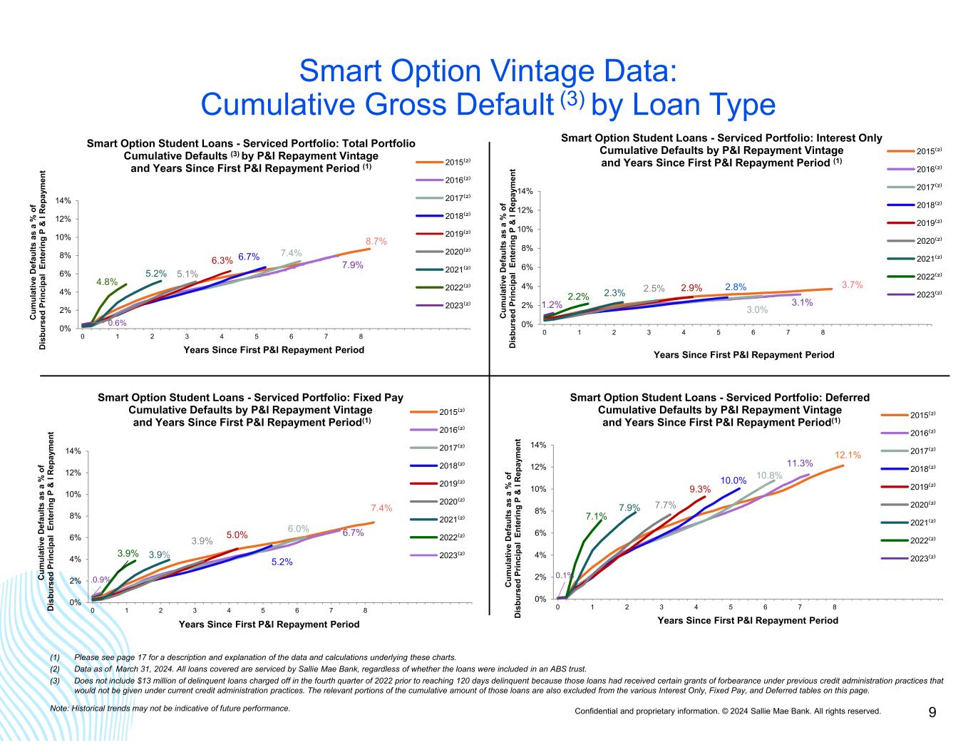 Confidential and proprietary information. © 2024 Sallie Mae Bank. All rights reserved. 8 Smart Option Serviced Portfolio: Annualized Gross Defaults Data as of March 31, 2024. (1) Loans in P&I Repayment include only those loans for which scheduled principal and interest payments were due at the end of the applicable monthly reporting period. (2) P&I Repayment Vintage is defined as the calendar year during which a borrower is first required to make full principal and interest payments on the loan. (3) Vintage performance history excludes data points for a vintage when the balance of loans in P&I Repayment outstanding in that vintage constitutes less than 1% of total balance of loans in P&I Repayment outstanding for all vintages. (4) Does not include $13 million of delinquent loans charged off in the fourth quarter of 2022 prior to reaching 120 days of delinquency because those loans had received certain grants of forbearance under previous credit administration practices that would not be given under current credit administration practices. 0% 2% 4% 6% 8% 10% 12% M ar -1 5 Ju n- 15 Se p- 15 D ec -1 5 M ar -1 6 Ju n- 16 Se p- 16 D ec -1 6 M ar -1 7 Ju n- 17 Se p- 17 D ec -1 7 M ar -1 8 Ju n- 18 Se p- 18 D ec -1 8 M ar -1 9 Ju n- 19 Se p- 19 D ec -1 9 M ar -2 0 Ju n- 20 Se p- 20 D ec -2 0 M ar -2 1 Ju n- 21 Se p- 21 D ec -2 1 M ar -2 2 Ju n- 22 Se p- 22 D ec -2 2 M ar -2 3 Ju n- 23 Se p- 23 D ec -2 3 M ar -2 4 Pe rc en t o f P & I R ep ay m en t B al an ce Smart Option Student Loans - Serviced Portfolio Annualized Gross Defaults (4) as a % of Loans in P&I Repayment(1) Data for Sallie Mae Bank Aggregate of P&I Repayment Vintages 2015-2023 (2), (3) 0% 2% 4% 6% 8% 10% 12% M ar -1 5 Ju n- 15 Se p- 15 D ec -1 5 M ar -1 6 Ju n- 16 Se p- 16 D ec -1 6 M ar -1 7 Ju n- 17 Se p- 17 D ec -1 7 M ar -1 8 Ju n- 18 Se p- 18 D ec -1 8 M ar -1 9 Ju n- 19 Se p- 19 D ec -1 9 M ar -2 0 Ju n- 20 Se p- 20 D ec -2 0 M ar -2 1 Ju n- 21 Se p- 21 D ec -2 1 M ar -2 2 Ju n- 22 Se p- 22 D ec -2 2 M ar -2 3 Ju n- 23 Se p- 23 D ec -2 3 M ar -2 4 Pe rc en t o f P & I R ep ay m en t B al an ce Smart Option Student Loans - Serviced Portfolio Annualized Gross Defaults (4) as a % of Loans in P&I Repayment(1) Data for Sallie Mae Bank P&I Repayment Vintages 2015-2023 (2), (3) SLM Bank 2015 Vintage SLM Bank 2016 Vintage SLM Bank 2017 Vintage SLM Bank 2018 Vintage SLM Bank 2019 Vintage SLM Bank 2020 Vintage SLM Bank 2021 Vintage SLM Bank 2022 Vintage SLM Bank 2023 Vintage