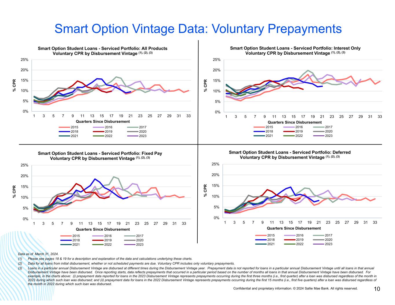 Confidential and proprietary information. © 2024 Sallie Mae Bank. All rights reserved. 9 Smart Option Vintage Data: Cumulative Gross Default (3) by Loan Type 3.7% 3.1% 3.0% 2.8% 2.9% 2.5% 2.3%2.2% 1.2% 0% 2% 4% 6% 8% 10% 12% 14% 0 1 2 3 4 5 6 7 8 C um ul at iv e D ef au lts a s a % o f D is bu rs ed P rin ci pa l En te rin g P & I R ep ay m en t Years Since First P&I Repayment Period Smart Option Student Loans - Serviced Portfolio: Interest Only Cumulative Defaults by P&I Repayment Vintage and Years Since First P&I Repayment Period (1) 2015⁽²⁾ 2016⁽²⁾ 2017⁽²⁾ 2018⁽²⁾ 2019⁽²⁾ 2020⁽²⁾ 2021⁽²⁾ 2022⁽²⁾ 2023⁽²⁾ 7.4% 6.7%6.0% 5.2% 5.0%3.9% 3.9%3.9% .0.9% 0% 2% 4% 6% 8% 10% 12% 14% 0 1 2 3 4 5 6 7 8 C um ul at iv e D ef au lts a s a % o f D is bu rs ed P rin ci pa l En te rin g P & I R ep ay m en t Years Since First P&I Repayment Period Smart Option Student Loans - Serviced Portfolio: Fixed Pay Cumulative Defaults by P&I Repayment Vintage and Years Since First P&I Repayment Period(1) 2015⁽²⁾ 2016⁽²⁾ 2017⁽²⁾ 2018⁽²⁾ 2019⁽²⁾ 2020⁽²⁾ 2021⁽²⁾ 2022⁽²⁾ 2023⁽²⁾ 12.1% 11.3% 10.8%10.0% 9.3% 7.7%7.9% 7.1% 0.1% 0% 2% 4% 6% 8% 10% 12% 14% 0 1 2 3 4 5 6 7 8 C um ul at iv e D ef au lts a s a % o f D is bu rs ed P rin ci pa l En te rin g P & I R ep ay m en t Years Since First P&I Repayment Period Smart Option Student Loans - Serviced Portfolio: Deferred Cumulative Defaults by P&I Repayment Vintage and Years Since First P&I Repayment Period(1) 2015⁽²⁾ 2016⁽²⁾ 2017⁽²⁾ 2018⁽²⁾ 2019⁽²⁾ 2020⁽²⁾ 2021⁽²⁾ 2022⁽²⁾ 2023⁽²⁾ (1) Please see page 17 for a description and explanation of the data and calculations underlying these charts. (2) Data as of March 31, 2024. All loans covered are serviced by Sallie Mae Bank, regardless of whether the loans were included in an ABS trust. (3) Does not include $13 million of delinquent loans charged off in the fourth quarter of 2022 prior to reaching 120 days delinquent because those loans had received certain grants of forbearance under previous credit administration practices that would not be given under current credit administration practices. The relevant portions of the cumulative amount of those loans are also excluded from the various Interest Only, Fixed Pay, and Deferred tables on this page. Note: Historical trends may not be indicative of future performance. 8.7% 7.9% 7.4%6.7%6.3% 5.1%5.2% 4.8% 0.6% 0% 2% 4% 6% 8% 10% 12% 14% 0 1 2 3 4 5 6 7 8 C um ul at iv e D ef au lts a s a % o f D is bu rs ed P rin ci pa l En te rin g P & I R ep ay m en t Years Since First P&I Repayment Period Smart Option Student Loans - Serviced Portfolio: Total Portfolio Cumulative Defaults (3) by P&I Repayment Vintage and Years Since First P&I Repayment Period (1) 2015⁽²⁾ 2016⁽²⁾ 2017⁽²⁾ 2018⁽²⁾ 2019⁽²⁾ 2020⁽²⁾ 2021⁽²⁾ 2022⁽²⁾ 2023⁽²⁾