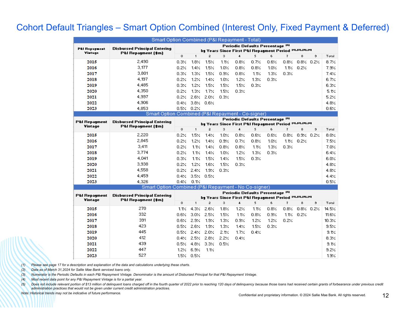 Confidential and proprietary information. © 2024 Sallie Mae Bank. All rights reserved. 11 Smart Option Vintage Data: Total Prepayments ► Following the initial few years after disbursement, total prepayments begin to rise more quickly as loans begin to default. Data as of March 31, 2024. (1) Please see pages 18 & 19 for a description and explanation of the data and calculations underlying these charts. (2) Data for all loans from initial disbursement, whether or not scheduled payments are due. (3) Loans in a particular annual Disbursement Vintage are disbursed at different times during the Disbursement Vintage year. Prepayment data is not reported for loans in a particular annual Disbursement Vintage until all loans in that annual Disbursement Vintage have been disbursed. Once reporting starts, data reflects prepayments that occurred in a particular period based on the number of months all loans in that annual Disbursement Vintage have been disbursed. For example, in the charts above: (i) prepayment data reported for loans in the 2023 Disbursement Vintage represents prepayments occurring during the first three months (i.e., first quarter) after a loan was disbursed regardless of the month in 2023 during which such loan was disbursed; and (ii) prepayment data for loans in the 2022 Disbursement Vintage represents prepayments occurring during the first 15 months (i.e., first five quarters) after a loan was disbursed regardless of the month in 2022 during which such loan was disbursed. 0% 5% 10% 15% 20% 25% 1 3 5 7 9 11 13 15 17 19 21 23 25 27 29 31 33 % C PR Quarters Since Disbursement Smart Option Student Loans - Serviced Portfolio: All Products Total CPR by Disbursement Vintage (1), (2), (3) 2015 2016 2017 2018 2019 2020 2021 2022 2023 0% 5% 10% 15% 20% 25% 1 3 5 7 9 11 13 15 17 19 21 23 25 27 29 31 33 % C PR Quarters Since Disbursement Smart Option Student Loans - Serviced Portfolio: Fixed Pay Total CPR by Disbursement Vintage (1), (2), (3) 2015 2016 2017 2018 2019 2020 2021 2022 2023 0% 5% 10% 15% 20% 25% 1 3 5 7 9 11 13 15 17 19 21 23 25 27 29 31 33 % C PR Quarters Since Disbursement Smart Option Student Loans - Serviced Portfolio: Deferred Total CPR by Disbursement Vintage (1), (2), (3) 2015 2016 2017 2018 2019 2020 2021 2022 2023 0% 5% 10% 15% 20% 25% 1 3 5 7 9 11 13 15 17 19 21 23 25 27 29 31 33 % C PR Quarters Since Disbursement Smart Option Student Loans - Serviced Portfolio: Interest Only Total CPR by Disbursement Vintage (1), (2), (3) 2015 2016 2017 2018 2019 2020 2021 2022 2023