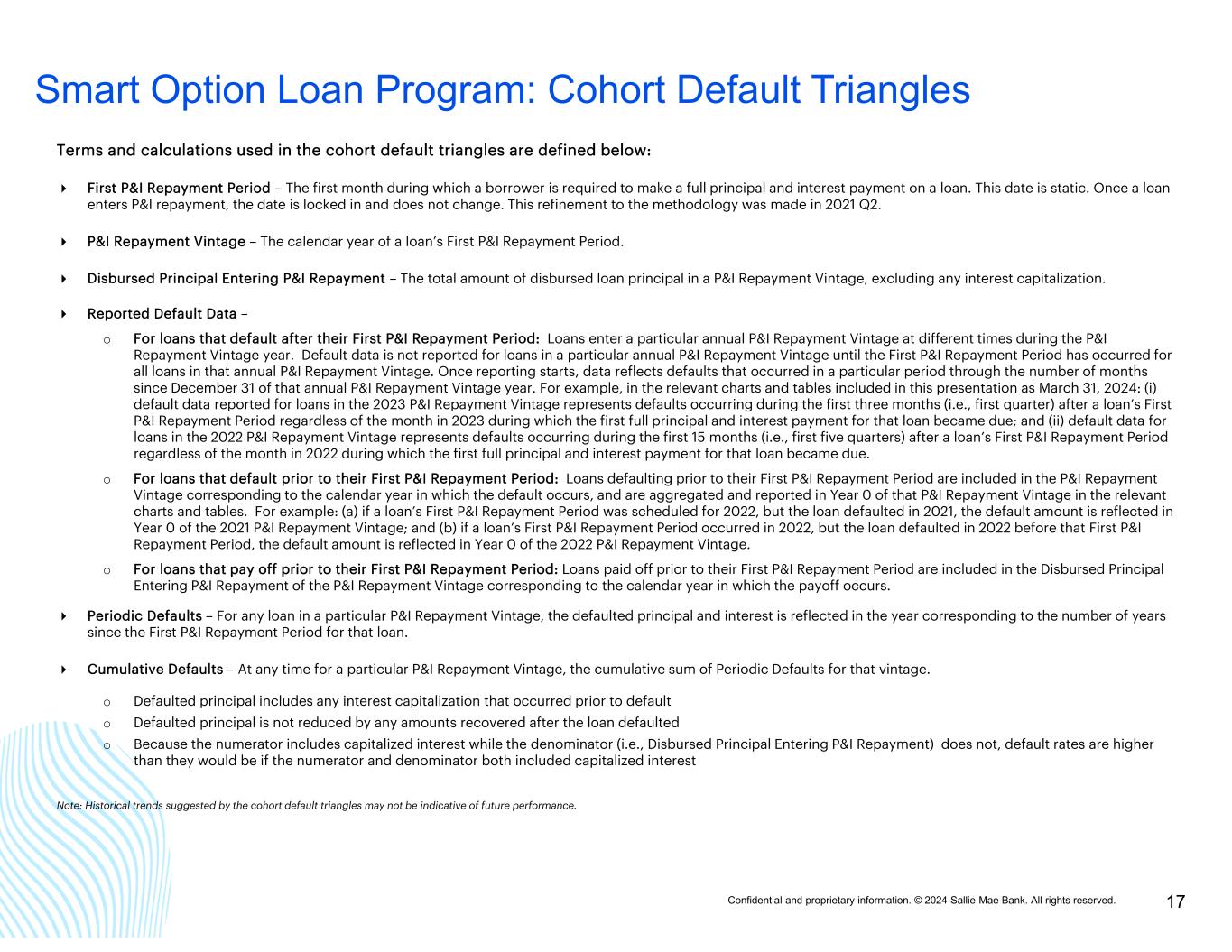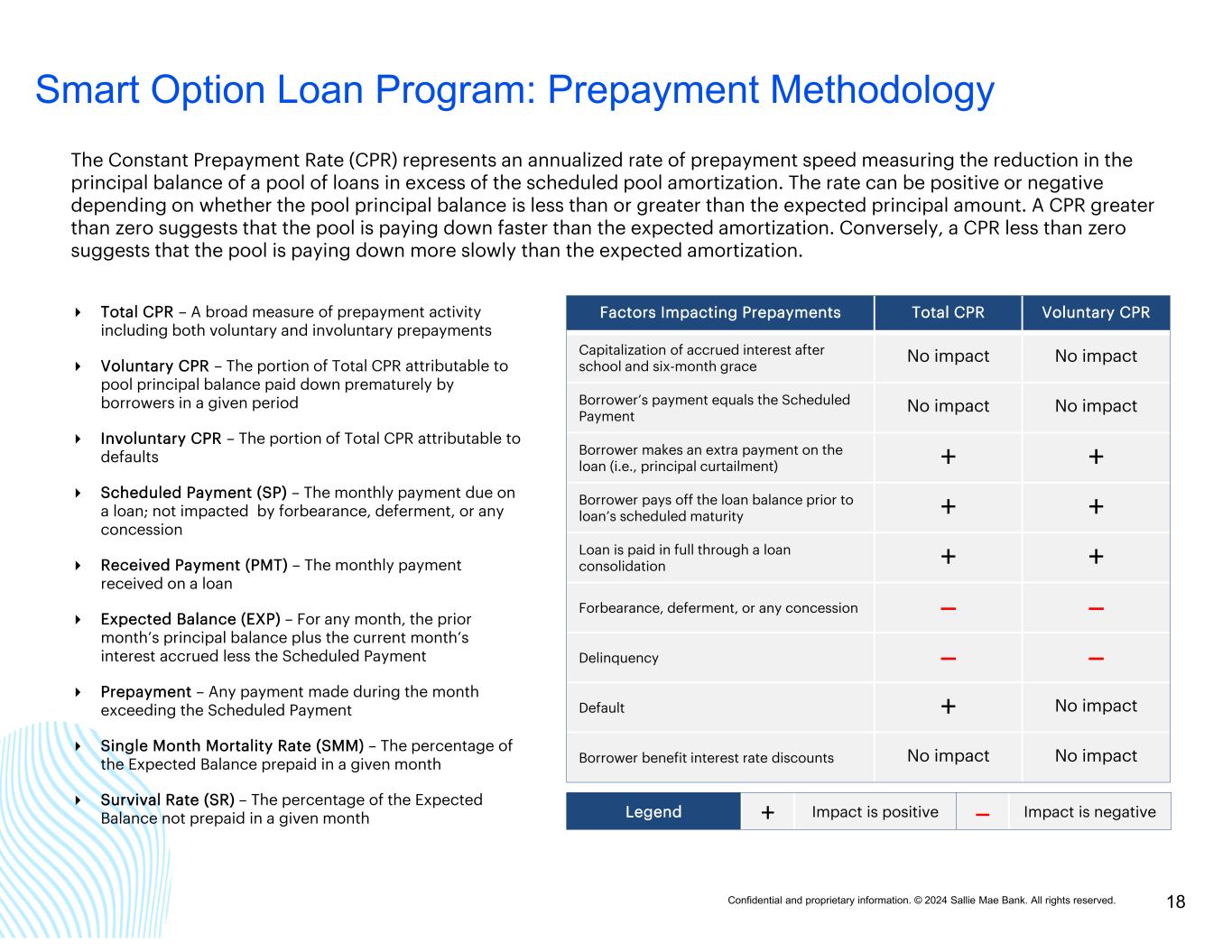 Confidential and proprietary information. © 2024 Sallie Mae Bank. All rights reserved. 17 Smart Option Loan Program: Cohort Default Triangles Terms and calculations used in the cohort default triangles are defined below: First P&I Repayment Period – The first month during which a borrower is required to make a full principal and interest payment on a loan. This date is static. Once a loan enters P&I repayment, the date is locked in and does not change. This refinement to the methodology was made in 2021 Q2. P&I Repayment Vintage – The calendar year of a loan’s First P&I Repayment Period. Disbursed Principal Entering P&I Repayment – The total amount of disbursed loan principal in a P&I Repayment Vintage, excluding any interest capitalization. Reported Default Data – o For loans that default after their First P&I Repayment Period: Loans enter a particular annual P&I Repayment Vintage at different times during the P&I Repayment Vintage year. Default data is not reported for loans in a particular annual P&I Repayment Vintage until the First P&I Repayment Period has occurred for all loans in that annual P&I Repayment Vintage. Once reporting starts, data reflects defaults that occurred in a particular period through the number of months since December 31 of that annual P&I Repayment Vintage year. For example, in the relevant charts and tables included in this presentation as March 31, 2024: (i) default data reported for loans in the 2023 P&I Repayment Vintage represents defaults occurring during the first three months (i.e., first quarter) after a loan’s First P&I Repayment Period regardless of the month in 2023 during which the first full principal and interest payment for that loan became due; and (ii) default data for loans in the 2022 P&I Repayment Vintage represents defaults occurring during the first 15 months (i.e., first five quarters) after a loan’s First P&I Repayment Period regardless of the month in 2022 during which the first full principal and interest payment for that loan became due. o For loans that default prior to their First P&I Repayment Period: Loans defaulting prior to their First P&I Repayment Period are included in the P&I Repayment Vintage corresponding to the calendar year in which the default occurs, and are aggregated and reported in Year 0 of that P&I Repayment Vintage in the relevant charts and tables. For example: (a) if a loan’s First P&I Repayment Period was scheduled for 2022, but the loan defaulted in 2021, the default amount is reflected in Year 0 of the 2021 P&I Repayment Vintage; and (b) if a loan’s First P&I Repayment Period occurred in 2022, but the loan defaulted in 2022 before that First P&I Repayment Period, the default amount is reflected in Year 0 of the 2022 P&I Repayment Vintage. o For loans that pay off prior to their First P&I Repayment Period: Loans paid off prior to their First P&I Repayment Period are included in the Disbursed Principal Entering P&I Repayment of the P&I Repayment Vintage corresponding to the calendar year in which the payoff occurs. Periodic Defaults – For any loan in a particular P&I Repayment Vintage, the defaulted principal and interest is reflected in the year corresponding to the number of years since the First P&I Repayment Period for that loan. Cumulative Defaults – At any time for a particular P&I Repayment Vintage, the cumulative sum of Periodic Defaults for that vintage. o Defaulted principal includes any interest capitalization that occurred prior to default o Defaulted principal is not reduced by any amounts recovered after the loan defaulted o Because the numerator includes capitalized interest while the denominator (i.e., Disbursed Principal Entering P&I Repayment) does not, default rates are higher than they would be if the numerator and denominator both included capitalized interest Note: Historical trends suggested by the cohort default triangles may not be indicative of future performance.