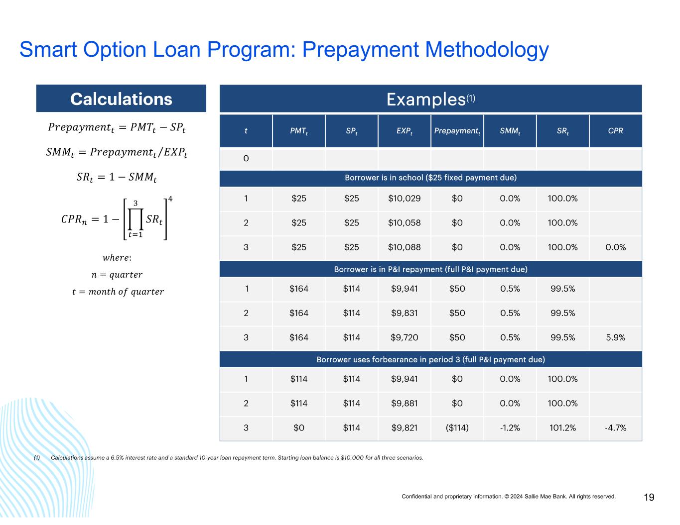 Confidential and proprietary information. © 2024 Sallie Mae Bank. All rights reserved. 18 Smart Option Loan Program: Prepayment Methodology Impact is negative–Impact is positive+Legend The Constant Prepayment Rate (CPR) represents an annualized rate of prepayment speed measuring the reduction in the principal balance of a pool of loans in excess of the scheduled pool amortization. The rate can be positive or negative depending on whether the pool principal balance is less than or greater than the expected principal amount. A CPR greater than zero suggests that the pool is paying down faster than the expected amortization. Conversely, a CPR less than zero suggests that the pool is paying down more slowly than the expected amortization. Total CPR – A broad measure of prepayment activity including both voluntary and involuntary prepayments Voluntary CPR – The portion of Total CPR attributable to pool principal balance paid down prematurely by borrowers in a given period Involuntary CPR – The portion of Total CPR attributable to defaults Scheduled Payment (SP) – The monthly payment due on a loan; not impacted by forbearance, deferment, or any concession Received Payment (PMT) – The monthly payment received on a loan Expected Balance (EXP) – For any month, the prior month’s principal balance plus the current month’s interest accrued less the Scheduled Payment Prepayment – Any payment made during the month exceeding the Scheduled Payment Single Month Mortality Rate (SMM) – The percentage of the Expected Balance prepaid in a given month Survival Rate (SR) – The percentage of the Expected Balance not prepaid in a given month Voluntary CPRTotal CPRFactors Impacting Prepayments No impactNo impactCapitalization of accrued interest after school and six-month grace No impactNo impactBorrower’s payment equals the Scheduled Payment ++Borrower makes an extra payment on the loan (i.e., principal curtailment) ++Borrower pays off the loan balance prior to loan’s scheduled maturity ++Loan is paid in full through a loan consolidation ––Forbearance, deferment, or any concession ––Delinquency No impact+Default No impactNo impactBorrower benefit interest rate discounts