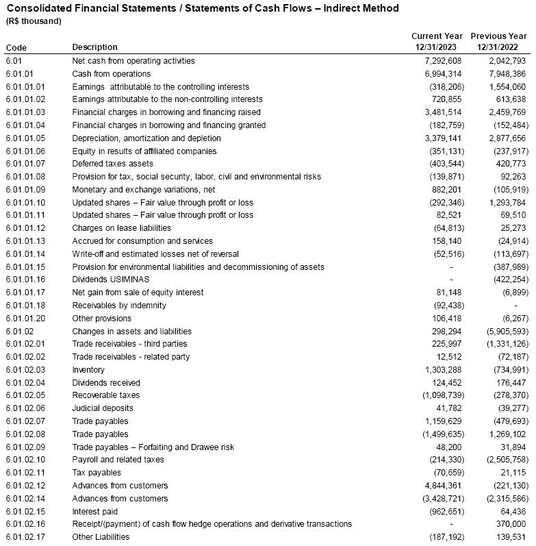 The members of the Fiscal Council of Companhia Siderúrgica Nacional, in compliance with the legal provisions of art. 163 of the Law 6404/76 and in the performance of its legal and statutory duties, met and examined (i) the Management Report; (ii) the Financial Statements for the Fiscal Year ended 2023; and (iii) the Allocation of Results for 2023 and, in clarifications provided by the Company's Board of Executive Officers and the independent auditors, Mazars Auditores Independentes, as well as the information and clarifications received during the financial year, unanimously, they gave their favorable opinion regarding these documents and advise their approval at the Company's Annual General Shareholders' Meeting.