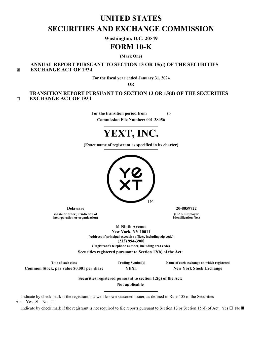 UNITED STATES SECURITIES AND EXCHANGE COMMISSION Washington, D.C. 20549 FORM 10-K (Mark One) ☒ ANNUAL REPORT PURSUANT TO SECTION 13 OR 15(d) OF THE SECURITIES EXCHANGE ACT OF 1934 For the fiscal year ended January 31, 2024 OR ☐ TRANSITION REPORT PURSUANT TO SECTION 13 OR 15(d) OF THE SECURITIES EXCHANGE ACT OF 1934 For the transition period from to Commission File Number: 001-38056 YEXT, INC. (Exact name of registrant as specified in its charter) Delaware 20-8059722 (State or other jurisdiction of incorporation or organization) (I.R.S. Employer Identification No.) 61 Ninth Avenue New York, NY 10011 (Address of principal executive offices, including zip code) (212) 994-3900 (Registrant's telephone number, including area code) Securities registered pursuant to Section 12(b) of the Act: Title of each class Trading Symbol(s) Name of each exchange on which registered Common Stock, par value $0.001 per share YEXT New York Stock Exchange Securities registered pursuant to section 12(g) of the Act: Not applicable Indicate by check mark if the registrant is a well-known seasoned issuer, as defined in Rule 405 of the Securities Act. Yes ☒ No ☐ Indicate by check mark if the registrant is not required to file reports pursuant to Section 13 or Section 15(d) of Act. Yes ☐ No ☒
