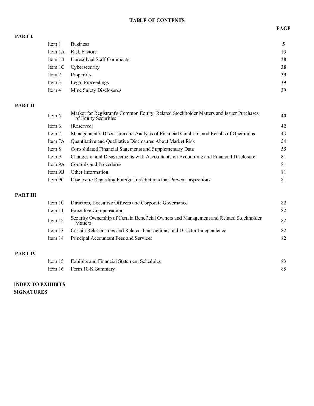 TABLE OF CONTENTS PART I. Item 1 Business 5 Item 1A Risk Factors 13 Item 1B Unresolved Staff Comments 38 Item 1C Cybersecurity 38 Item 2 Properties 39 Item 3 Legal Proceedings 39 Item 4 Mine Safety Disclosures 39 PART II Item 5 Market for Registrant's Common Equity, Related Stockholder Matters and Issuer Purchases of Equity Securities 40 Item 6 [Reserved] 42 Item 7 Management’s Discussion and Analysis of Financial Condition and Results of Operations 43 Item 7A Quantitative and Qualitative Disclosures About Market Risk 54 Item 8 Consolidated Financial Statements and Supplementary Data 55 Item 9 Changes in and Disagreements with Accountants on Accounting and Financial Disclosure 81 Item 9A Controls and Procedures 81 Item 9B Other Information 81 Item 9C Disclosure Regarding Foreign Jurisdictions that Prevent Inspections 81 PART III Item 10 Directors, Executive Officers and Corporate Governance 82 Item 11 Executive Compensation 82 Item 12 Security Ownership of Certain Beneficial Owners and Management and Related Stockholder Matters 82 Item 13 Certain Relationships and Related Transactions, and Director Independence 82 Item 14 Principal Accountant Fees and Services 82 PART IV Item 15 Exhibits and Financial Statement Schedules 83 Item 16 Form 10-K Summary 85 INDEX TO EXHIBITS SIGNATURES PAGE