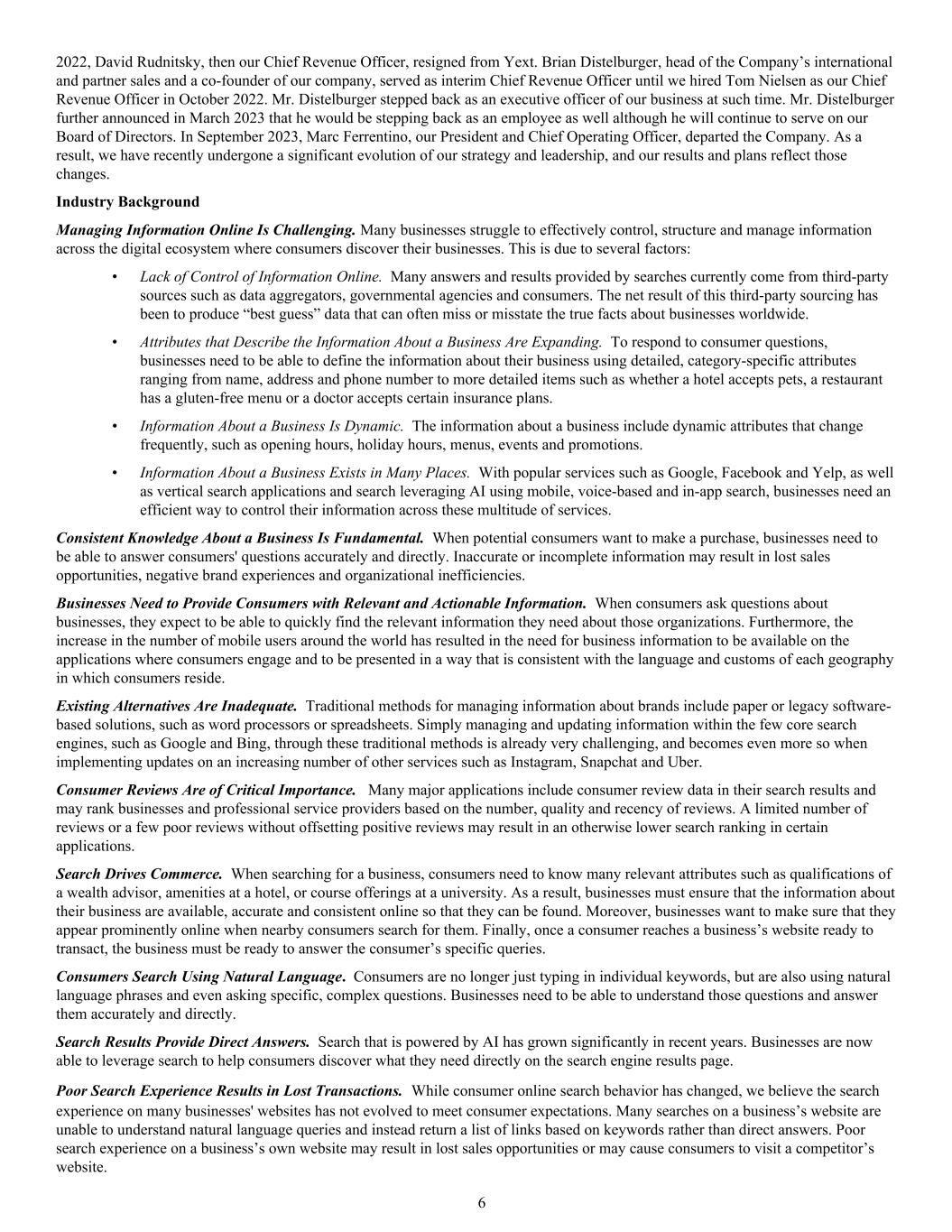 2022, David Rudnitsky, then our Chief Revenue Officer, resigned from Yext. Brian Distelburger, head of the Company’s international and partner sales and a co-founder of our company, served as interim Chief Revenue Officer until we hired Tom Nielsen as our Chief Revenue Officer in October 2022. Mr. Distelburger stepped back as an executive officer of our business at such time. Mr. Distelburger further announced in March 2023 that he would be stepping back as an employee as well although he will continue to serve on our Board of Directors. In September 2023, Marc Ferrentino, our President and Chief Operating Officer, departed the Company. As a result, we have recently undergone a significant evolution of our strategy and leadership, and our results and plans reflect those changes. Industry Background Managing Information Online Is Challenging. Many businesses struggle to effectively control, structure and manage information across the digital ecosystem where consumers discover their businesses. This is due to several factors: • Lack of Control of Information Online. Many answers and results provided by searches currently come from third-party sources such as data aggregators, governmental agencies and consumers. The net result of this third-party sourcing has been to produce “best guess” data that can often miss or misstate the true facts about businesses worldwide. • Attributes that Describe the Information About a Business Are Expanding. To respond to consumer questions, businesses need to be able to define the information about their business using detailed, category-specific attributes ranging from name, address and phone number to more detailed items such as whether a hotel accepts pets, a restaurant has a gluten-free menu or a doctor accepts certain insurance plans. • Information About a Business Is Dynamic. The information about a business include dynamic attributes that change frequently, such as opening hours, holiday hours, menus, events and promotions. • Information About a Business Exists in Many Places. With popular services such as Google, Facebook and Yelp, as well as vertical search applications and search leveraging AI using mobile, voice-based and in-app search, businesses need an efficient way to control their information across these multitude of services. Consistent Knowledge About a Business Is Fundamental. When potential consumers want to make a purchase, businesses need to be able to answer consumers' questions accurately and directly. Inaccurate or incomplete information may result in lost sales opportunities, negative brand experiences and organizational inefficiencies. Businesses Need to Provide Consumers with Relevant and Actionable Information. When consumers ask questions about businesses, they expect to be able to quickly find the relevant information they need about those organizations. Furthermore, the increase in the number of mobile users around the world has resulted in the need for business information to be available on the applications where consumers engage and to be presented in a way that is consistent with the language and customs of each geography in which consumers reside. Existing Alternatives Are Inadequate. Traditional methods for managing information about brands include paper or legacy software- based solutions, such as word processors or spreadsheets. Simply managing and updating information within the few core search engines, such as Google and Bing, through these traditional methods is already very challenging, and becomes even more so when implementing updates on an increasing number of other services such as Instagram, Snapchat and Uber. Consumer Reviews Are of Critical Importance. Many major applications include consumer review data in their search results and may rank businesses and professional service providers based on the number, quality and recency of reviews. A limited number of reviews or a few poor reviews without offsetting positive reviews may result in an otherwise lower search ranking in certain applications. Search Drives Commerce. When searching for a business, consumers need to know many relevant attributes such as qualifications of a wealth advisor, amenities at a hotel, or course offerings at a university. As a result, businesses must ensure that the information about their business are available, accurate and consistent online so that they can be found. Moreover, businesses want to make sure that they appear prominently online when nearby consumers search for them. Finally, once a consumer reaches a business’s website ready to transact, the business must be ready to answer the consumer’s specific queries. Consumers Search Using Natural Language. Consumers are no longer just typing in individual keywords, but are also using natural language phrases and even asking specific, complex questions. Businesses need to be able to understand those questions and answer them accurately and directly. Search Results Provide Direct Answers. Search that is powered by AI has grown significantly in recent years. Businesses are now able to leverage search to help consumers discover what they need directly on the search engine results page. Poor Search Experience Results in Lost Transactions. While consumer online search behavior has changed, we believe the search experience on many businesses' websites has not evolved to meet consumer expectations. Many searches on a business’s website are unable to understand natural language queries and instead return a list of links based on keywords rather than direct answers. Poor search experience on a business’s own website may result in lost sales opportunities or may cause consumers to visit a competitor’s website. 6
