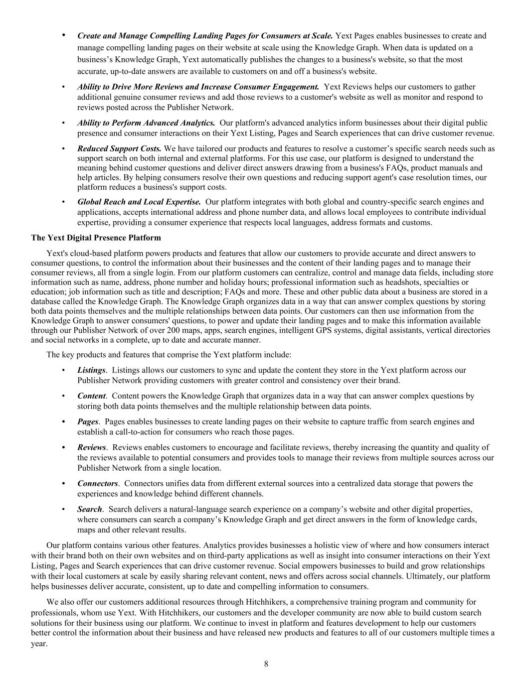 • Create and Manage Compelling Landing Pages for Consumers at Scale. Yext Pages enables businesses to create and manage compelling landing pages on their website at scale using the Knowledge Graph. When data is updated on a business’s Knowledge Graph, Yext automatically publishes the changes to a business's website, so that the most accurate, up-to-date answers are available to customers on and off a business's website. • Ability to Drive More Reviews and Increase Consumer Engagement. Yext Reviews helps our customers to gather additional genuine consumer reviews and add those reviews to a customer's website as well as monitor and respond to reviews posted across the Publisher Network. • Ability to Perform Advanced Analytics. Our platform's advanced analytics inform businesses about their digital public presence and consumer interactions on their Yext Listing, Pages and Search experiences that can drive customer revenue. • Reduced Support Costs. We have tailored our products and features to resolve a customer’s specific search needs such as support search on both internal and external platforms. For this use case, our platform is designed to understand the meaning behind customer questions and deliver direct answers drawing from a business's FAQs, product manuals and help articles. By helping consumers resolve their own questions and reducing support agent's case resolution times, our platform reduces a business's support costs. • Global Reach and Local Expertise. Our platform integrates with both global and country-specific search engines and applications, accepts international address and phone number data, and allows local employees to contribute individual expertise, providing a consumer experience that respects local languages, address formats and customs. The Yext Digital Presence Platform Yext's cloud-based platform powers products and features that allow our customers to provide accurate and direct answers to consumer questions, to control the information about their businesses and the content of their landing pages and to manage their consumer reviews, all from a single login. From our platform customers can centralize, control and manage data fields, including store information such as name, address, phone number and holiday hours; professional information such as headshots, specialties or education; job information such as title and description; FAQs and more. These and other public data about a business are stored in a database called the Knowledge Graph. The Knowledge Graph organizes data in a way that can answer complex questions by storing both data points themselves and the multiple relationships between data points. Our customers can then use information from the Knowledge Graph to answer consumers' questions, to power and update their landing pages and to make this information available through our Publisher Network of over 200 maps, apps, search engines, intelligent GPS systems, digital assistants, vertical directories and social networks in a complete, up to date and accurate manner. The key products and features that comprise the Yext platform include: • Listings. Listings allows our customers to sync and update the content they store in the Yext platform across our Publisher Network providing customers with greater control and consistency over their brand. • Content. Content powers the Knowledge Graph that organizes data in a way that can answer complex questions by storing both data points themselves and the multiple relationship between data points. • Pages. Pages enables businesses to create landing pages on their website to capture traffic from search engines and establish a call-to-action for consumers who reach those pages. • Reviews. Reviews enables customers to encourage and facilitate reviews, thereby increasing the quantity and quality of the reviews available to potential consumers and provides tools to manage their reviews from multiple sources across our Publisher Network from a single location. • Connectors. Connectors unifies data from different external sources into a centralized data storage that powers the experiences and knowledge behind different channels. • Search. Search delivers a natural-language search experience on a company’s website and other digital properties, where consumers can search a company’s Knowledge Graph and get direct answers in the form of knowledge cards, maps and other relevant results. Our platform contains various other features. Analytics provides businesses a holistic view of where and how consumers interact with their brand both on their own websites and on third-party applications as well as insight into consumer interactions on their Yext Listing, Pages and Search experiences that can drive customer revenue. Social empowers businesses to build and grow relationships with their local customers at scale by easily sharing relevant content, news and offers across social channels. Ultimately, our platform helps businesses deliver accurate, consistent, up to date and compelling information to consumers. We also offer our customers additional resources through Hitchhikers, a comprehensive training program and community for professionals, whom use Yext. With Hitchhikers, our customers and the developer community are now able to build custom search solutions for their business using our platform. We continue to invest in platform and features development to help our customers better control the information about their business and have released new products and features to all of our customers multiple times a year. 8