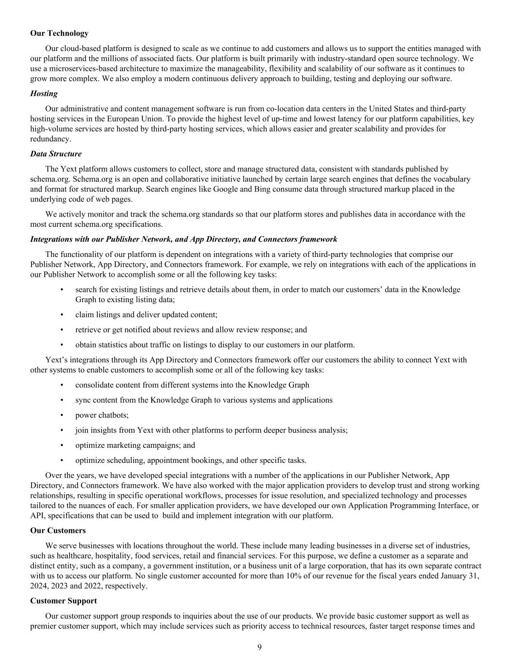 Our Technology Our cloud-based platform is designed to scale as we continue to add customers and allows us to support the entities managed with our platform and the millions of associated facts. Our platform is built primarily with industry-standard open source technology. We use a microservices-based architecture to maximize the manageability, flexibility and scalability of our software as it continues to grow more complex. We also employ a modern continuous delivery approach to building, testing and deploying our software. Hosting Our administrative and content management software is run from co-location data centers in the United States and third-party hosting services in the European Union. To provide the highest level of up-time and lowest latency for our platform capabilities, key high-volume services are hosted by third-party hosting services, which allows easier and greater scalability and provides for redundancy. Data Structure The Yext platform allows customers to collect, store and manage structured data, consistent with standards published by schema.org. Schema.org is an open and collaborative initiative launched by certain large search engines that defines the vocabulary and format for structured markup. Search engines like Google and Bing consume data through structured markup placed in the underlying code of web pages. We actively monitor and track the schema.org standards so that our platform stores and publishes data in accordance with the most current schema.org specifications. Integrations with our Publisher Network, and App Directory, and Connectors framework The functionality of our platform is dependent on integrations with a variety of third-party technologies that comprise our Publisher Network, App Directory, and Connectors framework. For example, we rely on integrations with each of the applications in our Publisher Network to accomplish some or all the following key tasks: • search for existing listings and retrieve details about them, in order to match our customers’ data in the Knowledge Graph to existing listing data; • claim listings and deliver updated content; • retrieve or get notified about reviews and allow review response; and • obtain statistics about traffic on listings to display to our customers in our platform. Yext’s integrations through its App Directory and Connectors framework offer our customers the ability to connect Yext with other systems to enable customers to accomplish some or all of the following key tasks: • consolidate content from different systems into the Knowledge Graph • sync content from the Knowledge Graph to various systems and applications • power chatbots; • join insights from Yext with other platforms to perform deeper business analysis; • optimize marketing campaigns; and • optimize scheduling, appointment bookings, and other specific tasks. Over the years, we have developed special integrations with a number of the applications in our Publisher Network, App Directory, and Connectors framework. We have also worked with the major application providers to develop trust and strong working relationships, resulting in specific operational workflows, processes for issue resolution, and specialized technology and processes tailored to the nuances of each. For smaller application providers, we have developed our own Application Programming Interface, or API, specifications that can be used to build and implement integration with our platform. Our Customers We serve businesses with locations throughout the world. These include many leading businesses in a diverse set of industries, such as healthcare, hospitality, food services, retail and financial services. For this purpose, we define a customer as a separate and distinct entity, such as a company, a government institution, or a business unit of a large corporation, that has its own separate contract with us to access our platform. No single customer accounted for more than 10% of our revenue for the fiscal years ended January 31, 2024, 2023 and 2022, respectively. Customer Support Our customer support group responds to inquiries about the use of our products. We provide basic customer support as well as premier customer support, which may include services such as priority access to technical resources, faster target response times and 9