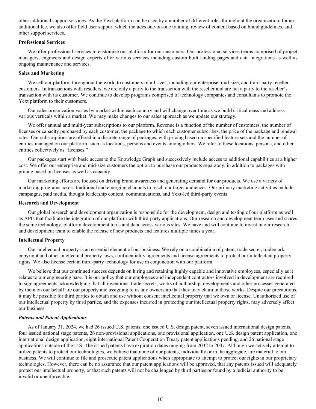 other additional support services. As the Yext platform can be used by a number of different roles throughout the organization, for an additional fee, we also offer field user support which includes one-on-one training, review of content based on brand guidelines, and other support services. Professional Services We offer professional services to customize our platform for our customers. Our professional services teams comprised of project managers, engineers and design experts offer various services including custom built landing pages and data integrations as well as ongoing maintenance and services. Sales and Marketing We sell our platform throughout the world to customers of all sizes, including our enterprise, mid-size, and third-party reseller customers. In transactions with resellers, we are only a party to the transaction with the reseller and are not a party to the reseller’s transaction with its customer. We continue to develop programs comprised of technology companies and consultants to promote the Yext platform to their customers. Our sales organization varies by market within each country and will change over time as we build critical mass and address various verticals within a market. We may make changes to our sales approach as we update our strategy. We offer annual and multi-year subscriptions to our platform. Revenue is a function of the number of customers, the number of licenses or capacity purchased by each customer, the package to which each customer subscribes, the price of the package and renewal rates. Our subscriptions are offered in a discrete range of packages, with pricing based on specified feature sets and the number of entities managed on our platform, such as locations, persons and events among others. We refer to these locations, persons, and other entities collectively as “licenses.” Our packages start with basic access to the Knowledge Graph and successively include access to additional capabilities at a higher cost. We offer our enterprise and mid-size customers the option to purchase our products separately, in addition to packages with pricing based on licenses as well as capacity. Our marketing efforts are focused on driving brand awareness and generating demand for our products. We use a variety of marketing programs across traditional and emerging channels to reach our target audiences. Our primary marketing activities include campaigns, paid media, thought leadership content, communications, and Yext-led third-party events. Research and Development Our global research and development organization is responsible for the development, design and testing of our platform as well as APIs that facilitate the integration of our platform with third-party applications. Our research and development team uses and shares the same technology, platform development tools and data across various sites. We have and will continue to invest in our research and development team to enable the release of new products and features multiple times a year. Intellectual Property Our intellectual property is an essential element of our business. We rely on a combination of patent, trade secret, trademark, copyright and other intellectual property laws, confidentiality agreements and license agreements to protect our intellectual property rights. We also license certain third-party technology for use in conjunction with our platform. We believe that our continued success depends on hiring and retaining highly capable and innovative employees, especially as it relates to our engineering base. It is our policy that our employees and independent contractors involved in development are required to sign agreements acknowledging that all inventions, trade secrets, works of authorship, developments and other processes generated by them on our behalf are our property and assigning to us any ownership that they may claim in those works. Despite our precautions, it may be possible for third parties to obtain and use without consent intellectual property that we own or license. Unauthorized use of our intellectual property by third parties, and the expenses incurred in protecting our intellectual property rights, may adversely affect our business. Patents and Patent Applications As of January 31, 2024, we had 26 issued U.S. patents, one issued U.S. design patent, seven issued international design patents, four issued national stage patents, 26 non-provisional applications, one provisional application, one U.S. design patent application, one international design application, eight international Patent Cooperation Treaty patent applications pending, and 26 national stage applications outside of the U.S. The issued patents have expiration dates ranging from 2032 to 2047. Although we actively attempt to utilize patents to protect our technologies, we believe that none of our patents, individually or in the aggregate, are material to our business. We will continue to file and prosecute patent applications when appropriate to attempt to protect our rights in our proprietary technologies. However, there can be no assurance that our patent applications will be approved, that any patents issued will adequately protect our intellectual property, or that such patents will not be challenged by third parties or found by a judicial authority to be invalid or unenforceable. 10