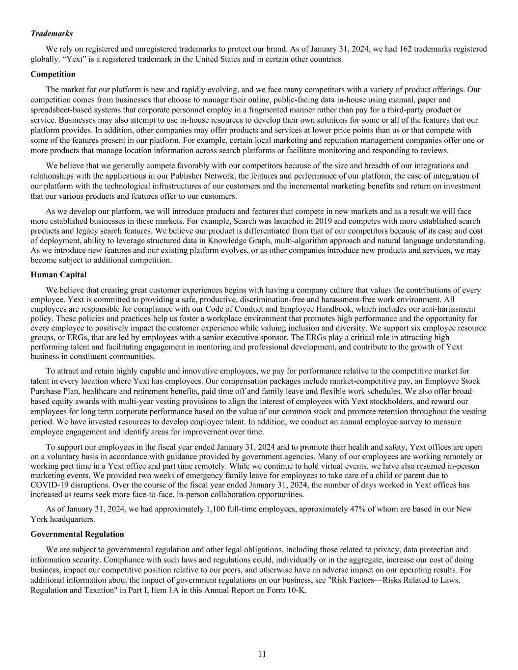 Trademarks We rely on registered and unregistered trademarks to protect our brand. As of January 31, 2024, we had 162 trademarks registered globally. “Yext” is a registered trademark in the United States and in certain other countries. Competition The market for our platform is new and rapidly evolving, and we face many competitors with a variety of product offerings. Our competition comes from businesses that choose to manage their online, public-facing data in-house using manual, paper and spreadsheet-based systems that corporate personnel employ in a fragmented manner rather than pay for a third-party product or service. Businesses may also attempt to use in-house resources to develop their own solutions for some or all of the features that our platform provides. In addition, other companies may offer products and services at lower price points than us or that compete with some of the features present in our platform. For example, certain local marketing and reputation management companies offer one or more products that manage location information across search platforms or facilitate monitoring and responding to reviews. We believe that we generally compete favorably with our competitors because of the size and breadth of our integrations and relationships with the applications in our Publisher Network, the features and performance of our platform, the ease of integration of our platform with the technological infrastructures of our customers and the incremental marketing benefits and return on investment that our various products and features offer to our customers. As we develop our platform, we will introduce products and features that compete in new markets and as a result we will face more established businesses in these markets. For example, Search was launched in 2019 and competes with more established search products and legacy search features. We believe our product is differentiated from that of our competitors because of its ease and cost of deployment, ability to leverage structured data in Knowledge Graph, multi-algorithm approach and natural language understanding. As we introduce new features and our existing platform evolves, or as other companies introduce new products and services, we may become subject to additional competition. Human Capital We believe that creating great customer experiences begins with having a company culture that values the contributions of every employee. Yext is committed to providing a safe, productive, discrimination-free and harassment-free work environment. All employees are responsible for compliance with our Code of Conduct and Employee Handbook, which includes our anti-harassment policy. These policies and practices help us foster a workplace environment that promotes high performance and the opportunity for every employee to positively impact the customer experience while valuing inclusion and diversity. We support six employee resource groups, or ERGs, that are led by employees with a senior executive sponsor. The ERGs play a critical role in attracting high performing talent and facilitating engagement in mentoring and professional development, and contribute to the growth of Yext business in constituent communities. To attract and retain highly capable and innovative employees, we pay for performance relative to the competitive market for talent in every location where Yext has employees. Our compensation packages include market-competitive pay, an Employee Stock Purchase Plan, healthcare and retirement benefits, paid time off and family leave and flexible work schedules. We also offer broad- based equity awards with multi-year vesting provisions to align the interest of employees with Yext stockholders, and reward our employees for long term corporate performance based on the value of our common stock and promote retention throughout the vesting period. We have invested resources to develop employee talent. In addition, we conduct an annual employee survey to measure employee engagement and identify areas for improvement over time. To support our employees in the fiscal year ended January 31, 2024 and to promote their health and safety, Yext offices are open on a voluntary basis in accordance with guidance provided by government agencies. Many of our employees are working remotely or working part time in a Yext office and part time remotely. While we continue to hold virtual events, we have also resumed in-person marketing events. We provided two weeks of emergency family leave for employees to take care of a child or parent due to COVID-19 disruptions. Over the course of the fiscal year ended January 31, 2024, the number of days worked in Yext offices has increased as teams seek more face-to-face, in-person collaboration opportunities. As of January 31, 2024, we had approximately 1,100 full-time employees, approximately 47% of whom are based in our New York headquarters. Governmental Regulation We are subject to governmental regulation and other legal obligations, including those related to privacy, data protection and information security. Compliance with such laws and regulations could, individually or in the aggregate, increase our cost of doing business, impact our competitive position relative to our peers, and otherwise have an adverse impact on our operating results. For additional information about the impact of government regulations on our business, see "Risk Factors—Risks Related to Laws, Regulation and Taxation" in Part I, Item 1A in this Annual Report on Form 10-K. 11