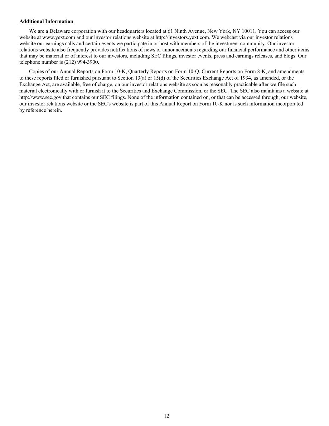 Additional Information We are a Delaware corporation with our headquarters located at 61 Ninth Avenue, New York, NY 10011. You can access our website at www.yext.com and our investor relations website at http://investors.yext.com. We webcast via our investor relations website our earnings calls and certain events we participate in or host with members of the investment community. Our investor relations website also frequently provides notifications of news or announcements regarding our financial performance and other items that may be material or of interest to our investors, including SEC filings, investor events, press and earnings releases, and blogs. Our telephone number is (212) 994-3900. Copies of our Annual Reports on Form 10-K, Quarterly Reports on Form 10-Q, Current Reports on Form 8-K, and amendments to these reports filed or furnished pursuant to Section 13(a) or 15(d) of the Securities Exchange Act of 1934, as amended, or the Exchange Act, are available, free of charge, on our investor relations website as soon as reasonably practicable after we file such material electronically with or furnish it to the Securities and Exchange Commission, or the SEC. The SEC also maintains a website at http://www.sec.gov that contains our SEC filings. None of the information contained on, or that can be accessed through, our website, our investor relations website or the SEC's website is part of this Annual Report on Form 10-K nor is such information incorporated by reference herein. 12