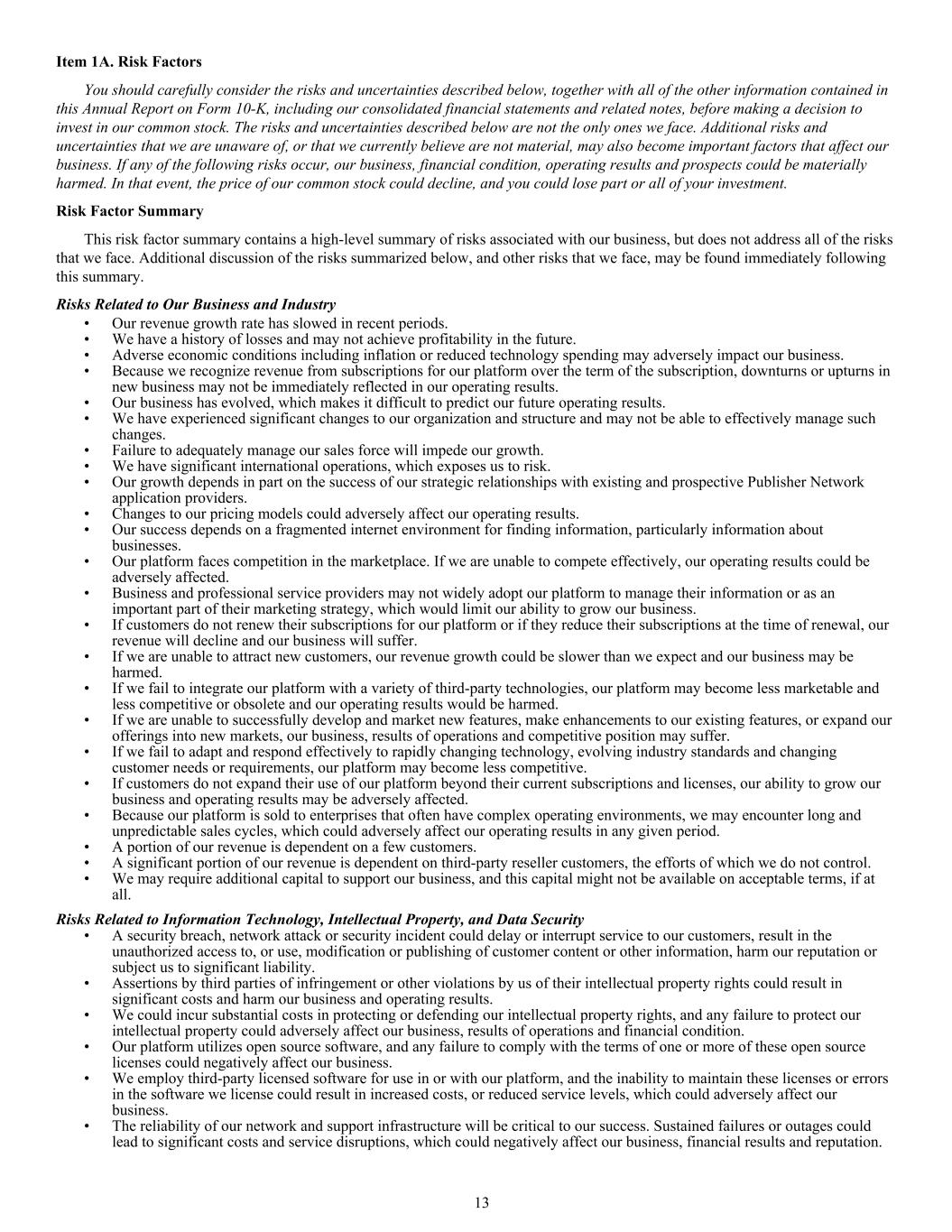 Item 1A. Risk Factors You should carefully consider the risks and uncertainties described below, together with all of the other information contained in this Annual Report on Form 10-K, including our consolidated financial statements and related notes, before making a decision to invest in our common stock. The risks and uncertainties described below are not the only ones we face. Additional risks and uncertainties that we are unaware of, or that we currently believe are not material, may also become important factors that affect our business. If any of the following risks occur, our business, financial condition, operating results and prospects could be materially harmed. In that event, the price of our common stock could decline, and you could lose part or all of your investment. Risk Factor Summary This risk factor summary contains a high-level summary of risks associated with our business, but does not address all of the risks that we face. Additional discussion of the risks summarized below, and other risks that we face, may be found immediately following this summary. Risks Related to Our Business and Industry • Our revenue growth rate has slowed in recent periods. • We have a history of losses and may not achieve profitability in the future. • Adverse economic conditions including inflation or reduced technology spending may adversely impact our business. • Because we recognize revenue from subscriptions for our platform over the term of the subscription, downturns or upturns in new business may not be immediately reflected in our operating results. • Our business has evolved, which makes it difficult to predict our future operating results. • We have experienced significant changes to our organization and structure and may not be able to effectively manage such changes. • Failure to adequately manage our sales force will impede our growth. • We have significant international operations, which exposes us to risk. • Our growth depends in part on the success of our strategic relationships with existing and prospective Publisher Network application providers. • Changes to our pricing models could adversely affect our operating results. • Our success depends on a fragmented internet environment for finding information, particularly information about businesses. • Our platform faces competition in the marketplace. If we are unable to compete effectively, our operating results could be adversely affected. • Business and professional service providers may not widely adopt our platform to manage their information or as an important part of their marketing strategy, which would limit our ability to grow our business. • If customers do not renew their subscriptions for our platform or if they reduce their subscriptions at the time of renewal, our revenue will decline and our business will suffer. • If we are unable to attract new customers, our revenue growth could be slower than we expect and our business may be harmed. • If we fail to integrate our platform with a variety of third-party technologies, our platform may become less marketable and less competitive or obsolete and our operating results would be harmed. • If we are unable to successfully develop and market new features, make enhancements to our existing features, or expand our offerings into new markets, our business, results of operations and competitive position may suffer. • If we fail to adapt and respond effectively to rapidly changing technology, evolving industry standards and changing customer needs or requirements, our platform may become less competitive. • If customers do not expand their use of our platform beyond their current subscriptions and licenses, our ability to grow our business and operating results may be adversely affected. • Because our platform is sold to enterprises that often have complex operating environments, we may encounter long and unpredictable sales cycles, which could adversely affect our operating results in any given period. • A portion of our revenue is dependent on a few customers. • A significant portion of our revenue is dependent on third-party reseller customers, the efforts of which we do not control. • We may require additional capital to support our business, and this capital might not be available on acceptable terms, if at all. Risks Related to Information Technology, Intellectual Property, and Data Security • A security breach, network attack or security incident could delay or interrupt service to our customers, result in the unauthorized access to, or use, modification or publishing of customer content or other information, harm our reputation or subject us to significant liability. • Assertions by third parties of infringement or other violations by us of their intellectual property rights could result in significant costs and harm our business and operating results. • We could incur substantial costs in protecting or defending our intellectual property rights, and any failure to protect our intellectual property could adversely affect our business, results of operations and financial condition. • Our platform utilizes open source software, and any failure to comply with the terms of one or more of these open source licenses could negatively affect our business. • We employ third-party licensed software for use in or with our platform, and the inability to maintain these licenses or errors in the software we license could result in increased costs, or reduced service levels, which could adversely affect our business. • The reliability of our network and support infrastructure will be critical to our success. Sustained failures or outages could lead to significant costs and service disruptions, which could negatively affect our business, financial results and reputation. 13