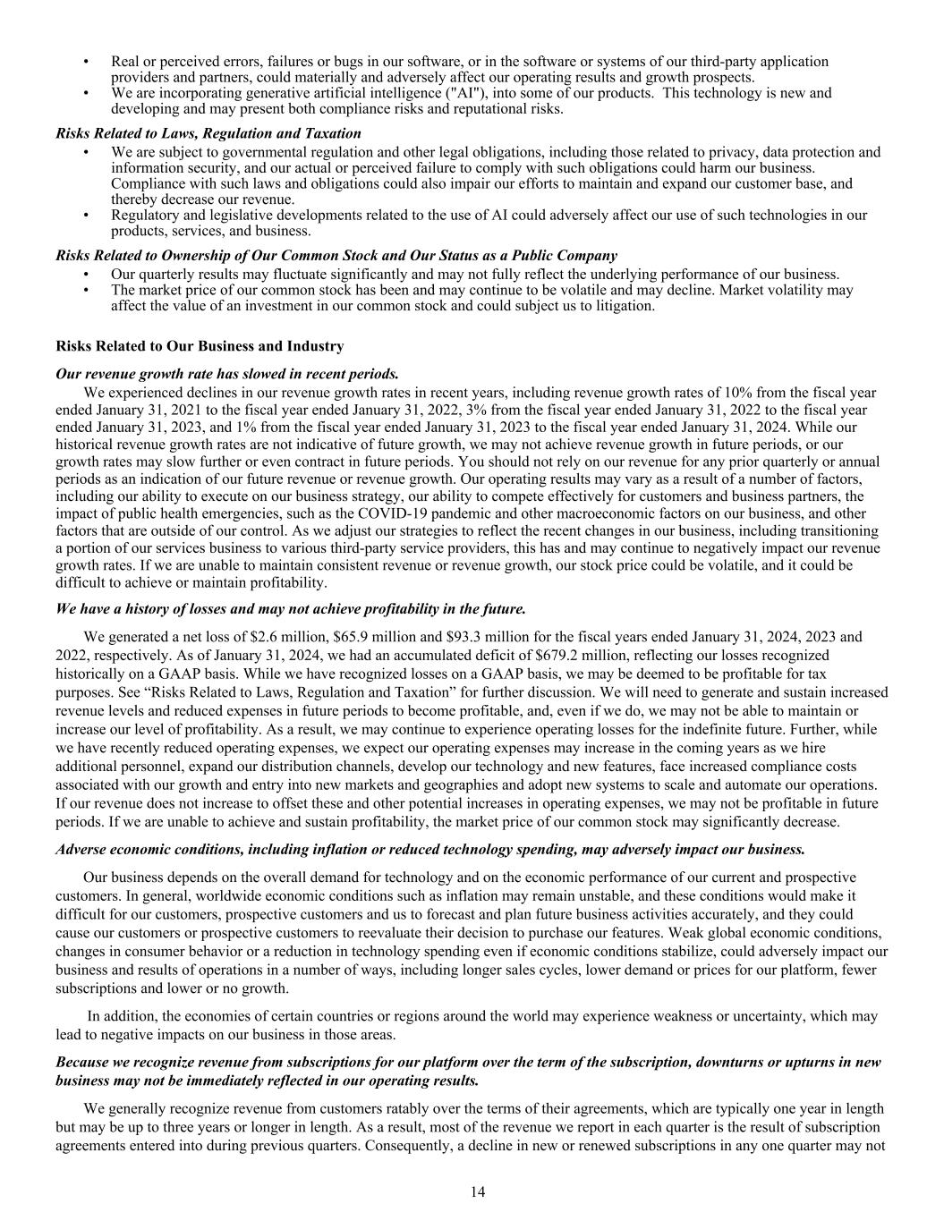 • Real or perceived errors, failures or bugs in our software, or in the software or systems of our third-party application providers and partners, could materially and adversely affect our operating results and growth prospects. • We are incorporating generative artificial intelligence ("AI"), into some of our products. This technology is new and developing and may present both compliance risks and reputational risks. Risks Related to Laws, Regulation and Taxation • We are subject to governmental regulation and other legal obligations, including those related to privacy, data protection and information security, and our actual or perceived failure to comply with such obligations could harm our business. Compliance with such laws and obligations could also impair our efforts to maintain and expand our customer base, and thereby decrease our revenue. • Regulatory and legislative developments related to the use of AI could adversely affect our use of such technologies in our products, services, and business. Risks Related to Ownership of Our Common Stock and Our Status as a Public Company • Our quarterly results may fluctuate significantly and may not fully reflect the underlying performance of our business. • The market price of our common stock has been and may continue to be volatile and may decline. Market volatility may affect the value of an investment in our common stock and could subject us to litigation. Risks Related to Our Business and Industry Our revenue growth rate has slowed in recent periods. We experienced declines in our revenue growth rates in recent years, including revenue growth rates of 10% from the fiscal year ended January 31, 2021 to the fiscal year ended January 31, 2022, 3% from the fiscal year ended January 31, 2022 to the fiscal year ended January 31, 2023, and 1% from the fiscal year ended January 31, 2023 to the fiscal year ended January 31, 2024. While our historical revenue growth rates are not indicative of future growth, we may not achieve revenue growth in future periods, or our growth rates may slow further or even contract in future periods. You should not rely on our revenue for any prior quarterly or annual periods as an indication of our future revenue or revenue growth. Our operating results may vary as a result of a number of factors, including our ability to execute on our business strategy, our ability to compete effectively for customers and business partners, the impact of public health emergencies, such as the COVID-19 pandemic and other macroeconomic factors on our business, and other factors that are outside of our control. As we adjust our strategies to reflect the recent changes in our business, including transitioning a portion of our services business to various third-party service providers, this has and may continue to negatively impact our revenue growth rates. If we are unable to maintain consistent revenue or revenue growth, our stock price could be volatile, and it could be difficult to achieve or maintain profitability. We have a history of losses and may not achieve profitability in the future. We generated a net loss of $2.6 million, $65.9 million and $93.3 million for the fiscal years ended January 31, 2024, 2023 and 2022, respectively. As of January 31, 2024, we had an accumulated deficit of $679.2 million, reflecting our losses recognized historically on a GAAP basis. While we have recognized losses on a GAAP basis, we may be deemed to be profitable for tax purposes. See “Risks Related to Laws, Regulation and Taxation” for further discussion. We will need to generate and sustain increased revenue levels and reduced expenses in future periods to become profitable, and, even if we do, we may not be able to maintain or increase our level of profitability. As a result, we may continue to experience operating losses for the indefinite future. Further, while we have recently reduced operating expenses, we expect our operating expenses may increase in the coming years as we hire additional personnel, expand our distribution channels, develop our technology and new features, face increased compliance costs associated with our growth and entry into new markets and geographies and adopt new systems to scale and automate our operations. If our revenue does not increase to offset these and other potential increases in operating expenses, we may not be profitable in future periods. If we are unable to achieve and sustain profitability, the market price of our common stock may significantly decrease. Adverse economic conditions, including inflation or reduced technology spending, may adversely impact our business. Our business depends on the overall demand for technology and on the economic performance of our current and prospective customers. In general, worldwide economic conditions such as inflation may remain unstable, and these conditions would make it difficult for our customers, prospective customers and us to forecast and plan future business activities accurately, and they could cause our customers or prospective customers to reevaluate their decision to purchase our features. Weak global economic conditions, changes in consumer behavior or a reduction in technology spending even if economic conditions stabilize, could adversely impact our business and results of operations in a number of ways, including longer sales cycles, lower demand or prices for our platform, fewer subscriptions and lower or no growth. In addition, the economies of certain countries or regions around the world may experience weakness or uncertainty, which may lead to negative impacts on our business in those areas. Because we recognize revenue from subscriptions for our platform over the term of the subscription, downturns or upturns in new business may not be immediately reflected in our operating results. We generally recognize revenue from customers ratably over the terms of their agreements, which are typically one year in length but may