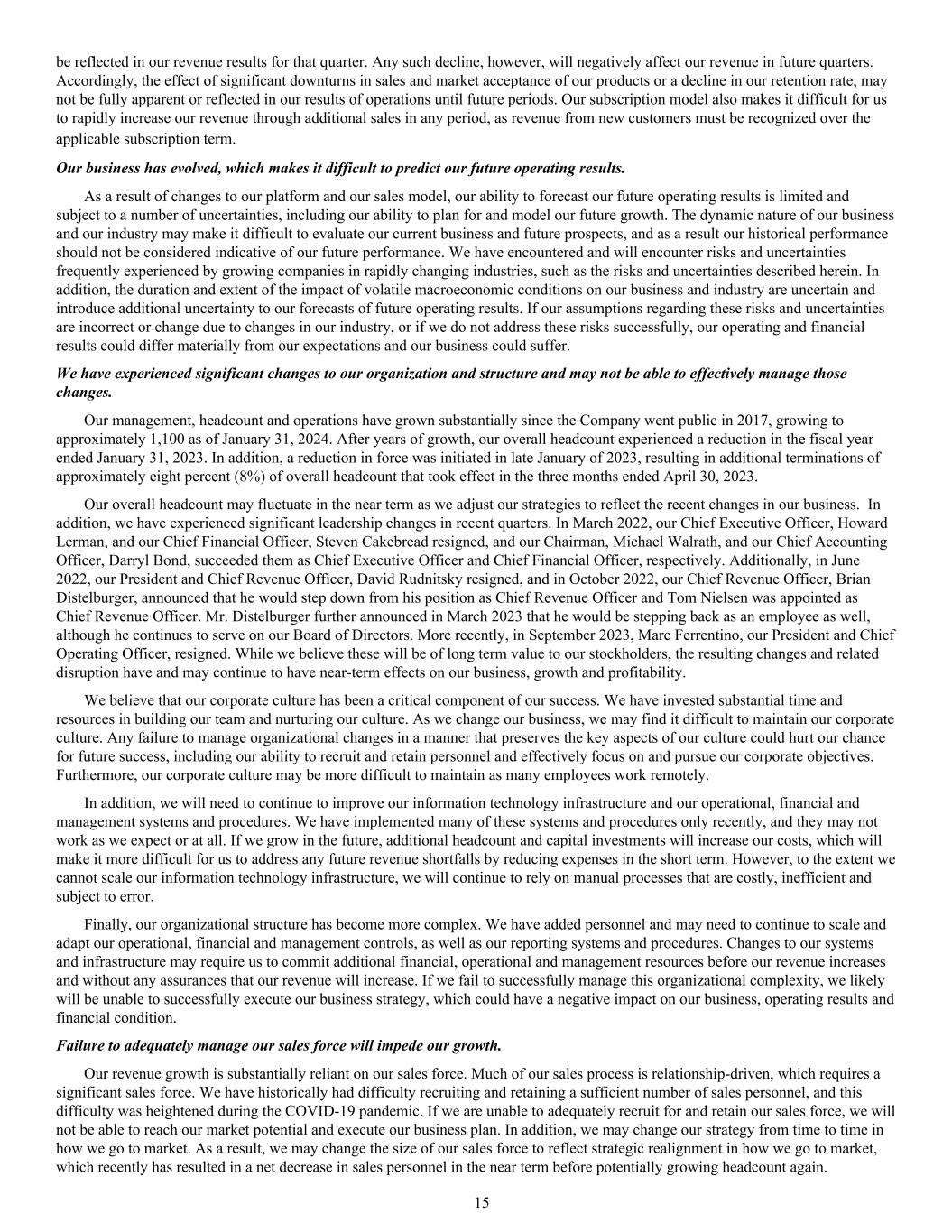 be reflected in our revenue results for that quarter. Any such decline, however, will negatively affect our revenue in future quarters. Accordingly, the effect of significant downturns in sales and market acceptance of our products or a decline in our retention rate, may not be fully apparent or reflected in our results of operations until future periods. Our subscription model also makes it difficult for us to rapidly increase our revenue through additional sales in any period, as revenue from new customers must be recognized over the applicable subscription term. Our business has evolved, which makes it difficult to predict our future operating results. As a result of changes to our platform and our sales model, our ability to forecast our future operating results is limited and subject to a number of uncertainties, including our ability to plan for and model our future growth. The dynamic nature of our business and our industry may make it difficult to evaluate our current business and future prospects, and as a result our historical performance should not be considered indicative of our future performance. We have encountered and will encounter risks and uncertainties frequently experienced by growing companies in rapidly changing industries, such as the risks and uncertainties described herein. In addition, the duration and extent of the impact of volatile macroeconomic conditions on our business and industry are uncertain and introduce additional uncertainty to our forecasts of future operating results. If our assumptions regarding these risks and uncertainties are incorrect or change due to changes in our industry, or if we do not address these risks successfully, our operating and financial results could differ materially from our expectations and our business could suffer. We have experienced significant changes to our organization and structure and may not be able to effectively manage those changes. Our management, headcount and operations have grown substantially since the Company went public in 2017, growing to approximately 1,100 as of January 31, 2024. After years of growth, our overall headcount experienced a reduction in the fiscal year ended January 31, 2023. In addition, a reduction in force was initiated in late January of 2023, resulting in additional terminations of approximately eight percent (8%) of overall headcount that took effect in the three months ended April 30, 2023. Our overall headcount may fluctuate in the near term as we adjust our strategies to reflect the recent changes in our business. In addition, we have experienced significant leadership changes in recent quarters. In March 2022, our Chief Executive Officer, Howard Lerman, and our Chief Financial Officer, Steven Cakebread resigned, and our Chairman, Michael Walrath, and our Chief Accounting Officer, Darryl Bond, succeeded them as Chief Executive Officer and Chief Financial Officer, respectively. Additionally, in June 2022, our President and Chief Revenue Officer, David Rudnitsky resigned, and in October 2022, our Chief Revenue Officer, Brian Distelburger, announced that he would step down from his position as Chief Revenue Officer and Tom Nielsen was appointed as Chief Revenue Officer. Mr. Distelburger further announced in March 2023 that he would be stepping back as an employee as well, although he continues to serve on our Board of Directors. More recently, in September 2023, Marc Ferrentino, our President and Chief Operating Officer, resigned. While we believe these will be of long term value to our stockholders, the resulting changes and related disruption have and may continue to have near-term effects on our business, growth and profitability. We believe that our corporate culture has been a critical component of our success. We have invested substantial time and resources in building our team and nurturing our culture. As we change our business, we may find it difficult to maintain our corporate culture. Any failure to manage organizational changes in a manner that preserves the key aspects of our culture could hurt our chance for future success, including our ability to recruit and retain personnel and effectively focus on and pursue our corporate objectives. Furthermore, our corporate culture may be more difficult to maintain as many employees work remotely. In addition, we will need to continue to improve our information technology infrastructure and our operational, financial and management systems and procedures. We have implemented many of these systems and procedures only recently, and they may not work as we expect or at all. If we grow in the future, additional headcount and capital investments will increase our costs, which will make it more difficult for us to address any future revenue shortfalls by reducing expenses in the short term. However, to the extent we cannot scale our information technology infrastructure, we will continue to rely on manual processes that are costly, inefficient and subject to error. Finally, our organizational structure has become more complex. We have added personnel and may need to continue to scale and adapt our operational, financial and management controls, as well as our reporting systems and procedures. Changes to our systems and infrastructure may require us to commit additional financial, operational and management resources before our revenue increases and without any assurances that our revenue will increase. If we fail to successfully manage this organizational complexity, we likely will be unable to successfully execute our business strategy, which could have a negative impact on our business, operating results and financial condition. Failure to adequately manage our sales force will impede our growth. Our revenue growth is substantially reliant on our sales force. Much of our sales process is relationship-driven, which requires a significant sales force. We have historically had difficulty recruiting and retaining a sufficient number o