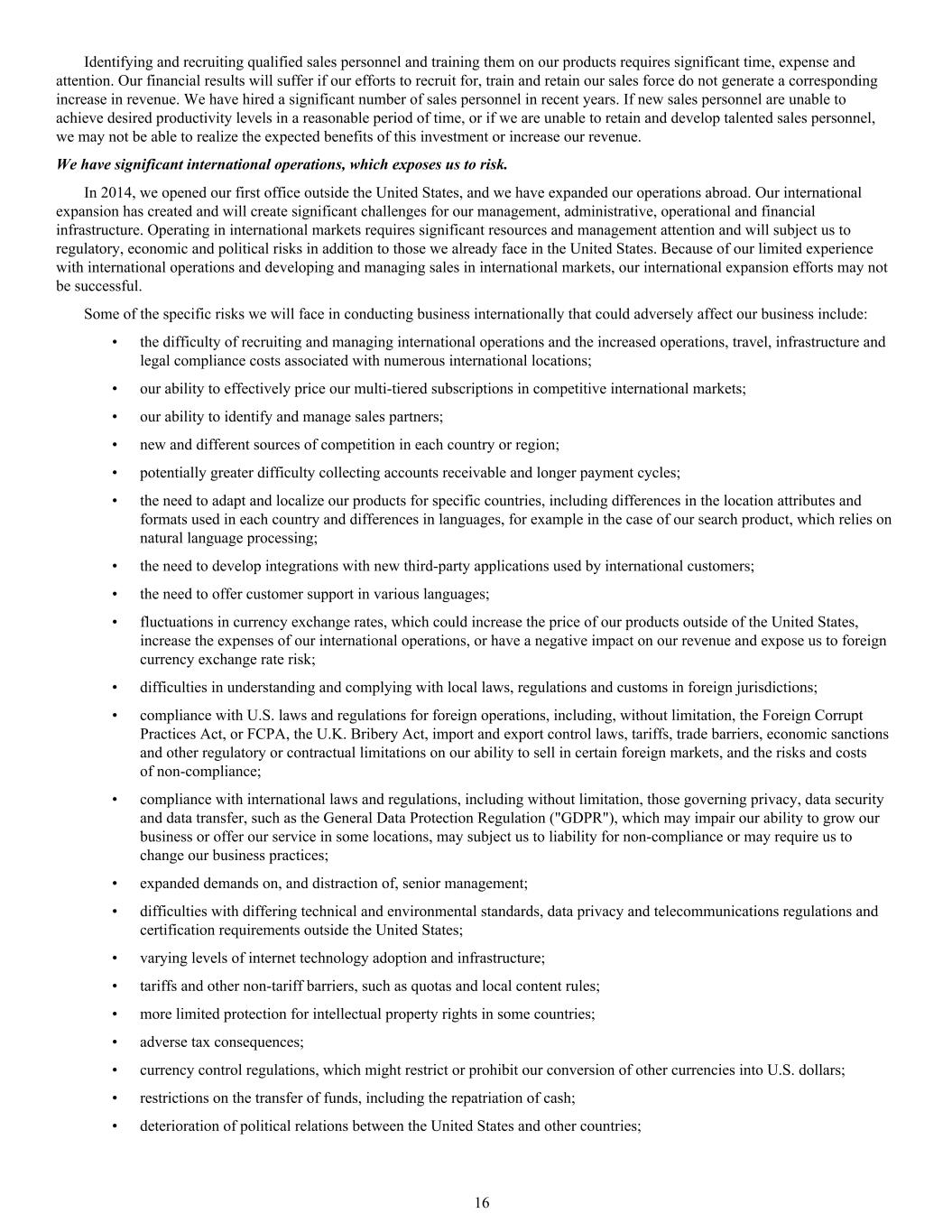 Identifying and recruiting qualified sales personnel and training them on our products requires significant time, expense and attention. Our financial results will suffer if our efforts to recruit for, train and retain our sales force do not generate a corresponding increase in revenue. We have hired a significant number of sales personnel in recent years. If new sales personnel are unable to achieve desired productivity levels in a reasonable period of time, or if we are unable to retain and develop talented sales personnel, we may not be able to realize the expected benefits of this investment or increase our revenue. We have significant international operations, which exposes us to risk. In 2014, we opened our first office outside the United States, and we have expanded our operations abroad. Our international expansion has created and will create significant challenges for our management, administrative, operational and financial infrastructure. Operating in international markets requires significant resources and management attention and will subject us to regulatory, economic and political risks in addition to those we already face in the United States. Because of our limited experience with international operations and developing and managing sales in international markets, our international expansion efforts may not be successful. Some of the specific risks we will face in conducting business internationally that could adversely affect our business include: • the difficulty of recruiting and managing international operations and the increased operations, travel, infrastructure and legal compliance costs associated with numerous international locations; • our ability to effectively price our multi-tiered subscriptions in competitive international markets; • our ability to identify and manage sales partners; • new and different sources of competition in each country or region; • potentially greater difficulty collecting accounts receivable and longer payment cycles; • the need to adapt and localize our products for specific countries, including differences in the location attributes and formats used in each country and differences in languages, for example in the case of our search product, which relies on natural language processing; • the need to develop integrations with new third-party applications used by international customers; • the need to offer customer support in various languages; • fluctuations in currency exchange rates, which could increase the price of our products outside of the United States, increase the expenses of our international operations, or have a negative impact on our revenue and expose us to foreign currency exchange rate risk; • difficulties in understanding and complying with local laws, regulations and customs in foreign jurisdictions; • compliance with U.S. laws and regulations for foreign operations, including, without limitation, the Foreign Corrupt Practices Act, or FCPA, the U.K. Bribery Act, import and export control laws, tariffs, trade barriers, economic sanctions and other regulatory or contractual limitations on our ability to sell in certain foreign markets, and the risks and costs of non-compliance; • compliance with international laws and regulations, including without limitation, those governing privacy, data security and data transfer, such as the General Data Protection Regulation ("GDPR"), which may impair our ability to grow our business or offer our service in some locations, may subject us to liability for non-compliance or may require us to change our business practices; • expanded demands on, and distraction of, senior management; • difficulties with differing technical and environmental standards, data privacy and telecommunications regulations and certification requirements outside the United States; • varying levels of internet technology adoption and infrastructure; • tariffs and other non-tariff barriers, such as quotas and local content rules; • more limited protection for intellectual property rights in some countries; • adverse tax consequences; • currency control regulations, which might restrict or prohibit our conversion of other currencies into U.S. dollars; • restrictions on the transfer of funds, including the repatriation of cash; • deterioration of political relations between the United States and other countries; 16