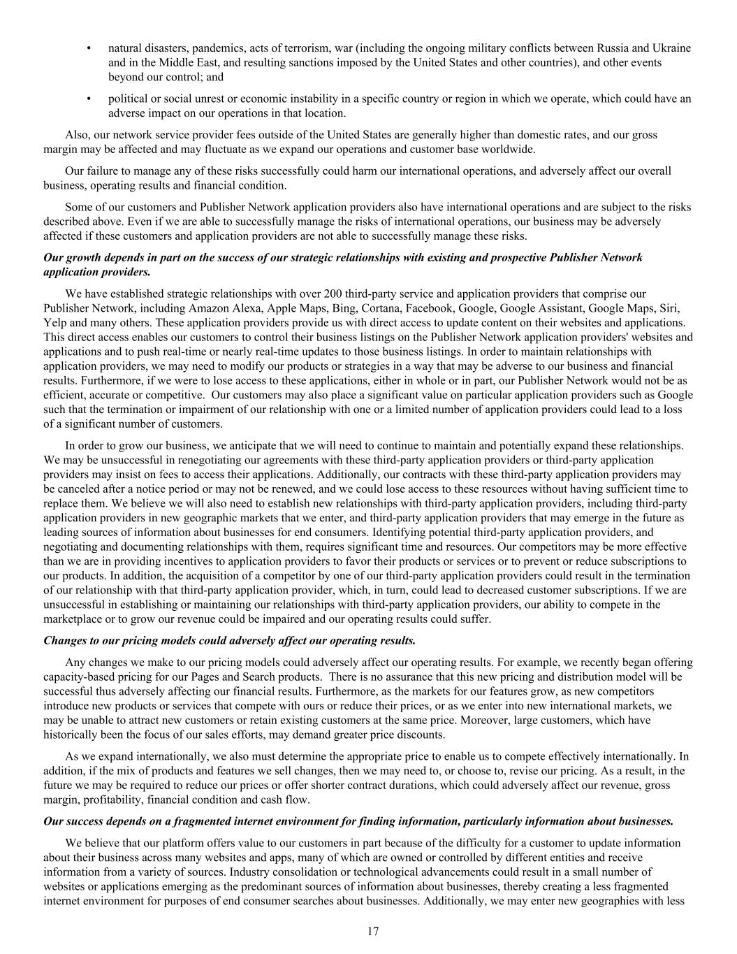 • natural disasters, pandemics, acts of terrorism, war (including the ongoing military conflicts between Russia and Ukraine and in the Middle East, and resulting sanctions imposed by the United States and other countries), and other events beyond our control; and • political or social unrest or economic instability in a specific country or region in which we operate, which could have an adverse impact on our operations in that location. Also, our network service provider fees outside of the United States are generally higher than domestic rates, and our gross margin may be affected and may fluctuate as we expand our operations and customer base worldwide. Our failure to manage any of these risks successfully could harm our international operations, and adversely affect our overall business, operating results and financial condition. Some of our customers and Publisher Network application providers also have international operations and are subject to the risks described above. Even if we are able to successfully manage the risks of international operations, our business may be adversely affected if these customers and application providers are not able to successfully manage these risks. Our growth depends in part on the success of our strategic relationships with existing and prospective Publisher Network application providers. We have established strategic relationships with over 200 third-party service and application providers that comprise our Publisher Network, including Amazon Alexa, Apple Maps, Bing, Cortana, Facebook, Google, Google Assistant, Google Maps, Siri, Yelp and many others. These application providers provide us with direct access to update content on their websites and applications. This direct access enables our customers to control their business listings on the Publisher Network application providers' websites and applications and to push real-time or nearly real-time updates to those business listings. In order to maintain relationships with application providers, we may need to modify our products or strategies in a way that may be adverse to our business and financial results. Furthermore, if we were to lose access to these applications, either in whole or in part, our Publisher Network would not be as efficient, accurate or competitive. Our customers may also place a significant value on particular application providers such as Google such that the termination or impairment of our relationship with one or a limited number of application providers could lead to a loss of a significant number of customers. In order to grow our business, we anticipate that we will need to continue to maintain and potentially expand these relationships. We may be unsuccessful in renegotiating our agreements with these third-party application providers or third-party application providers may insist on fees to access their applications. Additionally, our contracts with these third-party application providers may be canceled after a notice period or may not be renewed, and we could lose access to these resources without having sufficient time to replace them. We believe we will also need to establish new relationships with third-party application providers, including third-party application providers in new geographic markets that we enter, and third-party application providers that may emerge in the future as leading sources of information about businesses for end consumers. Identifying potential third-party application providers, and negotiating and documenting relationships with them, requires significant time and resources. Our competitors may be more effective than we are in providing incentives to application providers to favor their products or services or to prevent or reduce subscriptions to our products. In addition, the acquisition of a competitor by one of our third-party application providers could result in the termination of our relationship with that third-party application provider, which, in turn, could lead to decreased customer subscriptions. If we are unsuccessful in establishing or maintaining our relationships with third-party application providers, our ability to compete in the marketplace or to grow our revenue could be impaired and our operating results could suffer. Changes to our pricing models could adversely affect our operating results. Any changes we make to our pricing models could adversely affect our operating results. For example, we recently began offering capacity-based pricing for our Pages and Search products. There is no assurance that this new pricing and distribution model will be successful thus adversely affecting our financial results. Furthermore, as the markets for our features grow, as new competitors introduce new products or services that compete with ours or reduce their prices, or as we enter into new international markets, we may be unable to attract new customers or retain existing customers at the same price. Moreover, large customers, which have historically been the focus of our sales efforts, may demand greater price discounts. As we expand internationally, we also must determine the appropriate price to enable us to compete effectively internationally. In addition, if the mix of products and features we sell changes, then we may need to, or choose to, revise our pricing. As a result, in the future we may be required to reduce our prices or offer shorter contract durations, which could adversely affect our revenue, gross margin, profitability, financial condition and cash flow. Our success depends on a fragmented internet environment for finding information, particularly information about businesses. We believe that our platform offers value to our customers in part because of the difficulty for a customer to update information about their business across many websites and apps, many of which are owned or controlled by different entities and receive information from a variety of sources. Industry consolidation or technolo