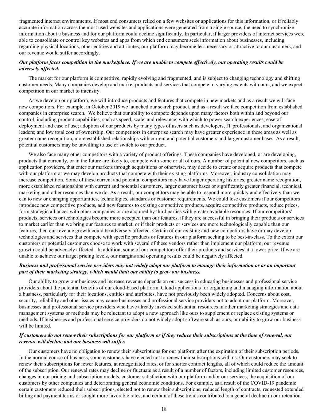 fragmented internet environments. If most end consumers relied on a few websites or applications for this information, or if reliably accurate information across the most used websites and applications were generated from a single source, the need to synchronize information about a business and for our platform could decline significantly. In particular, if larger providers of internet services were able to consolidate or control key websites and apps from which end consumers seek information about businesses, including regarding physical locations, other entities and attributes, our platform may become less necessary or attractive to our customers, and our revenue would suffer accordingly. Our platform faces competition in the marketplace. If we are unable to compete effectively, our operating results could be adversely affected. The market for our platform is competitive, rapidly evolving and fragmented, and is subject to changing technology and shifting customer needs. Many companies develop and market products and services that compete to varying extents with ours, and we expect competition in our market to intensify. As we develop our platform, we will introduce products and features that compete in new markets and as a result we will face new competitors. For example, in October 2019 we launched our search product, and as a result we face competition from established companies in enterprise search. We believe that our ability to compete depends upon many factors both within and beyond our control, including product capabilities, such as speed, scale, and relevance, with which to power search experiences; ease of deployment and ease of use; adoption of our products by many types of users such as developers, IT professionals, and organizational leaders; and low total cost of ownership. Our competitors in enterprise search may have greater experience in these areas as well as greater name recognition, more established relationships with current and potential customers and larger customer bases. As a result, potential customers may be unwilling to use or switch to our product. We also face many other competitors with a variety of product offerings. These companies have developed, or are developing, products that currently, or in the future are likely to, compete with some or all of ours. A number of potential new competitors, such as application providers, that enter our markets through acquisitions or otherwise, may decide to create or acquire products that compete with our platform or we may develop products that compete with their existing platforms. Moreover, industry consolidation may increase competition. Some of these current and potential competitors may have longer operating histories, greater name recognition, more established relationships with current and potential customers, larger customer bases or significantly greater financial, technical, marketing and other resources than we do. As a result, our competitors may be able to respond more quickly and effectively than we can to new or changing opportunities, technologies, standards or customer requirements. We could lose customers if our competitors introduce new competitive products, add new features to existing competitive products, acquire competitive products, reduce prices, form strategic alliances with other companies or are acquired by third parties with greater available resources. If our competitors' products, services or technologies become more accepted than our features, if they are successful in bringing their products or services to market earlier than we bring our features to market, or if their products or services are more technologically capable than our features, then our revenue growth could be adversely affected. Certain of our existing and new competitors have or may develop technologies and services that compete with specific products or features in our platform seeking to be best-in-class. To the extent our customers or potential customers choose to work with several of these vendors rather than implement our platform, our revenue growth could be adversely affected. In addition, some of our competitors offer their products and services at a lower price. If we are unable to achieve our target pricing levels, our margins and operating results could be negatively affected. Business and professional service providers may not widely adopt our platform to manage their information or as an important part of their marketing strategy, which would limit our ability to grow our business. Our ability to grow our business and increase revenue depends on our success in educating businesses and professional service providers about the potential benefits of our cloud-based platform. Cloud applications for organizing and managing information about a business, particularly for their locations, entities and attributes, have not previously been widely adopted. Concerns about cost, security, reliability and other issues may cause businesses and professional service providers not to adopt our platform. Moreover, businesses and professional service providers who have already invested substantial resources in other marketing strategies and data management systems or methods may be reluctant to adopt a new approach like ours to supplement or replace existing systems or methods. If businesses and professional service providers do not widely adopt software such as ours, our ability to grow our business will be limited. If customers do not renew their subscriptions for our platform or if they reduce their subscriptions at the time of renewal, our revenue will decline and our business will suffer. Our customers have no obligation to renew their subscriptions for our platform after the expiration of their subscription periods. In the normal course of business, some customers have elected not to renew their subscriptions with us. Our customers may seek to renew their subscriptions for fewer features, at renegotiated rates, or for