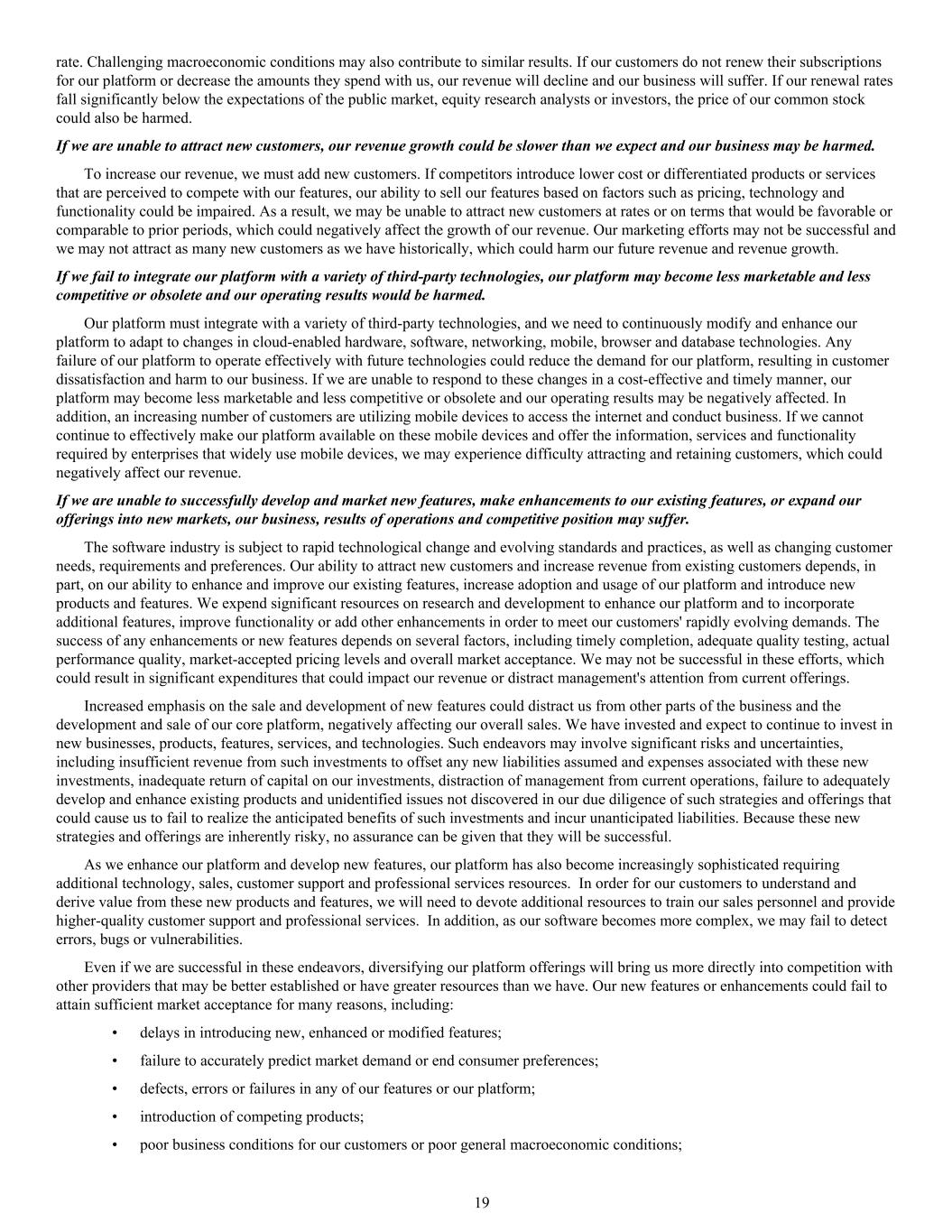 rate. Challenging macroeconomic conditions may also contribute to similar results. If our customers do not renew their subscriptions for our platform or decrease the amounts they spend with us, our revenue will decline and our business will suffer. If our renewal rates fall significantly below the expectations of the public market, equity research analysts or investors, the price of our common stock could also be harmed. If we are unable to attract new customers, our revenue growth could be slower than we expect and our business may be harmed. To increase our revenue, we must add new customers. If competitors introduce lower cost or differentiated products or services that are perceived to compete with our features, our ability to sell our features based on factors such as pricing, technology and functionality could be impaired. As a result, we may be unable to attract new customers at rates or on terms that would be favorable or comparable to prior periods, which could negatively affect the growth of our revenue. Our marketing efforts may not be successful and we may not attract as many new customers as we have historically, which could harm our future revenue and revenue growth. If we fail to integrate our platform with a variety of third-party technologies, our platform may become less marketable and less competitive or obsolete and our operating results would be harmed. Our platform must integrate with a variety of third-party technologies, and we need to continuously modify and enhance our platform to adapt to changes in cloud-enabled hardware, software, networking, mobile, browser and database technologies. Any failure of our platform to operate effectively with future technologies could reduce the demand for our platform, resulting in customer dissatisfaction and harm to our business. If we are unable to respond to these changes in a cost-effective and timely manner, our platform may become less marketable and less competitive or obsolete and our operating results may be negatively affected. In addition, an increasing number of customers are utilizing mobile devices to access the internet and conduct business. If we cannot continue to effectively make our platform available on these mobile devices and offer the information, services and functionality required by enterprises that widely use mobile devices, we may experience difficulty attracting and retaining customers, which could negatively affect our revenue. If we are unable to successfully develop and market new features, make enhancements to our existing features, or expand our offerings into new markets, our business, results of operations and competitive position may suffer. The software industry is subject to rapid technological change and evolving standards and practices, as well as changing customer needs, requirements and preferences. Our ability to attract new customers and increase revenue from existing customers depends, in part, on our ability to enhance and improve our existing features, increase adoption and usage of our platform and introduce new products and features. We expend significant resources on research and development to enhance our platform and to incorporate additional features, improve functionality or add other enhancements in order to meet our customers' rapidly evolving demands. The success of any enhancements or new features depends on several factors, including timely completion, adequate quality testing, actual performance quality, market-accepted pricing levels and overall market acceptance. We may not be successful in these efforts, which could result in significant expenditures that could impact our revenue or distract management's attention from current offerings. Increased emphasis on the sale and development of new features could distract us from other parts of the business and the development and sale of our core platform, negatively affecting our overall sales. We have invested and expect to continue to invest in new businesses, products, features, services, and technologies. Such endeavors may involve significant risks and uncertainties, including insufficient revenue from such investments to offset any new liabilities assumed and expenses associated with these new investments, inadequate return of capital on our investments, distraction of management from current operations, failure to adequately develop and enhance existing products and unidentified issues not discovered in our due diligence of such strategies and offerings that could cause us to fail to realize the anticipated benefits of such investments and incur unanticipated liabilities. Because these new strategies and offerings are inherently risky, no assurance can be given that they will be successful. As we enhance our platform and develop new features, our platform has also become increasingly sophisticated requiring additional technology, sales, customer support and professional services resources. In order for our customers to understand and derive value from these new products and features, we will need to devote additional resources to train our sales personnel and provide higher-quality customer support and professional services. In addition, as our software becomes more complex, we may fail to detect errors, bugs or vulnerabilities. Even if we are successful in these endeavors, diversifying our platform offerings will bring us more directly into competition with other providers that may be better established or have greater resources than we have. Our new features or enhancements could fail to attain sufficient market acceptance for many reasons, including: • delays in introducing new, enhanced or modified features; • failure to accurately predict market demand or end consumer preferences; • defects, errors or failures in any of our features or our platform; • introduction of competing products; • poor business conditions for our customers or poor general macroeconomic conditions; 19