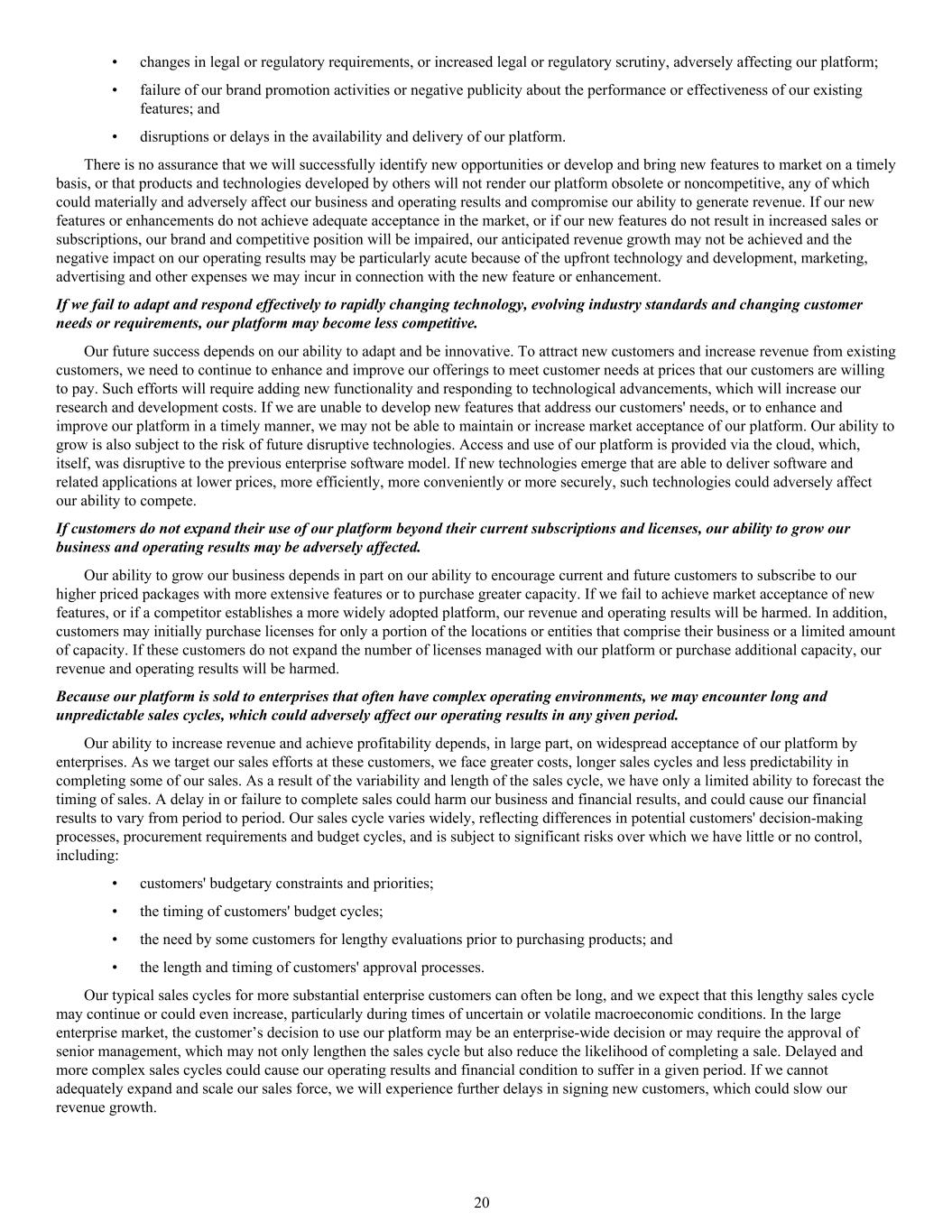 • changes in legal or regulatory requirements, or increased legal or regulatory scrutiny, adversely affecting our platform; • failure of our brand promotion activities or negative publicity about the performance or effectiveness of our existing features; and • disruptions or delays in the availability and delivery of our platform. There is no assurance that we will successfully identify new opportunities or develop and bring new features to market on a timely basis, or that products and technologies developed by others will not render our platform obsolete or noncompetitive, any of which could materially and adversely affect our business and operating results and compromise our ability to generate revenue. If our new features or enhancements do not achieve adequate acceptance in the market, or if our new features do not result in increased sales or subscriptions, our brand and competitive position will be impaired, our anticipated revenue growth may not be achieved and the negative impact on our operating results may be particularly acute because of the upfront technology and development, marketing, advertising and other expenses we may incur in connection with the new feature or enhancement. If we fail to adapt and respond effectively to rapidly changing technology, evolving industry standards and changing customer needs or requirements, our platform may become less competitive. Our future success depends on our ability to adapt and be innovative. To attract new customers and increase revenue from existing customers, we need to continue to enhance and improve our offerings to meet customer needs at prices that our customers are willing to pay. Such efforts will require adding new functionality and responding to technological advancements, which will increase our research and development costs. If we are unable to develop new features that address our customers' needs, or to enhance and improve our platform in a timely manner, we may not be able to maintain or increase market acceptance of our platform. Our ability to grow is also subject to the risk of future disruptive technologies. Access and use of our platform is provided via the cloud, which, itself, was disruptive to the previous enterprise software model. If new technologies emerge that are able to deliver software and related applications at lower prices, more efficiently, more conveniently or more securely, such technologies could adversely affect our ability to compete. If customers do not expand their use of our platform beyond their current subscriptions and licenses, our ability to grow our business and operating results may be adversely affected. Our ability to grow our business depends in part on our ability to encourage current and future customers to subscribe to our higher priced packages with more extensive features or to purchase greater capacity. If we fail to achieve market acceptance of new features, or if a competitor establishes a more widely adopted platform, our revenue and operating results will be harmed. In addition, customers may initially purchase licenses for only a portion of the locations or entities that comprise their business or a limited amount of capacity. If these customers do not expand the number of licenses managed with our platform or purchase additional capacity, our revenue and operating results will be harmed. Because our platform is sold to enterprises that often have complex operating environments, we may encounter long and unpredictable sales cycles, which could adversely affect our operating results in any given period. Our ability to increase revenue and achieve profitability depends, in large part, on widespread acceptance of our platform by enterprises. As we target our sales efforts at these customers, we face greater costs, longer sales cycles and less predictability in completing some of our sales. As a result of the variability and length of the sales cycle, we have only a limited ability to forecast the timing of sales. A delay in or failure to complete sales could harm our business and financial results, and could cause our financial results to vary from period to period. Our sales cycle varies widely, reflecting differences in potential customers' decision-making processes, procurement requirements and budget cycles, and is subject to significant risks over which we have little or no control, including: • customers' budgetary constraints and priorities; • the timing of customers' budget cycles; • the need by some customers for lengthy evaluations prior to purchasing products; and • the length and timing of customers' approval processes. Our typical sales cycles for more substantial enterprise customers can often be long, and we expect that this lengthy sales cycle may continue or could even increase, particularly during times of uncertain or volatile macroeconomic conditions. In the large enterprise market, the customer’s decision to use our platform may be an enterprise-wide decision or may require the approval of senior management, which may not only lengthen the sales cycle but also reduce the likelihood of completing a sale. Delayed and more complex sales cycles could cause our operating results and financial condition to suffer in a given period. If we cannot adequately expand and scale our sales force, we will experience further delays in signing new customers, which could slow our revenue growth. 20