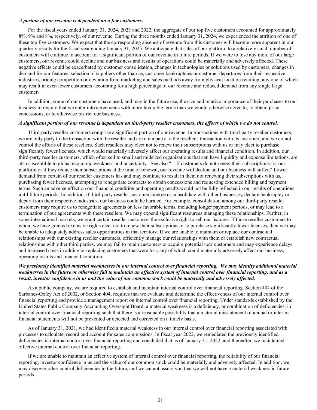 A portion of our revenue is dependent on a few customers. For the fiscal years ended January 31, 2024, 2023 and 2022, the aggregate of our top five customers accounted for approximately 8%, 9% and 8%, respectively, of our revenue. During the three months ended January 31, 2024, we experienced the attrition of one of these top five customers. We expect that the corresponding absence of revenue from this customer will become more apparent in our quarterly results for the fiscal year ending January 31, 2025. We anticipate that sales of our platform to a relatively small number of customers will continue to account for a significant portion of our revenue in future periods. If we were to lose any more of our large customers, our revenue could decline and our business and results of operations could be materially and adversely affected. These negative effects could be exacerbated by customer consolidation, changes in technologies or solutions used by customers, changes in demand for our features, selection of suppliers other than us, customer bankruptcies or customer departures from their respective industries, pricing competition or deviation from marketing and sales methods away from physical location retailing, any one of which may result in even fewer customers accounting for a high percentage of our revenue and reduced demand from any single large customer. In addition, some of our customers have used, and may in the future use, the size and relative importance of their purchases to our business to require that we enter into agreements with more favorable terms than we would otherwise agree to, to obtain price concessions, or to otherwise restrict our business. A significant portion of our revenue is dependent on third-party reseller customers, the efforts of which we do not control. Third-party reseller customers comprise a significant portion of our revenue. In transactions with third-party reseller customers, we are only party to the transaction with the reseller and are not a party to the reseller's transaction with its customer, and we do not control the efforts of these resellers. Such resellers may elect not to renew their subscriptions with us or may elect to purchase significantly fewer licenses, which would materially adversely affect our operating results and financial condition. In addition, our third-party reseller customers, which often sell to small and midsized organizations that can have liquidity and expense limitations, are also susceptible to global economic weakness and uncertainty. See also "—If customers do not renew their subscriptions for our platform or if they reduce their subscriptions at the time of renewal, our revenue will decline and our business will suffer." Lower demand from certain of our reseller customers has and may continue to result in them not renewing their subscriptions with us, purchasing fewer licenses, attempting to renegotiate contracts to obtain concessions and requesting extended billing and payment terms. Such an adverse effect on our financial condition and operating results would not be fully reflected in our results of operations until future periods. In addition, if third-party reseller customers merge or consolidate with other businesses, declare bankruptcy or depart from their respective industries, our business could be harmed. For example, consolidation among our third-party reseller customers may require us to renegotiate agreements on less favorable terms, including longer payment periods, or may lead to a termination of our agreements with these resellers. We may expend significant resources managing these relationships. Further, in some international markets, we grant certain reseller customers the exclusive right to sell our features. If those reseller customers to whom we have granted exclusive rights elect not to renew their subscriptions or to purchase significantly fewer licenses, then we may be unable to adequately address sales opportunities in that territory. If we are unable to maintain or replace our contractual relationships with our existing reseller customers, efficiently manage our relationships with them or establish new contractual relationships with other third parties, we may fail to retain customers or acquire potential new customers and may experience delays and increased costs in adding or replacing customers that were lost, any of which could materially adversely affect our business, operating results and financial condition. We previously identified material weaknesses in our internal control over financial reporting. We may identify additional material weaknesses in the future or otherwise fail to maintain an effective system of internal control over financial reporting, and as a result, investor confidence in us and the value of our common stock could be materially and adversely affected. As a public company, we are required to establish and maintain internal control over financial reporting. Section 404 of the Sarbanes-Oxley Act of 2002, or Section 404, requires that we evaluate and determine the effectiveness of our internal control over financial reporting and provide a management report on internal control over financial reporting. Under standards established by the United States Public Company Accounting Oversight Board, a material weakness is a deficiency, or combination of deficiencies, in internal control over financial reporting such that there is a reasonable possibility that a material misstatement of annual or interim financial statements will not be prevented or detected and corrected on a timely basis. As of January 31, 2021, we had identified a material weakness in our internal control over financial reporting associated with processes to calculate, record and account for sales commissions. In fiscal year 2022, we remediated the previously identified deficiencies in internal control over financial reporting and concluded that as of January 31, 2022, and thereafter, we maintained effec