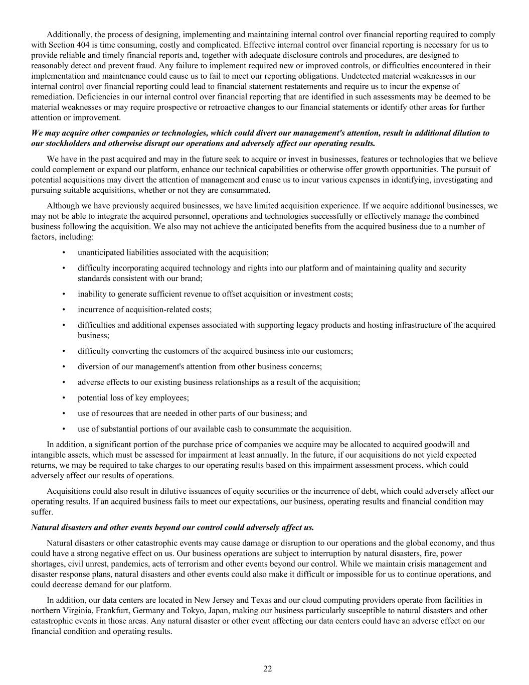 Additionally, the process of designing, implementing and maintaining internal control over financial reporting required to comply with Section 404 is time consuming, costly and complicated. Effective internal control over financial reporting is necessary for us to provide reliable and timely financial reports and, together with adequate disclosure controls and procedures, are designed to reasonably detect and prevent fraud. Any failure to implement required new or improved controls, or difficulties encountered in their implementation and maintenance could cause us to fail to meet our reporting obligations. Undetected material weaknesses in our internal control over financial reporting could lead to financial statement restatements and require us to incur the expense of remediation. Deficiencies in our internal control over financial reporting that are identified in such assessments may be deemed to be material weaknesses or may require prospective or retroactive changes to our financial statements or identify other areas for further attention or improvement. We may acquire other companies or technologies, which could divert our management's attention, result in additional dilution to our stockholders and otherwise disrupt our operations and adversely affect our operating results. We have in the past acquired and may in the future seek to acquire or invest in businesses, features or technologies that we believe could complement or expand our platform, enhance our technical capabilities or otherwise offer growth opportunities. The pursuit of potential acquisitions may divert the attention of management and cause us to incur various expenses in identifying, investigating and pursuing suitable acquisitions, whether or not they are consummated. Although we have previously acquired businesses, we have limited acquisition experience. If we acquire additional businesses, we may not be able to integrate the acquired personnel, operations and technologies successfully or effectively manage the combined business following the acquisition. We also may not achieve the anticipated benefits from the acquired business due to a number of factors, including: • unanticipated liabilities associated with the acquisition; • difficulty incorporating acquired technology and rights into our platform and of maintaining quality and security standards consistent with our brand; • inability to generate sufficient revenue to offset acquisition or investment costs; • incurrence of acquisition-related costs; • difficulties and additional expenses associated with supporting legacy products and hosting infrastructure of the acquired business; • difficulty converting the customers of the acquired business into our customers; • diversion of our management's attention from other business concerns; • adverse effects to our existing business relationships as a result of the acquisition; • potential loss of key employees; • use of resources that are needed in other parts of our business; and • use of substantial portions of our available cash to consummate the acquisition. In addition, a significant portion of the purchase price of companies we acquire may be allocated to acquired goodwill and intangible assets, which must be assessed for impairment at least annually. In the future, if our acquisitions do not yield expected returns, we may be required to take charges to our operating results based on this impairment assessment process, which could adversely affect our results of operations. Acquisitions could also result in dilutive issuances of equity securities or the incurrence of debt, which could adversely affect our operating results. If an acquired business fails to meet our expectations, our business, operating results and financial condition may suffer. Natural disasters and other events beyond our control could adversely affect us. Natural disasters or other catastrophic events may cause damage or disruption to our operations and the global economy, and thus could have a strong negative effect on us. Our business operations are subject to interruption by natural disasters, fire, power shortages, civil unrest, pandemics, acts of terrorism and other events beyond our control. While we maintain crisis management and disaster response plans, natural disasters and other events could also make it difficult or impossible for us to continue operations, and could decrease demand for our platform. In addition, our data centers are located in New Jersey and Texas and our cloud computing providers operate from facilities in northern Virginia, Frankfurt, Germany and Tokyo, Japan, making our business particularly susceptible to natural disasters and other catastrophic events in those areas. Any natural disaster or other event affecting our data centers could have an adverse effect on our financial condition and operating results. 22