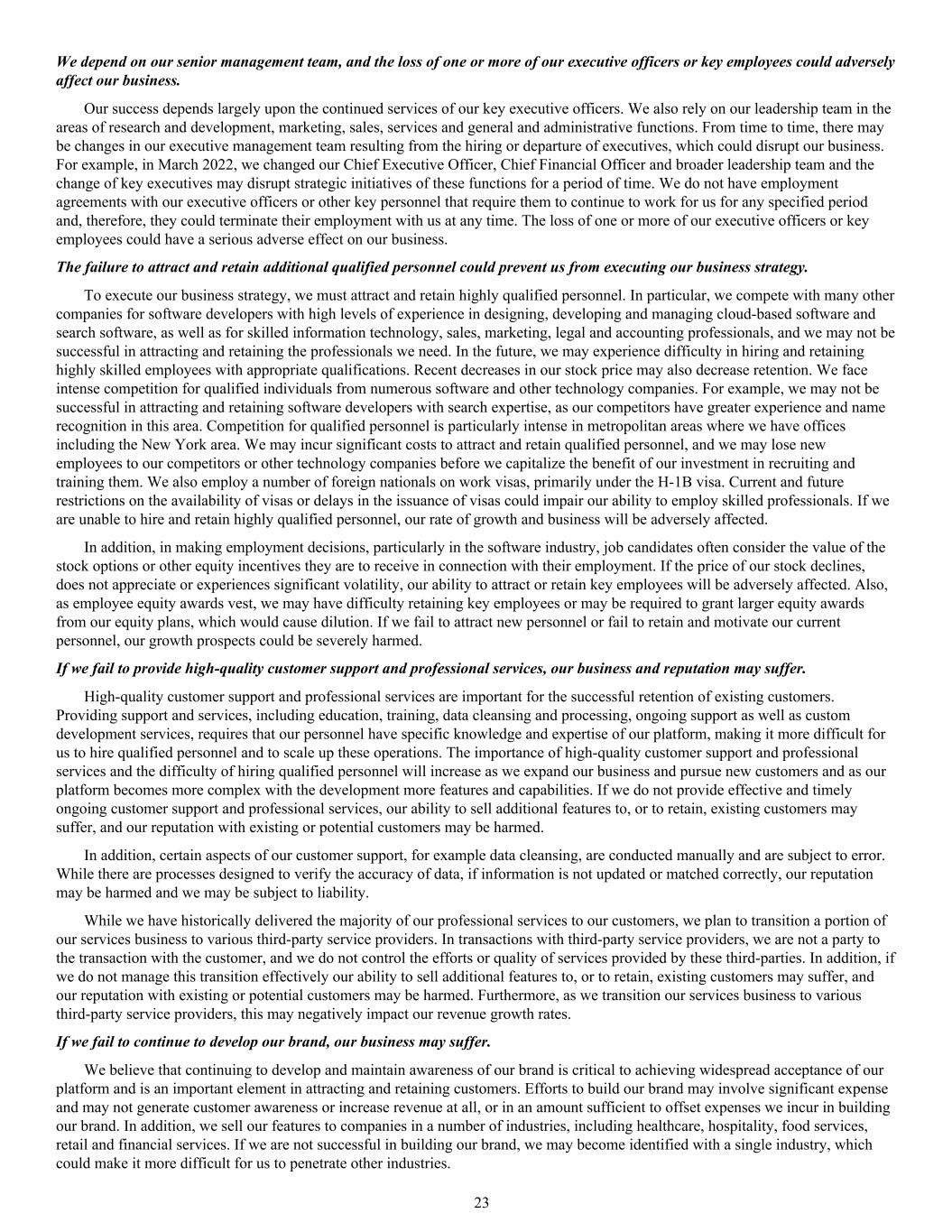 We depend on our senior management team, and the loss of one or more of our executive officers or key employees could adversely affect our business. Our success depends largely upon the continued services of our key executive officers. We also rely on our leadership team in the areas of research and development, marketing, sales, services and general and administrative functions. From time to time, there may be changes in our executive management team resulting from the hiring or departure of executives, which could disrupt our business. For example, in March 2022, we changed our Chief Executive Officer, Chief Financial Officer and broader leadership team and the change of key executives may disrupt strategic initiatives of these functions for a period of time. We do not have employment agreements with our executive officers or other key personnel that require them to continue to work for us for any specified period and, therefore, they could terminate their employment with us at any time. The loss of one or more of our executive officers or key employees could have a serious adverse effect on our business. The failure to attract and retain additional qualified personnel could prevent us from executing our business strategy. To execute our business strategy, we must attract and retain highly qualified personnel. In particular, we compete with many other companies for software developers with high levels of experience in designing, developing and managing cloud-based software and search software, as well as for skilled information technology, sales, marketing, legal and accounting professionals, and we may not be successful in attracting and retaining the professionals we need. In the future, we may experience difficulty in hiring and retaining highly skilled employees with appropriate qualifications. Recent decreases in our stock price may also decrease retention. We face intense competition for qualified individuals from numerous software and other technology companies. For example, we may not be successful in attracting and retaining software developers with search expertise, as our competitors have greater experience and name recognition in this area. Competition for qualified personnel is particularly intense in metropolitan areas where we have offices including the New York area. We may incur significant costs to attract and retain qualified personnel, and we may lose new employees to our competitors or other technology companies before we capitalize the benefit of our investment in recruiting and training them. We also employ a number of foreign nationals on work visas, primarily under the H-1B visa. Current and future restrictions on the availability of visas or delays in the issuance of visas could impair our ability to employ skilled professionals. If we are unable to hire and retain highly qualified personnel, our rate of growth and business will be adversely affected. In addition, in making employment decisions, particularly in the software industry, job candidates often consider the value of the stock options or other equity incentives they are to receive in connection with their employment. If the price of our stock declines, does not appreciate or experiences significant volatility, our ability to attract or retain key employees will be adversely affected. Also, as employee equity awards vest, we may have difficulty retaining key employees or may be required to grant larger equity awards from our equity plans, which would cause dilution. If we fail to attract new personnel or fail to retain and motivate our current personnel, our growth prospects could be severely harmed. If we fail to provide high-quality customer support and professional services, our business and reputation may suffer. High-quality customer support and professional services are important for the successful retention of existing customers. Providing support and services, including education, training, data cleansing and processing, ongoing support as well as custom development services, requires that our personnel have specific knowledge and expertise of our platform, making it more difficult for us to hire qualified personnel and to scale up these operations. The importance of high-quality customer support and professional services and the difficulty of hiring qualified personnel will increase as we expand our business and pursue new customers and as our platform becomes more complex with the development more features and capabilities. If we do not provide effective and timely ongoing customer support and professional services, our ability to sell additional features to, or to retain, existing customers may suffer, and our reputation with existing or potential customers may be harmed. In addition, certain aspects of our customer support, for example data cleansing, are conducted manually and are subject to error. While there are processes designed to verify the accuracy of data, if information is not updated or matched correctly, our reputation may be harmed and we may be subject to liability. While we have historically delivered the majority of our professional services to our customers, we plan to transition a portion of our services business to various third-party service providers. In transactions with third-party service providers, we are not a party to the transaction with the customer, and we do not control the efforts or quality of services provided by these third-parties. In addition, if we do not manage this transition effectively our ability to sell additional features to, or to retain, existing customers may suffer, and our reputation with existing or potential customers may be harmed. Furthermore, as we transition our services business to various third-party service providers, this may negatively impact our revenue growth rates. If we fail to continue to develop our brand, our business may suffer. We believe that continuing to develop and maintain awareness of our brand is critical to achiev