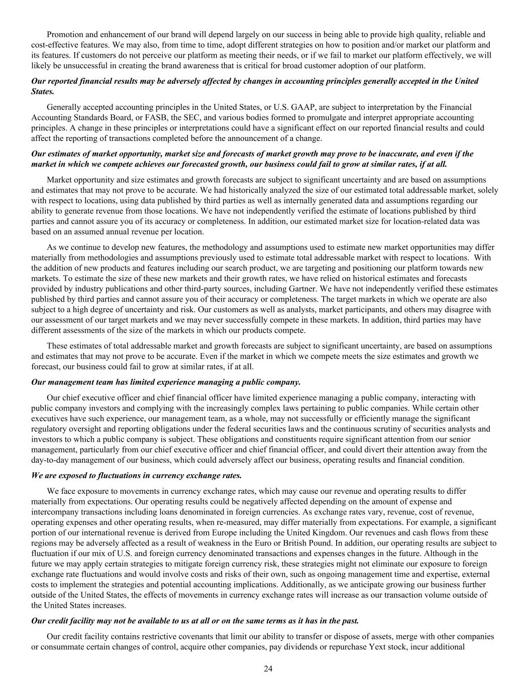 Promotion and enhancement of our brand will depend largely on our success in being able to provide high quality, reliable and cost-effective features. We may also, from time to time, adopt different strategies on how to position and/or market our platform and its features. If customers do not perceive our platform as meeting their needs, or if we fail to market our platform effectively, we will likely be unsuccessful in creating the brand awareness that is critical for broad customer adoption of our platform. Our reported financial results may be adversely affected by changes in accounting principles generally accepted in the United States. Generally accepted accounting principles in the United States, or U.S. GAAP, are subject to interpretation by the Financial Accounting Standards Board, or FASB, the SEC, and various bodies formed to promulgate and interpret appropriate accounting principles. A change in these principles or interpretations could have a significant effect on our reported financial results and could affect the reporting of transactions completed before the announcement of a change. Our estimates of market opportunity, market size and forecasts of market growth may prove to be inaccurate, and even if the market in which we compete achieves our forecasted growth, our business could fail to grow at similar rates, if at all. Market opportunity and size estimates and growth forecasts are subject to significant uncertainty and are based on assumptions and estimates that may not prove to be accurate. We had historically analyzed the size of our estimated total addressable market, solely with respect to locations, using data published by third parties as well as internally generated data and assumptions regarding our ability to generate revenue from those locations. We have not independently verified the estimate of locations published by third parties and cannot assure you of its accuracy or completeness. In addition, our estimated market size for location-related data was based on an assumed annual revenue per location. As we continue to develop new features, the methodology and assumptions used to estimate new market opportunities may differ materially from methodologies and assumptions previously used to estimate total addressable market with respect to locations. With the addition of new products and features including our search product, we are targeting and positioning our platform towards new markets. To estimate the size of these new markets and their growth rates, we have relied on historical estimates and forecasts provided by industry publications and other third-party sources, including Gartner. We have not independently verified these estimates published by third parties and cannot assure you of their accuracy or completeness. The target markets in which we operate are also subject to a high degree of uncertainty and risk. Our customers as well as analysts, market participants, and others may disagree with our assessment of our target markets and we may never successfully compete in these markets. In addition, third parties may have different assessments of the size of the markets in which our products compete. These estimates of total addressable market and growth forecasts are subject to significant uncertainty, are based on assumptions and estimates that may not prove to be accurate. Even if the market in which we compete meets the size estimates and growth we forecast, our business could fail to grow at similar rates, if at all. Our management team has limited experience managing a public company. Our chief executive officer and chief financial officer have limited experience managing a public company, interacting with public company investors and complying with the increasingly complex laws pertaining to public companies. While certain other executives have such experience, our management team, as a whole, may not successfully or efficiently manage the significant regulatory oversight and reporting obligations under the federal securities laws and the continuous scrutiny of securities analysts and investors to which a public company is subject. These obligations and constituents require significant attention from our senior management, particularly from our chief executive officer and chief financial officer, and could divert their attention away from the day-to-day management of our business, which could adversely affect our business, operating results and financial condition. We are exposed to fluctuations in currency exchange rates. We face exposure to movements in currency exchange rates, which may cause our revenue and operating results to differ materially from expectations. Our operating results could be negatively affected depending on the amount of expense and intercompany transactions including loans denominated in foreign currencies. As exchange rates vary, revenue, cost of revenue, operating expenses and other operating results, when re-measured, may differ materially from expectations. For example, a significant portion of our international revenue is derived from Europe including the United Kingdom. Our revenues and cash flows from these regions may be adversely affected as a result of weakness in the Euro or British Pound. In addition, our operating results are subject to fluctuation if our mix of U.S. and foreign currency denominated transactions and expenses changes in the future. Although in the future we may apply certain strategies to mitigate foreign currency risk, these strategies might not eliminate our exposure to foreign exchange rate fluctuations and would involve costs and risks of their own, such as ongoing management time and expertise, external costs to implement the strategies and potential accounting implications. Additionally, as we anticipate growing our business further outside of the United States, the effects of movements in currency exchange rates will increase as our transaction volume outside of the United States increas