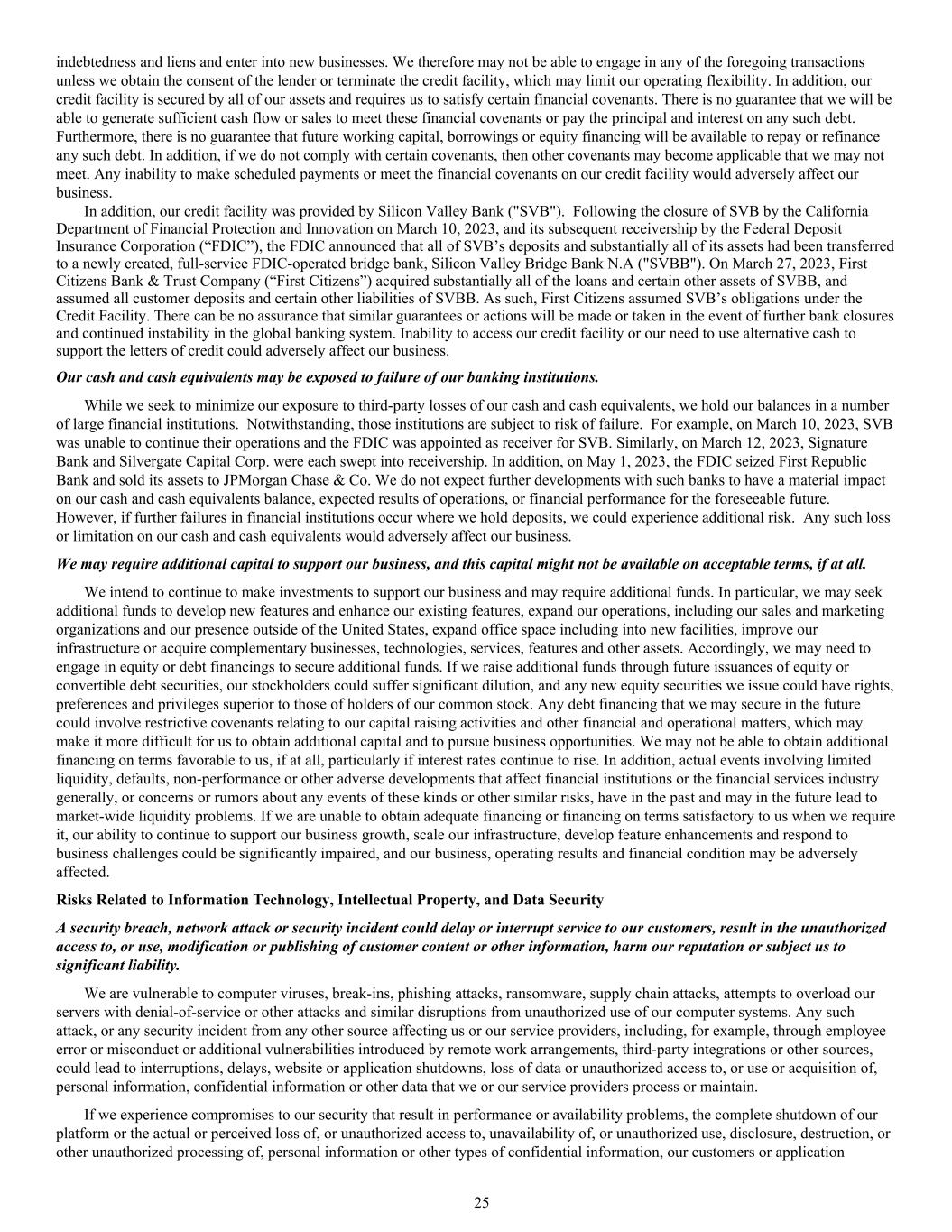 indebtedness and liens and enter into new businesses. We therefore may not be able to engage in any of the foregoing transactions unless we obtain the consent of the lender or terminate the credit facility, which may limit our operating flexibility. In addition, our credit facility is secured by all of our assets and requires us to satisfy certain financial covenants. There is no guarantee that we will be able to generate sufficient cash flow or sales to meet these financial covenants or pay the principal and interest on any such debt. Furthermore, there is no guarantee that future working capital, borrowings or equity financing will be available to repay or refinance any such debt. In addition, if we do not comply with certain covenants, then other covenants may become applicable that we may not meet. Any inability to make scheduled payments or meet the financial covenants on our credit facility would adversely affect our business. In addition, our credit facility was provided by Silicon Valley Bank ("SVB"). Following the closure of SVB by the California Department of Financial Protection and Innovation on March 10, 2023, and its subsequent receivership by the Federal Deposit Insurance Corporation (“FDIC”), the FDIC announced that all of SVB’s deposits and substantially all of its assets had been transferred to a newly created, full-service FDIC-operated bridge bank, Silicon Valley Bridge Bank N.A ("SVBB"). On March 27, 2023, First Citizens Bank & Trust Company (“First Citizens”) acquired substantially all of the loans and certain other assets of SVBB, and assumed all customer deposits and certain other liabilities of SVBB. As such, First Citizens assumed SVB’s obligations under the Credit Facility. There can be no assurance that similar guarantees or actions will be made or taken in the event of further bank closures and continued instability in the global banking system. Inability to access our credit facility or our need to use alternative cash to support the letters of credit could adversely affect our business. Our cash and cash equivalents may be exposed to failure of our banking institutions. While we seek to minimize our exposure to third-party losses of our cash and cash equivalents, we hold our balances in a number of large financial institutions. Notwithstanding, those institutions are subject to risk of failure. For example, on March 10, 2023, SVB was unable to continue their operations and the FDIC was appointed as receiver for SVB. Similarly, on March 12, 2023, Signature Bank and Silvergate Capital Corp. were each swept into receivership. In addition, on May 1, 2023, the FDIC seized First Republic Bank and sold its assets to JPMorgan Chase & Co. We do not expect further developments with such banks to have a material impact on our cash and cash equivalents balance, expected results of operations, or financial performance for the foreseeable future. However, if further failures in financial institutions occur where we hold deposits, we could experience additional risk. Any such loss or limitation on our cash and cash equivalents would adversely affect our business. We may require additional capital to support our business, and this capital might not be available on acceptable terms, if at all. We intend to continue to make investments to support our business and may require additional funds. In particular, we may seek additional funds to develop new features and enhance our existing features, expand our operations, including our sales and marketing organizations and our presence outside of the United States, expand office space including into new facilities, improve our infrastructure or acquire complementary businesses, technologies, services, features and other assets. Accordingly, we may need to engage in equity or debt financings to secure additional funds. If we raise additional funds through future issuances of equity or convertible debt securities, our stockholders could suffer significant dilution, and any new equity securities we issue could have rights, preferences and privileges superior to those of holders of our common stock. Any debt financing that we may secure in the future could involve restrictive covenants relating to our capital raising activities and other financial and operational matters, which may make it more difficult for us to obtain additional capital and to pursue business opportunities. We may not be able to obtain additional financing on terms favorable to us, if at all, particularly if interest rates continue to rise. In addition, actual events involving limited liquidity, defaults, non-performance or other adverse developments that affect financial institutions or the financial services industry generally, or concerns or rumors about any events of these kinds or other similar risks, have in the past and may in the future lead to market-wide liquidity problems. If we are unable to obtain adequate financing or financing on terms satisfactory to us when we require it, our ability to continue to support our business growth, scale our infrastructure, develop feature enhancements and respond to business challenges could be significantly impaired, and our business, operating results and financial condition may be adversely affected. Risks Related to Information Technology, Intellectual Property, and Data Security A security breach, network attack or security incident could delay or interrupt service to our customers, result in the unauthorized access to, or use, modification or publishing of customer content or other information, harm our reputation or subject us to significant liability. We are vulnerable to computer viruses, break-ins, phishing attacks, ransomware, supply chain attacks, attempts to overload our servers with denial-of-service or other attacks and similar disruptions from unauthorized use of our computer systems. Any such attack, or any security incident from any other source affecting us or our service providers, inclu