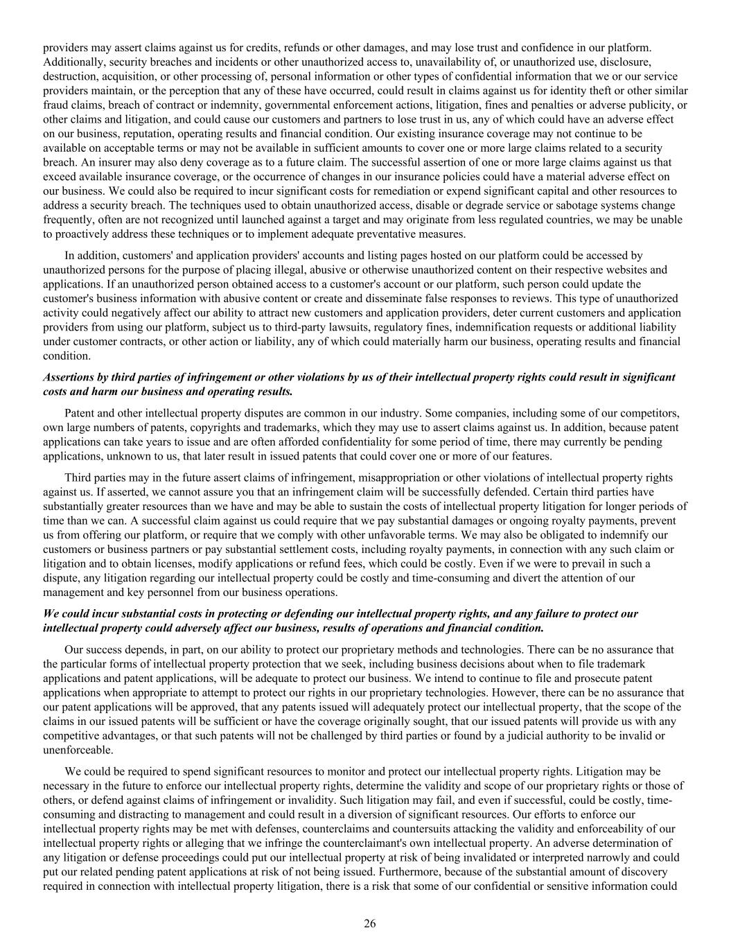 providers may assert claims against us for credits, refunds or other damages, and may lose trust and confidence in our platform. Additionally, security breaches and incidents or other unauthorized access to, unavailability of, or unauthorized use, disclosure, destruction, acquisition, or other processing of, personal information or other types of confidential information that we or our service providers maintain, or the perception that any of these have occurred, could result in claims against us for identity theft or other similar fraud claims, breach of contract or indemnity, governmental enforcement actions, litigation, fines and penalties or adverse publicity, or other claims and litigation, and could cause our customers and partners to lose trust in us, any of which could have an adverse effect on our business, reputation, operating results and financial condition. Our existing insurance coverage may not continue to be available on acceptable terms or may not be available in sufficient amounts to cover one or more large claims related to a security breach. An insurer may also deny coverage as to a future claim. The successful assertion of one or more large claims against us that exceed available insurance coverage, or the occurrence of changes in our insurance policies could have a material adverse effect on our business. We could also be required to incur significant costs for remediation or expend significant capital and other resources to address a security breach. The techniques used to obtain unauthorized access, disable or degrade service or sabotage systems change frequently, often are not recognized until launched against a target and may originate from less regulated countries, we may be unable to proactively address these techniques or to implement adequate preventative measures. In addition, customers' and application providers' accounts and listing pages hosted on our platform could be accessed by unauthorized persons for the purpose of placing illegal, abusive or otherwise unauthorized content on their respective websites and applications. If an unauthorized person obtained access to a customer's account or our platform, such person could update the customer's business information with abusive content or create and disseminate false responses to reviews. This type of unauthorized activity could negatively affect our ability to attract new customers and application providers, deter current customers and application providers from using our platform, subject us to third-party lawsuits, regulatory fines, indemnification requests or additional liability under customer contracts, or other action or liability, any of which could materially harm our business, operating results and financial condition. Assertions by third parties of infringement or other violations by us of their intellectual property rights could result in significant costs and harm our business and operating results. Patent and other intellectual property disputes are common in our industry. Some companies, including some of our competitors, own large numbers of patents, copyrights and trademarks, which they may use to assert claims against us. In addition, because patent applications can take years to issue and are often afforded confidentiality for some period of time, there may currently be pending applications, unknown to us, that later result in issued patents that could cover one or more of our features. Third parties may in the future assert claims of infringement, misappropriation or other violations of intellectual property rights against us. If asserted, we cannot assure you that an infringement claim will be successfully defended. Certain third parties have substantially greater resources than we have and may be able to sustain the costs of intellectual property litigation for longer periods of time than we can. A successful claim against us could require that we pay substantial damages or ongoing royalty payments, prevent us from offering our platform, or require that we comply with other unfavorable terms. We may also be obligated to indemnify our customers or business partners or pay substantial settlement costs, including royalty payments, in connection with any such claim or litigation and to obtain licenses, modify applications or refund fees, which could be costly. Even if we were to prevail in such a dispute, any litigation regarding our intellectual property could be costly and time-consuming and divert the attention of our management and key personnel from our business operations. We could incur substantial costs in protecting or defending our intellectual property rights, and any failure to protect our intellectual property could adversely affect our business, results of operations and financial condition. Our success depends, in part, on our ability to protect our proprietary methods and technologies. There can be no assurance that the particular forms of intellectual property protection that we seek, including business decisions about when to file trademark applications and patent applications, will be adequate to protect our business. We intend to continue to file and prosecute patent applications when appropriate to attempt to protect our rights in our proprietary technologies. However, there can be no assurance that our patent applications will be approved, that any patents issued will adequately protect our intellectual property, that the scope of the claims in our issued patents will be sufficient or have the coverage originally sought, that our issued patents will provide us with any competitive advantages, or that such patents will not be challenged by third parties or found by a judicial authority to be invalid or unenforceable. We could be required to spend significant resources to monitor and protect our intellectual property rights. Litigation may be necessary in the future to enforce our intellectual property rights, determine the validity and scope of our proprietary right
