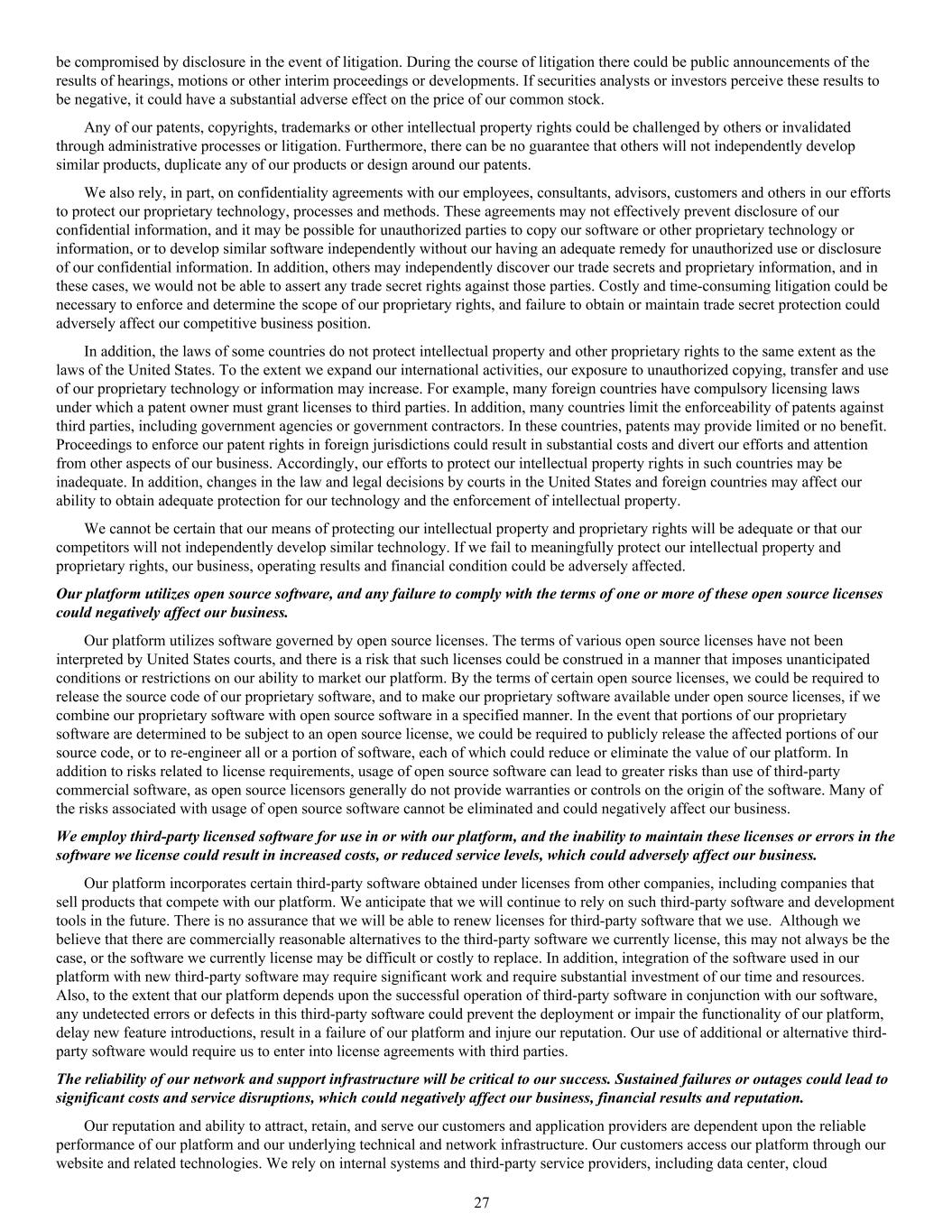 be compromised by disclosure in the event of litigation. During the course of litigation there could be public announcements of the results of hearings, motions or other interim proceedings or developments. If securities analysts or investors perceive these results to be negative, it could have a substantial adverse effect on the price of our common stock. Any of our patents, copyrights, trademarks or other intellectual property rights could be challenged by others or invalidated through administrative processes or litigation. Furthermore, there can be no guarantee that others will not independently develop similar products, duplicate any of our products or design around our patents. We also rely, in part, on confidentiality agreements with our employees, consultants, advisors, customers and others in our efforts to protect our proprietary technology, processes and methods. These agreements may not effectively prevent disclosure of our confidential information, and it may be possible for unauthorized parties to copy our software or other proprietary technology or information, or to develop similar software independently without our having an adequate remedy for unauthorized use or disclosure of our confidential information. In addition, others may independently discover our trade secrets and proprietary information, and in these cases, we would not be able to assert any trade secret rights against those parties. Costly and time-consuming litigation could be necessary to enforce and determine the scope of our proprietary rights, and failure to obtain or maintain trade secret protection could adversely affect our competitive business position. In addition, the laws of some countries do not protect intellectual property and other proprietary rights to the same extent as the laws of the United States. To the extent we expand our international activities, our exposure to unauthorized copying, transfer and use of our proprietary technology or information may increase. For example, many foreign countries have compulsory licensing laws under which a patent owner must grant licenses to third parties. In addition, many countries limit the enforceability of patents against third parties, including government agencies or government contractors. In these countries, patents may provide limited or no benefit. Proceedings to enforce our patent rights in foreign jurisdictions could result in substantial costs and divert our efforts and attention from other aspects of our business. Accordingly, our efforts to protect our intellectual property rights in such countries may be inadequate. In addition, changes in the law and legal decisions by courts in the United States and foreign countries may affect our ability to obtain adequate protection for our technology and the enforcement of intellectual property. We cannot be certain that our means of protecting our intellectual property and proprietary rights will be adequate or that our competitors will not independently develop similar technology. If we fail to meaningfully protect our intellectual property and proprietary rights, our business, operating results and financial condition could be adversely affected. Our platform utilizes open source software, and any failure to comply with the terms of one or more of these open source licenses could negatively affect our business. Our platform utilizes software governed by open source licenses. The terms of various open source licenses have not been interpreted by United States courts, and there is a risk that such licenses could be construed in a manner that imposes unanticipated conditions or restrictions on our ability to market our platform. By the terms of certain open source licenses, we could be required to release the source code of our proprietary software, and to make our proprietary software available under open source licenses, if we combine our proprietary software with open source software in a specified manner. In the event that portions of our proprietary software are determined to be subject to an open source license, we could be required to publicly release the affected portions of our source code, or to re-engineer all or a portion of software, each of which could reduce or eliminate the value of our platform. In addition to risks related to license requirements, usage of open source software can lead to greater risks than use of third-party commercial software, as open source licensors generally do not provide warranties or controls on the origin of the software. Many of the risks associated with usage of open source software cannot be eliminated and could negatively affect our business. We employ third-party licensed software for use in or with our platform, and the inability to maintain these licenses or errors in the software we license could result in increased costs, or reduced service levels, which could adversely affect our business. Our platform incorporates certain third-party software obtained under licenses from other companies, including companies that sell products that compete with our platform. We anticipate that we will continue to rely on such third-party software and development tools in the future. There is no assurance that we will be able to renew licenses for third-party software that we use. Although we believe that there are commercially reasonable alternatives to the third-party software we currently license, this may not always be the case, or the software we currently license may be difficult or costly to replace. In addition, integration of the software used in our platform with new third-party software may require significant work and require substantial investment of our time and resources. Also, to the extent that our platform depends upon the successful operation of third-party software in conjunction with our software, any undetected errors or defects in this third-party software could prevent the deployment or impair the functionality of our platform, delay ne