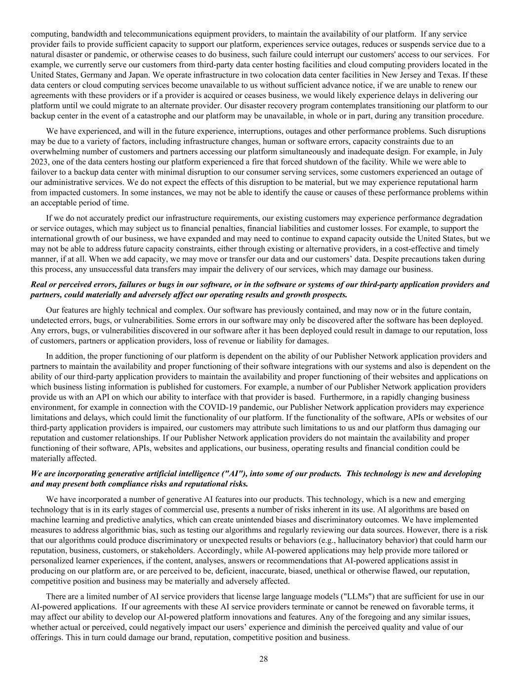 computing, bandwidth and telecommunications equipment providers, to maintain the availability of our platform. If any service provider fails to provide sufficient capacity to support our platform, experiences service outages, reduces or suspends service due to a natural disaster or pandemic, or otherwise ceases to do business, such failure could interrupt our customers' access to our services. For example, we currently serve our customers from third-party data center hosting facilities and cloud computing providers located in the United States, Germany and Japan. We operate infrastructure in two colocation data center facilities in New Jersey and Texas. If these data centers or cloud computing services become unavailable to us without sufficient advance notice, if we are unable to renew our agreements with these providers or if a provider is acquired or ceases business, we would likely experience delays in delivering our platform until we could migrate to an alternate provider. Our disaster recovery program contemplates transitioning our platform to our backup center in the event of a catastrophe and our platform may be unavailable, in whole or in part, during any transition procedure. We have experienced, and will in the future experience, interruptions, outages and other performance problems. Such disruptions may be due to a variety of factors, including infrastructure changes, human or software errors, capacity constraints due to an overwhelming number of customers and partners accessing our platform simultaneously and inadequate design. For example, in July 2023, one of the data centers hosting our platform experienced a fire that forced shutdown of the facility. While we were able to failover to a backup data center with minimal disruption to our consumer serving services, some customers experienced an outage of our administrative services. We do not expect the effects of this disruption to be material, but we may experience reputational harm from impacted customers. In some instances, we may not be able to identify the cause or causes of these performance problems within an acceptable period of time. If we do not accurately predict our infrastructure requirements, our existing customers may experience performance degradation or service outages, which may subject us to financial penalties, financial liabilities and customer losses. For example, to support the international growth of our business, we have expanded and may need to continue to expand capacity outside the United States, but we may not be able to address future capacity constraints, either through existing or alternative providers, in a cost-effective and timely manner, if at all. When we add capacity, we may move or transfer our data and our customers’ data. Despite precautions taken during this process, any unsuccessful data transfers may impair the delivery of our services, which may damage our business. Real or perceived errors, failures or bugs in our software, or in the software or systems of our third-party application providers and partners, could materially and adversely affect our operating results and growth prospects. Our features are highly technical and complex. Our software has previously contained, and may now or in the future contain, undetected errors, bugs, or vulnerabilities. Some errors in our software may only be discovered after the software has been deployed. Any errors, bugs, or vulnerabilities discovered in our software after it has been deployed could result in damage to our reputation, loss of customers, partners or application providers, loss of revenue or liability for damages. In addition, the proper functioning of our platform is dependent on the ability of our Publisher Network application providers and partners to maintain the availability and proper functioning of their software integrations with our systems and also is dependent on the ability of our third-party application providers to maintain the availability and proper functioning of their websites and applications on which business listing information is published for customers. For example, a number of our Publisher Network application providers provide us with an API on which our ability to interface with that provider is based. Furthermore, in a rapidly changing business environment, for example in connection with the COVID-19 pandemic, our Publisher Network application providers may experience limitations and delays, which could limit the functionality of our platform. If the functionality of the software, APIs or websites of our third-party application providers is impaired, our customers may attribute such limitations to us and our platform thus damaging our reputation and customer relationships. If our Publisher Network application providers do not maintain the availability and proper functioning of their software, APIs, websites and applications, our business, operating results and financial condition could be materially affected. We are incorporating generative artificial intelligence ("AI"), into some of our products. This technology is new and developing and may present both compliance risks and reputational risks. We have incorporated a number of generative AI features into our products. This technology, which is a new and emerging technology that is in its early stages of commercial use, presents a number of risks inherent in its use. AI algorithms are based on machine learning and predictive analytics, which can create unintended biases and discriminatory outcomes. We have implemented measures to address algorithmic bias, such as testing our algorithms and regularly reviewing our data sources. However, there is a risk that our algorithms could produce discriminatory or unexpected results or behaviors (e.g., hallucinatory behavior) that could harm our reputation, business, customers, or stakeholders. Accordingly, while AI-powered applications may help provide more tailored or personalized learner experiences, if the