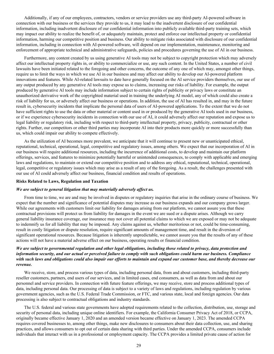 Additionally, if any of our employees, contractors, vendors or service providers use any third-party AI-powered software in connection with our business or the services they provide to us, it may lead to the inadvertent disclosure of our confidential information, including inadvertent disclosure of our confidential information into publicly available third-party training sets, which may impact our ability to realize the benefit of, or adequately maintain, protect and enforce our intellectual property or confidential information, harming our competitive position and business. Our ability to mitigate risks associated with disclosure of our confidential information, including in connection with AI-powered software, will depend on our implementation, maintenance, monitoring and enforcement of appropriate technical and administrative safeguards, policies and procedures governing the use of AI in our business. Furthermore, any content created by us using generative AI tools may not be subject to copyright protection which may adversely affect our intellectual property rights in, or ability to commercialize or use, any such content. In the United States, a number of civil lawsuits have been initiated related to the foregoing and other concerns, the outcome of any one of which may, amongst other things, require us to limit the ways in which we use AI in our business and may affect our ability to develop our AI-powered platform innovations and features. While AI-related lawsuits to date have generally focused on the AI service providers themselves, our use of any output produced by any generative AI tools may expose us to claims, increasing our risks of liability. For example, the output produced by generative AI tools may include information subject to certain rights of publicity or privacy laws or constitute an unauthorized derivative work of the copyrighted material used in training the underlying AI model, any of which could also create a risk of liability for us, or adversely affect our business or operations. In addition, the use of AI has resulted in, and may in the future result in, cybersecurity incidents that implicate the personal data of users of AI-powered applications. To the extent that we do not have sufficient rights to use the data or other material or content used in or produced by the generative AI tools used in our business, or if we experience cybersecurity incidents in connection with our use of AI, it could adversely affect our reputation and expose us to legal liability or regulatory risk, including with respect to third-party intellectual property, privacy, publicity, contractual or other rights. Further, our competitors or other third parties may incorporate AI into their products more quickly or more successfully than us, which could impair our ability to compete effectively. As the utilization of AI becomes more prevalent, we anticipate that it will continue to present new or unanticipated ethical, reputational, technical, operational, legal, competitive and regulatory issues, among others. We expect that our incorporation of AI in our business will require additional resources, including the incurrence of additional costs, to develop and maintain our platform offerings, services, and features to minimize potentially harmful or unintended consequences, to comply with applicable and emerging laws and regulations, to maintain or extend our competitive position and to address any ethical, reputational, technical, operational, legal, competitive or regulatory issues which may arise as a result of any of the foregoing. As a result, the challenges presented with our use of AI could adversely affect our business, financial condition and results of operations. Risks Related to Laws, Regulation and Taxation We are subject to general litigation that may materially adversely affect us. From time to time, we are and may be involved in disputes or regulatory inquiries that arise in the ordinary course of business. We expect that the number and significance of potential disputes may increase as our business expands and our company grows larger. While our agreements with customers limit our liability for damages arising from our platform, we cannot assure you that these contractual provisions will protect us from liability for damages in the event we are sued or a dispute arises. Although we carry general liability insurance coverage, our insurance may not cover all potential claims to which we are exposed or may not be adequate to indemnify us for all liability that may be imposed. Any claims against us, whether meritorious or not, could be time-consuming, result in costly litigation or dispute resolution, require significant amounts of management time, and result in the diversion of significant operational resources. Because litigation is inherently unpredictable, we cannot assure you that the results of any of these actions will not have a material adverse effect on our business, operating results or financial condition. We are subject to governmental regulation and other legal obligations, including those related to privacy, data protection and information security, and our actual or perceived failure to comply with such obligations could harm our business. Compliance with such laws and obligations could also impair our efforts to maintain and expand our customer base, and thereby decrease our revenue. We receive, store, and process various types of data, including personal data, from and about customers, including third-party reseller customers, partners, end users of our services, and in limited cases, end consumers, as well as data from and about our personnel and service providers. In connection with future feature offerings, we may receive, store and process additional types of data, including personal data. Our processing of data is subject to a variety of laws and regulations, including regulation by various government agencies, such as the U.S. Federal Trade Commission, 