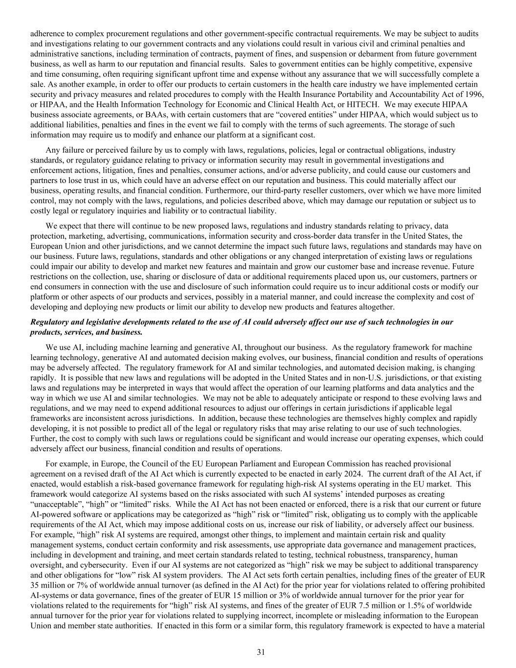 adherence to complex procurement regulations and other government-specific contractual requirements. We may be subject to audits and investigations relating to our government contracts and any violations could result in various civil and criminal penalties and administrative sanctions, including termination of contracts, payment of fines, and suspension or debarment from future government business, as well as harm to our reputation and financial results. Sales to government entities can be highly competitive, expensive and time consuming, often requiring significant upfront time and expense without any assurance that we will successfully complete a sale. As another example, in order to offer our products to certain customers in the health care industry we have implemented certain security and privacy measures and related procedures to comply with the Health Insurance Portability and Accountability Act of 1996, or HIPAA, and the Health Information Technology for Economic and Clinical Health Act, or HITECH. We may execute HIPAA business associate agreements, or BAAs, with certain customers that are “covered entities” under HIPAA, which would subject us to additional liabilities, penalties and fines in the event we fail to comply with the terms of such agreements. The storage of such information may require us to modify and enhance our platform at a significant cost. Any failure or perceived failure by us to comply with laws, regulations, policies, legal or contractual obligations, industry standards, or regulatory guidance relating to privacy or information security may result in governmental investigations and enforcement actions, litigation, fines and penalties, consumer actions, and/or adverse publicity, and could cause our customers and partners to lose trust in us, which could have an adverse effect on our reputation and business. This could materially affect our business, operating results, and financial condition. Furthermore, our third-party reseller customers, over which we have more limited control, may not comply with the laws, regulations, and policies described above, which may damage our reputation or subject us to costly legal or regulatory inquiries and liability or to contractual liability. We expect that there will continue to be new proposed laws, regulations and industry standards relating to privacy, data protection, marketing, advertising, communications, information security and cross-border data transfer in the United States, the European Union and other jurisdictions, and we cannot determine the impact such future laws, regulations and standards may have on our business. Future laws, regulations, standards and other obligations or any changed interpretation of existing laws or regulations could impair our ability to develop and market new features and maintain and grow our customer base and increase revenue. Future restrictions on the collection, use, sharing or disclosure of data or additional requirements placed upon us, our customers, partners or end consumers in connection with the use and disclosure of such information could require us to incur additional costs or modify our platform or other aspects of our products and services, possibly in a material manner, and could increase the complexity and cost of developing and deploying new products or limit our ability to develop new products and features altogether. Regulatory and legislative developments related to the use of AI could adversely affect our use of such technologies in our products, services, and business. We use AI, including machine learning and generative AI, throughout our business. As the regulatory framework for machine learning technology, generative AI and automated decision making evolves, our business, financial condition and results of operations may be adversely affected. The regulatory framework for AI and similar technologies, and automated decision making, is changing rapidly. It is possible that new laws and regulations will be adopted in the United States and in non-U.S. jurisdictions, or that existing laws and regulations may be interpreted in ways that would affect the operation of our learning platforms and data analytics and the way in which we use AI and similar technologies. We may not be able to adequately anticipate or respond to these evolving laws and regulations, and we may need to expend additional resources to adjust our offerings in certain jurisdictions if applicable legal frameworks are inconsistent across jurisdictions. In addition, because these technologies are themselves highly complex and rapidly developing, it is not possible to predict all of the legal or regulatory risks that may arise relating to our use of such technologies. Further, the cost to comply with such laws or regulations could be significant and would increase our operating expenses, which could adversely affect our business, financial condition and results of operations. For example, in Europe, the Council of the EU European Parliament and European Commission has reached provisional agreement on a revised draft of the AI Act which is currently expected to be enacted in early 2024. The current draft of the AI Act, if enacted, would establish a risk-based governance framework for regulating high-risk AI systems operating in the EU market. This framework would categorize AI systems based on the risks associated with such AI systems’ intended purposes as creating “unacceptable”, “high” or “limited” risks. While the AI Act has not been enacted or enforced, there is a risk that our current or future AI-powered software or applications may be categorized as “high” risk or “limited” risk, obligating us to comply with the applicable requirements of the AI Act, which may impose additional costs on us, increase our risk of liability, or adversely affect our business. For example, “high” risk AI systems are required, amongst other things, to implement and maintain certain risk a
