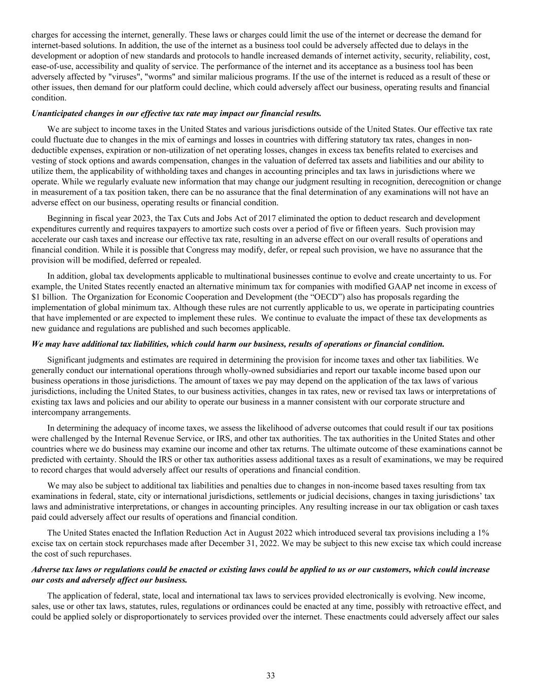 charges for accessing the internet, generally. These laws or charges could limit the use of the internet or decrease the demand for internet-based solutions. In addition, the use of the internet as a business tool could be adversely affected due to delays in the development or adoption of new standards and protocols to handle increased demands of internet activity, security, reliability, cost, ease-of-use, accessibility and quality of service. The performance of the internet and its acceptance as a business tool has been adversely affected by "viruses", "worms" and similar malicious programs. If the use of the internet is reduced as a result of these or other issues, then demand for our platform could decline, which could adversely affect our business, operating results and financial condition. Unanticipated changes in our effective tax rate may impact our financial results. We are subject to income taxes in the United States and various jurisdictions outside of the United States. Our effective tax rate could fluctuate due to changes in the mix of earnings and losses in countries with differing statutory tax rates, changes in non- deductible expenses, expiration or non-utilization of net operating losses, changes in excess tax benefits related to exercises and vesting of stock options and awards compensation, changes in the valuation of deferred tax assets and liabilities and our ability to utilize them, the applicability of withholding taxes and changes in accounting principles and tax laws in jurisdictions where we operate. While we regularly evaluate new information that may change our judgment resulting in recognition, derecognition or change in measurement of a tax position taken, there can be no assurance that the final determination of any examinations will not have an adverse effect on our business, operating results or financial condition. Beginning in fiscal year 2023, the Tax Cuts and Jobs Act of 2017 eliminated the option to deduct research and development expenditures currently and requires taxpayers to amortize such costs over a period of five or fifteen years. Such provision may accelerate our cash taxes and increase our effective tax rate, resulting in an adverse effect on our overall results of operations and financial condition. While it is possible that Congress may modify, defer, or repeal such provision, we have no assurance that the provision will be modified, deferred or repealed. In addition, global tax developments applicable to multinational businesses continue to evolve and create uncertainty to us. For example, the United States recently enacted an alternative minimum tax for companies with modified GAAP net income in excess of $1 billion. The Organization for Economic Cooperation and Development (the “OECD”) also has proposals regarding the implementation of global minimum tax. Although these rules are not currently applicable to us, we operate in participating countries that have implemented or are expected to implement these rules. We continue to evaluate the impact of these tax developments as new guidance and regulations are published and such becomes applicable. We may have additional tax liabilities, which could harm our business, results of operations or financial condition. Significant judgments and estimates are required in determining the provision for income taxes and other tax liabilities. We generally conduct our international operations through wholly-owned subsidiaries and report our taxable income based upon our business operations in those jurisdictions. The amount of taxes we pay may depend on the application of the tax laws of various jurisdictions, including the United States, to our business activities, changes in tax rates, new or revised tax laws or interpretations of existing tax laws and policies and our ability to operate our business in a manner consistent with our corporate structure and intercompany arrangements. In determining the adequacy of income taxes, we assess the likelihood of adverse outcomes that could result if our tax positions were challenged by the Internal Revenue Service, or IRS, and other tax authorities. The tax authorities in the United States and other countries where we do business may examine our income and other tax returns. The ultimate outcome of these examinations cannot be predicted with certainty. Should the IRS or other tax authorities assess additional taxes as a result of examinations, we may be required to record charges that would adversely affect our results of operations and financial condition. We may also be subject to additional tax liabilities and penalties due to changes in non-income based taxes resulting from tax examinations in federal, state, city or international jurisdictions, settlements or judicial decisions, changes in taxing jurisdictions’ tax laws and administrative interpretations, or changes in accounting principles. Any resulting increase in our tax obligation or cash taxes paid could adversely affect our results of operations and financial condition. The United States enacted the Inflation Reduction Act in August 2022 which introduced several tax provisions including a 1% excise tax on certain stock repurchases made after December 31, 2022. We may be subject to this new excise tax which could increase the cost of such repurchases. Adverse tax laws or regulations could be enacted or existing laws could be applied to us or our customers, which could increase our costs and adversely affect our business. The application of federal, state, local and international tax laws to services provided electronically is evolving. New income, sales, use or other tax laws, statutes, rules, regulations or ordinances could be enacted at any time, possibly with retroactive effect, and could be applied solely or disproportionately to services provided over the internet. These enactments could adversely affect our sales 33