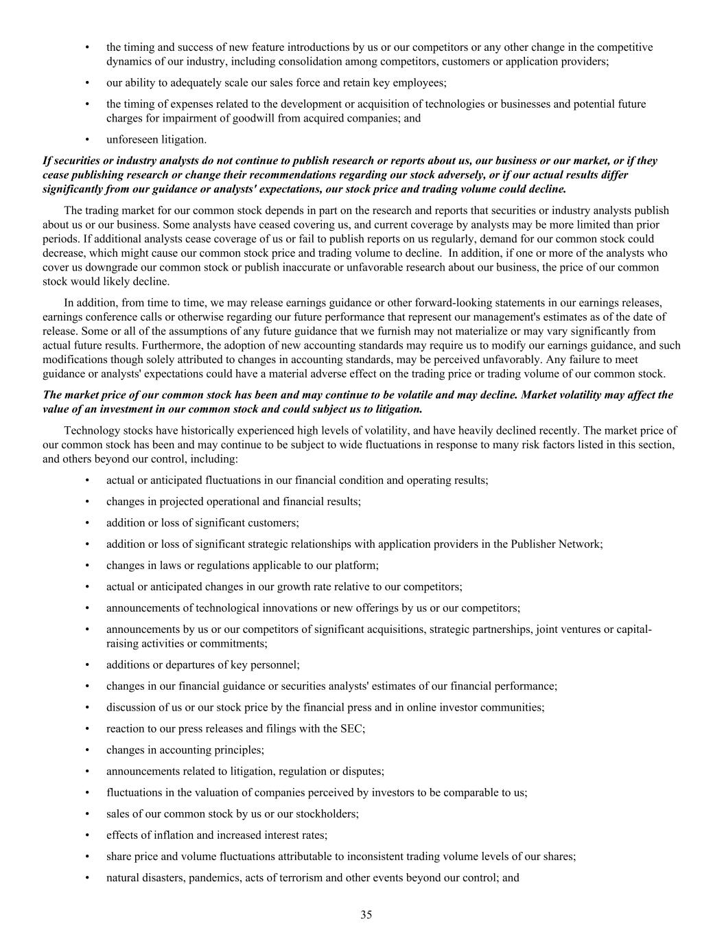 • the timing and success of new feature introductions by us or our competitors or any other change in the competitive dynamics of our industry, including consolidation among competitors, customers or application providers; • our ability to adequately scale our sales force and retain key employees; • the timing of expenses related to the development or acquisition of technologies or businesses and potential future charges for impairment of goodwill from acquired companies; and • unforeseen litigation. If securities or industry analysts do not continue to publish research or reports about us, our business or our market, or if they cease publishing research or change their recommendations regarding our stock adversely, or if our actual results differ significantly from our guidance or analysts' expectations, our stock price and trading volume could decline. The trading market for our common stock depends in part on the research and reports that securities or industry analysts publish about us or our business. Some analysts have ceased covering us, and current coverage by analysts may be more limited than prior periods. If additional analysts cease coverage of us or fail to publish reports on us regularly, demand for our common stock could decrease, which might cause our common stock price and trading volume to decline. In addition, if one or more of the analysts who cover us downgrade our common stock or publish inaccurate or unfavorable research about our business, the price of our common stock would likely decline. In addition, from time to time, we may release earnings guidance or other forward-looking statements in our earnings releases, earnings conference calls or otherwise regarding our future performance that represent our management's estimates as of the date of release. Some or all of the assumptions of any future guidance that we furnish may not materialize or may vary significantly from actual future results. Furthermore, the adoption of new accounting standards may require us to modify our earnings guidance, and such modifications though solely attributed to changes in accounting standards, may be perceived unfavorably. Any failure to meet guidance or analysts' expectations could have a material adverse effect on the trading price or trading volume of our common stock. The market price of our common stock has been and may continue to be volatile and may decline. Market volatility may affect the value of an investment in our common stock and could subject us to litigation. Technology stocks have historically experienced high levels of volatility, and have heavily declined recently. The market price of our common stock has been and may continue to be subject to wide fluctuations in response to many risk factors listed in this section, and others beyond our control, including: • actual or anticipated fluctuations in our financial condition and operating results; • changes in projected operational and financial results; • addition or loss of significant customers; • addition or loss of significant strategic relationships with application providers in the Publisher Network; • changes in laws or regulations applicable to our platform; • actual or anticipated changes in our growth rate relative to our competitors; • announcements of technological innovations or new offerings by us or our competitors; • announcements by us or our competitors of significant acquisitions, strategic partnerships, joint ventures or capital- raising activities or commitments; • additions or departures of key personnel; • changes in our financial guidance or securities analysts' estimates of our financial performance; • discussion of us or our stock price by the financial press and in online investor communities; • reaction to our press releases and filings with the SEC; • changes in accounting principles; • announcements related to litigation, regulation or disputes; • fluctuations in the valuation of companies perceived by investors to be comparable to us; • sales of our common stock by us or our stockholders; • effects of inflation and increased interest rates; • share price and volume fluctuations attributable to inconsistent trading volume levels of our shares; • natural disasters, pandemics, acts of terrorism and other events beyond our control; and 35