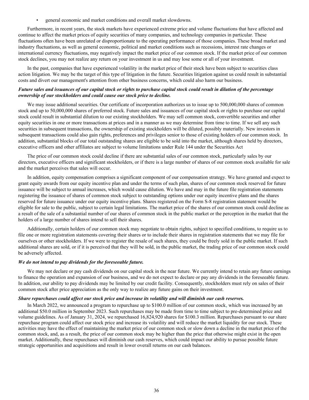 • general economic and market conditions and overall market slowdowns. Furthermore, in recent years, the stock markets have experienced extreme price and volume fluctuations that have affected and continue to affect the market prices of equity securities of many companies, and technology companies in particular. These fluctuations often have been unrelated or disproportionate to the operating performance of those companies. These broad market and industry fluctuations, as well as general economic, political and market conditions such as recessions, interest rate changes or international currency fluctuations, may negatively impact the market price of our common stock. If the market price of our common stock declines, you may not realize any return on your investment in us and may lose some or all of your investment. In the past, companies that have experienced volatility in the market price of their stock have been subject to securities class action litigation. We may be the target of this type of litigation in the future. Securities litigation against us could result in substantial costs and divert our management's attention from other business concerns, which could also harm our business. Future sales and issuances of our capital stock or rights to purchase capital stock could result in dilution of the percentage ownership of our stockholders and could cause our stock price to decline. We may issue additional securities. Our certificate of incorporation authorizes us to issue up to 500,000,000 shares of common stock and up to 50,000,000 shares of preferred stock. Future sales and issuances of our capital stock or rights to purchase our capital stock could result in substantial dilution to our existing stockholders. We may sell common stock, convertible securities and other equity securities in one or more transactions at prices and in a manner as we may determine from time to time. If we sell any such securities in subsequent transactions, the ownership of existing stockholders will be diluted, possibly materially. New investors in subsequent transactions could also gain rights, preferences and privileges senior to those of existing holders of our common stock. In addition, substantial blocks of our total outstanding shares are eligible to be sold into the market, although shares held by directors, executive officers and other affiliates are subject to volume limitations under Rule 144 under the Securities Act The price of our common stock could decline if there are substantial sales of our common stock, particularly sales by our directors, executive officers and significant stockholders, or if there is a large number of shares of our common stock available for sale and the market perceives that sales will occur. In addition, equity compensation comprises a significant component of our compensation strategy. We have granted and expect to grant equity awards from our equity incentive plan and under the terms of such plan, shares of our common stock reserved for future issuance will be subject to annual increases, which would cause dilution. We have and may in the future file registration statements registering the issuance of shares of common stock subject to outstanding options under our equity incentive plans and the shares reserved for future issuance under our equity incentive plans. Shares registered on the Form S-8 registration statement would be eligible for sale to the public, subject to certain legal limitations. The market price of the shares of our common stock could decline as a result of the sale of a substantial number of our shares of common stock in the public market or the perception in the market that the holders of a large number of shares intend to sell their shares. Additionally, certain holders of our common stock may negotiate to obtain rights, subject to specified conditions, to require us to file one or more registration statements covering their shares or to include their shares in registration statements that we may file for ourselves or other stockholders. If we were to register the resale of such shares, they could be freely sold in the public market. If such additional shares are sold, or if it is perceived that they will be sold, in the public market, the trading price of our common stock could be adversely affected. We do not intend to pay dividends for the foreseeable future. We may not declare or pay cash dividends on our capital stock in the near future. We currently intend to retain any future earnings to finance the operation and expansion of our business, and we do not expect to declare or pay any dividends in the foreseeable future. In addition, our ability to pay dividends may be limited by our credit facility. Consequently, stockholders must rely on sales of their common stock after price appreciation as the only way to realize any future gains on their investment. Share repurchases could affect our stock price and increase its volatility and will diminish our cash reserves. In March 2022, we announced a program to repurchase up to $100.0 million of our common stock, which was increased by an additional $50.0 million in September 2023. Such repurchases may be made from time to time subject to pre-determined price and volume guidelines. As of January 31, 2024, we repurchased 16,824,920 shares for $100.3 million. Repurchases pursuant to our share repurchase program could affect our stock price and increase its volatility and will reduce the market liquidity for our stock. These activities may have the effect of maintaining the market price of our common stock or slow down a decline in the market price of the common stock, and, as a result, the price of our common stock may be higher than the price that otherwise might exist in the open market. Additionally, these repurchases will diminish our cash reserves, which could impact our ability to pursue possible future strategic opportunities and acquisitions and result in lower overall returns on our 
