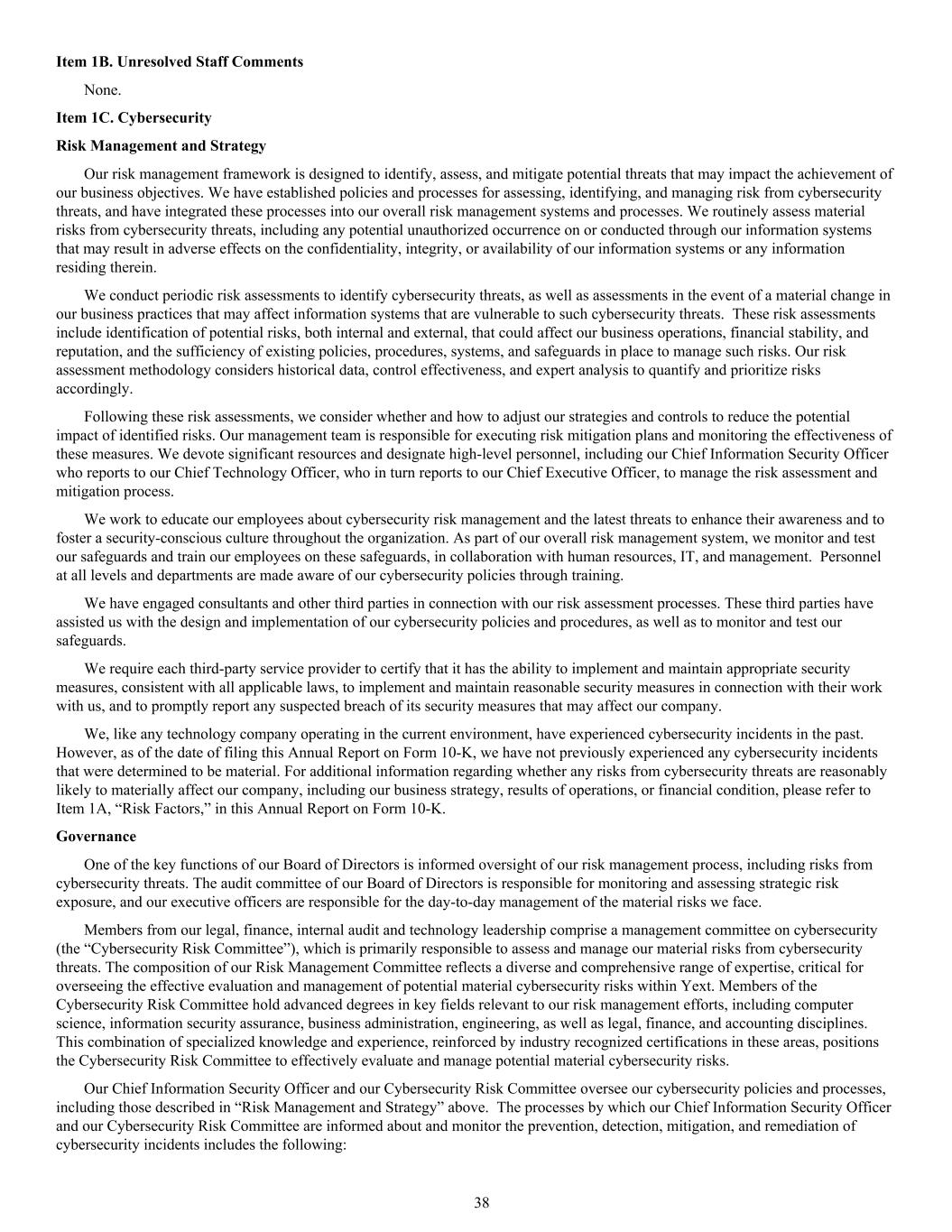 Item 1B. Unresolved Staff Comments None. Item 1C. Cybersecurity Risk Management and Strategy Our risk management framework is designed to identify, assess, and mitigate potential threats that may impact the achievement of our business objectives. We have established policies and processes for assessing, identifying, and managing risk from cybersecurity threats, and have integrated these processes into our overall risk management systems and processes. We routinely assess material risks from cybersecurity threats, including any potential unauthorized occurrence on or conducted through our information systems that may result in adverse effects on the confidentiality, integrity, or availability of our information systems or any information residing therein. We conduct periodic risk assessments to identify cybersecurity threats, as well as assessments in the event of a material change in our business practices that may affect information systems that are vulnerable to such cybersecurity threats. These risk assessments include identification of potential risks, both internal and external, that could affect our business operations, financial stability, and reputation, and the sufficiency of existing policies, procedures, systems, and safeguards in place to manage such risks. Our risk assessment methodology considers historical data, control effectiveness, and expert analysis to quantify and prioritize risks accordingly. Following these risk assessments, we consider whether and how to adjust our strategies and controls to reduce the potential impact of identified risks. Our management team is responsible for executing risk mitigation plans and monitoring the effectiveness of these measures. We devote significant resources and designate high-level personnel, including our Chief Information Security Officer who reports to our Chief Technology Officer, who in turn reports to our Chief Executive Officer, to manage the risk assessment and mitigation process. We work to educate our employees about cybersecurity risk management and the latest threats to enhance their awareness and to foster a security-conscious culture throughout the organization. As part of our overall risk management system, we monitor and test our safeguards and train our employees on these safeguards, in collaboration with human resources, IT, and management. Personnel at all levels and departments are made aware of our cybersecurity policies through training. We have engaged consultants and other third parties in connection with our risk assessment processes. These third parties have assisted us with the design and implementation of our cybersecurity policies and procedures, as well as to monitor and test our safeguards. We require each third-party service provider to certify that it has the ability to implement and maintain appropriate security measures, consistent with all applicable laws, to implement and maintain reasonable security measures in connection with their work with us, and to promptly report any suspected breach of its security measures that may affect our company. We, like any technology company operating in the current environment, have experienced cybersecurity incidents in the past. However, as of the date of filing this Annual Report on Form 10-K, we have not previously experienced any cybersecurity incidents that were determined to be material. For additional information regarding whether any risks from cybersecurity threats are reasonably likely to materially affect our company, including our business strategy, results of operations, or financial condition, please refer to Item 1A, “Risk Factors,” in this Annual Report on Form 10-K. Governance One of the key functions of our Board of Directors is informed oversight of our risk management process, including risks from cybersecurity threats. The audit committee of our Board of Directors is responsible for monitoring and assessing strategic risk exposure, and our executive officers are responsible for the day-to-day management of the material risks we face. Members from our legal, finance, internal audit and technology leadership comprise a management committee on cybersecurity (the “Cybersecurity Risk Committee”), which is primarily responsible to assess and manage our material risks from cybersecurity threats. The composition of our Risk Management Committee reflects a diverse and comprehensive range of expertise, critical for overseeing the effective evaluation and management of potential material cybersecurity risks within Yext. Members of the Cybersecurity Risk Committee hold advanced degrees in key fields relevant to our risk management efforts, including computer science, information security assurance, business administration, engineering, as well as legal, finance, and accounting disciplines. This combination of specialized knowledge and experience, reinforced by industry recognized certifications in these areas, positions the Cybersecurity Risk Committee to effectively evaluate and manage potential material cybersecurity risks. Our Chief Information Security Officer and our Cybersecurity Risk Committee oversee our cybersecurity policies and processes, including those described in “Risk Management and Strategy” above. The processes by which our Chief Information Security Officer and our Cybersecurity Risk Committee are informed about and monitor the prevention, detection, mitigation, and remediation of cybersecurity incidents includes the following: 38