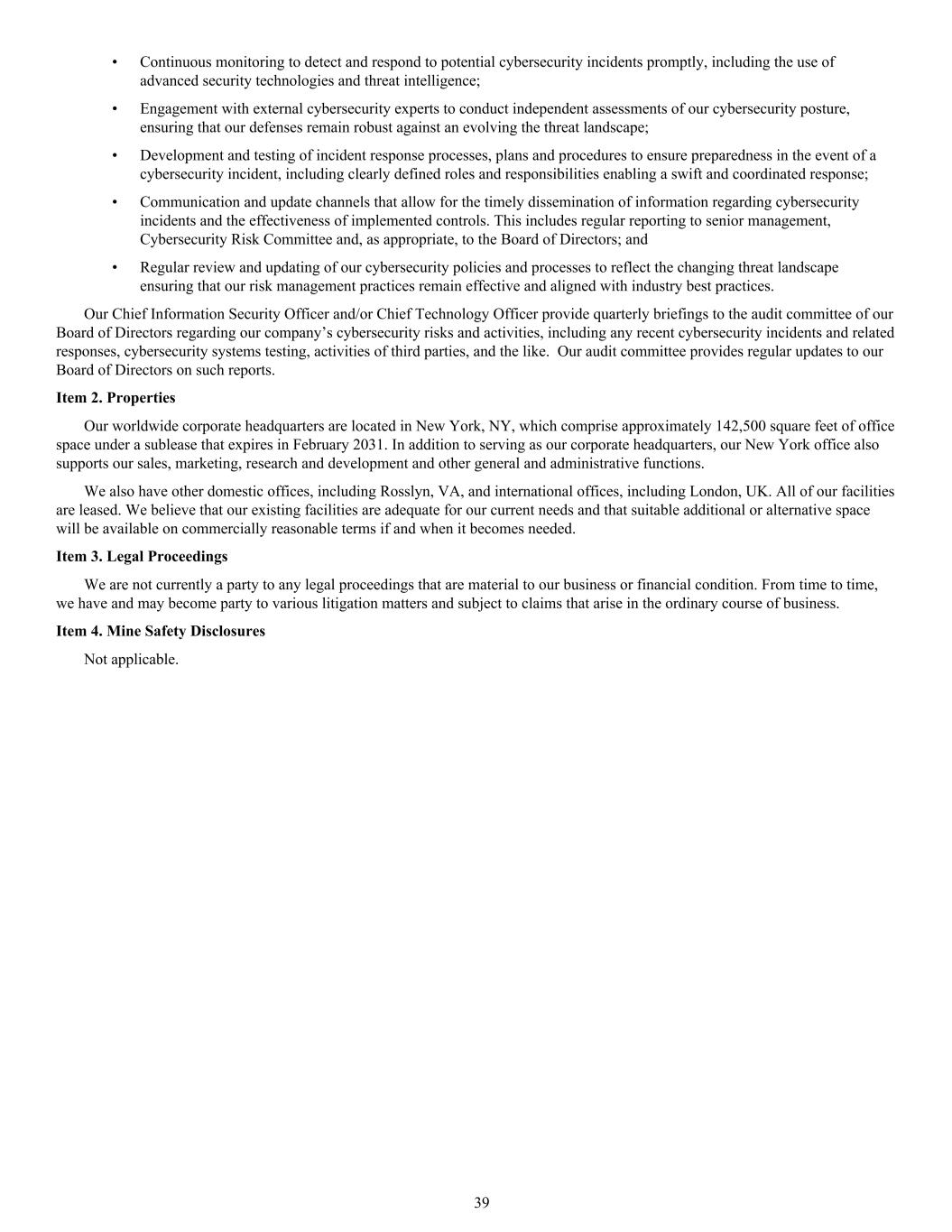 • Continuous monitoring to detect and respond to potential cybersecurity incidents promptly, including the use of advanced security technologies and threat intelligence; • Engagement with external cybersecurity experts to conduct independent assessments of our cybersecurity posture, ensuring that our defenses remain robust against an evolving the threat landscape; • Development and testing of incident response processes, plans and procedures to ensure preparedness in the event of a cybersecurity incident, including clearly defined roles and responsibilities enabling a swift and coordinated response; • Communication and update channels that allow for the timely dissemination of information regarding cybersecurity incidents and the effectiveness of implemented controls. This includes regular reporting to senior management, Cybersecurity Risk Committee and, as appropriate, to the Board of Directors; and • Regular review and updating of our cybersecurity policies and processes to reflect the changing threat landscape ensuring that our risk management practices remain effective and aligned with industry best practices. Our Chief Information Security Officer and/or Chief Technology Officer provide quarterly briefings to the audit committee of our Board of Directors regarding our company’s cybersecurity risks and activities, including any recent cybersecurity incidents and related responses, cybersecurity systems testing, activities of third parties, and the like. Our audit committee provides regular updates to our Board of Directors on such reports. Item 2. Properties Our worldwide corporate headquarters are located in New York, NY, which comprise approximately 142,500 square feet of office space under a sublease that expires in February 2031. In addition to serving as our corporate headquarters, our New York office also supports our sales, marketing, research and development and other general and administrative functions. We also have other domestic offices, including Rosslyn, VA, and international offices, including London, UK. All of our facilities are leased. We believe that our existing facilities are adequate for our current needs and that suitable additional or alternative space will be available on commercially reasonable terms if and when it becomes needed. Item 3. Legal Proceedings We are not currently a party to any legal proceedings that are material to our business or financial condition. From time to time, we have and may become party to various litigation matters and subject to claims that arise in the ordinary course of business. Item 4. Mine Safety Disclosures Not applicable. 39