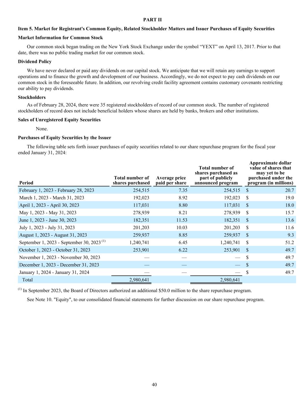 PART II Item 5. Market for Registrant's Common Equity, Related Stockholder Matters and Issuer Purchases of Equity Securities Market Information for Common Stock Our common stock began trading on the New York Stock Exchange under the symbol “YEXT” on April 13, 2017. Prior to that date, there was no public trading market for our common stock. Dividend Policy We have never declared or paid any dividends on our capital stock. We anticipate that we will retain any earnings to support operations and to finance the growth and development of our business. Accordingly, we do not expect to pay cash dividends on our common stock in the foreseeable future. In addition, our revolving credit facility agreement contains customary covenants restricting our ability to pay dividends. Stockholders As of February 28, 2024, there were 35 registered stockholders of record of our common stock. The number of registered stockholders of record does not include beneficial holders whose shares are held by banks, brokers and other institutions. Sales of Unregistered Equity Securities None. Purchases of Equity Securities by the Issuer The following table sets forth issuer purchases of equity securities related to our share repurchase program for the fiscal year ended January 31, 2024: Period Total number of shares purchased Average price paid per share Total number of shares purchased as part of publicly announced program Approximate dollar value of shares that may yet to be purchased under the program (in millions) February 1, 2023 - February 28, 2023 254,515 7.35 254,515 $ 20.7 March 1, 2023 - March 31, 2023 192,023 8.92 192,023 $ 19.0 April 1, 2023 - April 30, 2023 117,031 8.80 117,031 $ 18.0 May 1, 2023 - May 31, 2023 278,939 8.21 278,939 $ 15.7 June 1, 2023 - June 30, 2023 182,351 11.53 182,351 $ 13.6 July 1, 2023 - July 31, 2023 201,203 10.03 201,203 $ 11.6 August 1, 2023 - August 31, 2023 259,937 8.85 259,937 $ 9.3 September 1, 2023 - September 30, 2023 (1) 1,240,741 6.45 1,240,741 $ 51.2 October 1, 2023 - October 31, 2023 253,901 6.22 253,901 $ 49.7 November 1, 2023 - November 30, 2023 — — — $ 49.7 December 1, 2023 - December 31, 2023 — — — $ 49.7 January 1, 2024 - January 31, 2024 — — — $ 49.7 Total 2,980,641 2,980,641 (1) In September 2023, the Board of Directors authorized an additional $50.0 million to the share repurchase program. See Note 10. "Equity", to our consolidated financial statements for further discussion on our share repurchase program. 40