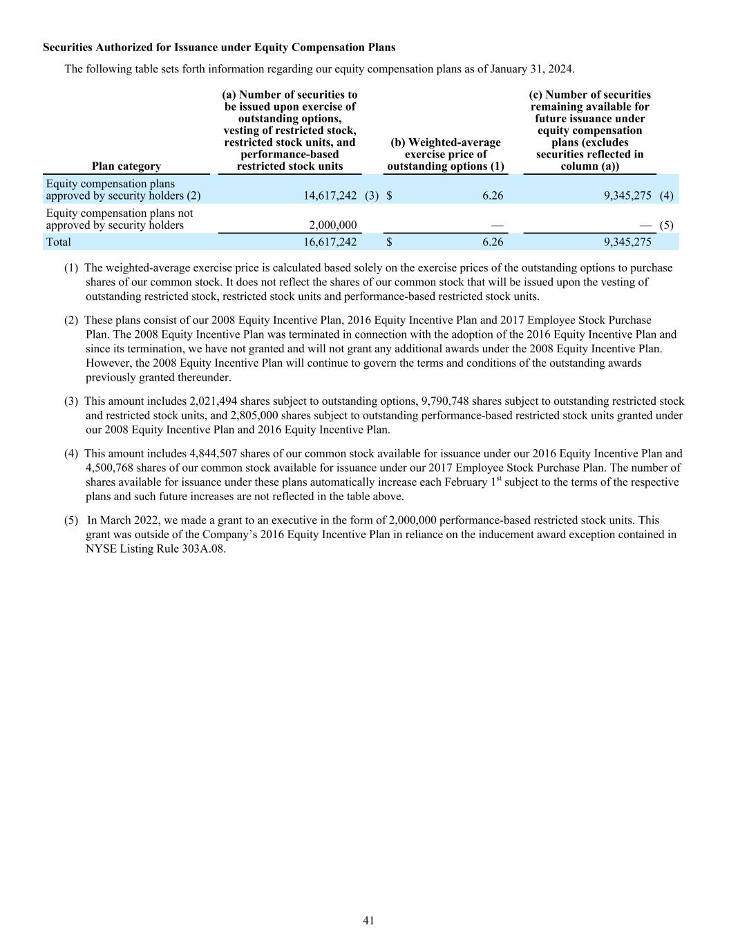 Securities Authorized for Issuance under Equity Compensation Plans The following table sets forth information regarding our equity compensation plans as of January 31, 2024. Plan category (a) Number of securities to be issued upon exercise of outstanding options, vesting of restricted stock, restricted stock units, and performance-based restricted stock units (b) Weighted-average exercise price of outstanding options (1) (c) Number of securities remaining available for future issuance under equity compensation plans (excludes securities reflected in column (a)) Equity compensation plans approved by security holders (2) 14,617,242 (3) $ 6.26 9,345,275 (4) Equity compensation plans not approved by security holders 2,000,000 — — (5) Total 16,617,242 $ 6.26 9,345,275 (1) The weighted-average exercise price is calculated based solely on the exercise prices of the outstanding options to purchase shares of our common stock. It does not reflect the shares of our common stock that will be issued upon the vesting of outstanding restricted stock, restricted stock units and performance-based restricted stock units. (2) These plans consist of our 2008 Equity Incentive Plan, 2016 Equity Incentive Plan and 2017 Employee Stock Purchase Plan. The 2008 Equity Incentive Plan was terminated in connection with the adoption of the 2016 Equity Incentive Plan and since its termination, we have not granted and will not grant any additional awards under the 2008 Equity Incentive Plan. However, the 2008 Equity Incentive Plan will continue to govern the terms and conditions of the outstanding awards previously granted thereunder. (3) This amount includes 2,021,494 shares subject to outstanding options, 9,790,748 shares subject to outstanding restricted stock and restricted stock units, and 2,805,000 shares subject to outstanding performance-based restricted stock units granted under our 2008 Equity Incentive Plan and 2016 Equity Incentive Plan. (4) This amount includes 4,844,507 shares of our common stock available for issuance under our 2016 Equity Incentive Plan and 4,500,768 shares of our common stock available for issuance under our 2017 Employee Stock Purchase Plan. The number of shares available for issuance under these plans automatically increase each February 1st subject to the terms of the respective plans and such future increases are not reflected in the table above. (5) In March 2022, we made a grant to an executive in the form of 2,000,000 performance-based restricted stock units. This grant was outside of the Company’s 2016 Equity Incentive Plan in reliance on the inducement award exception contained in NYSE Listing Rule 303A.08. 41
