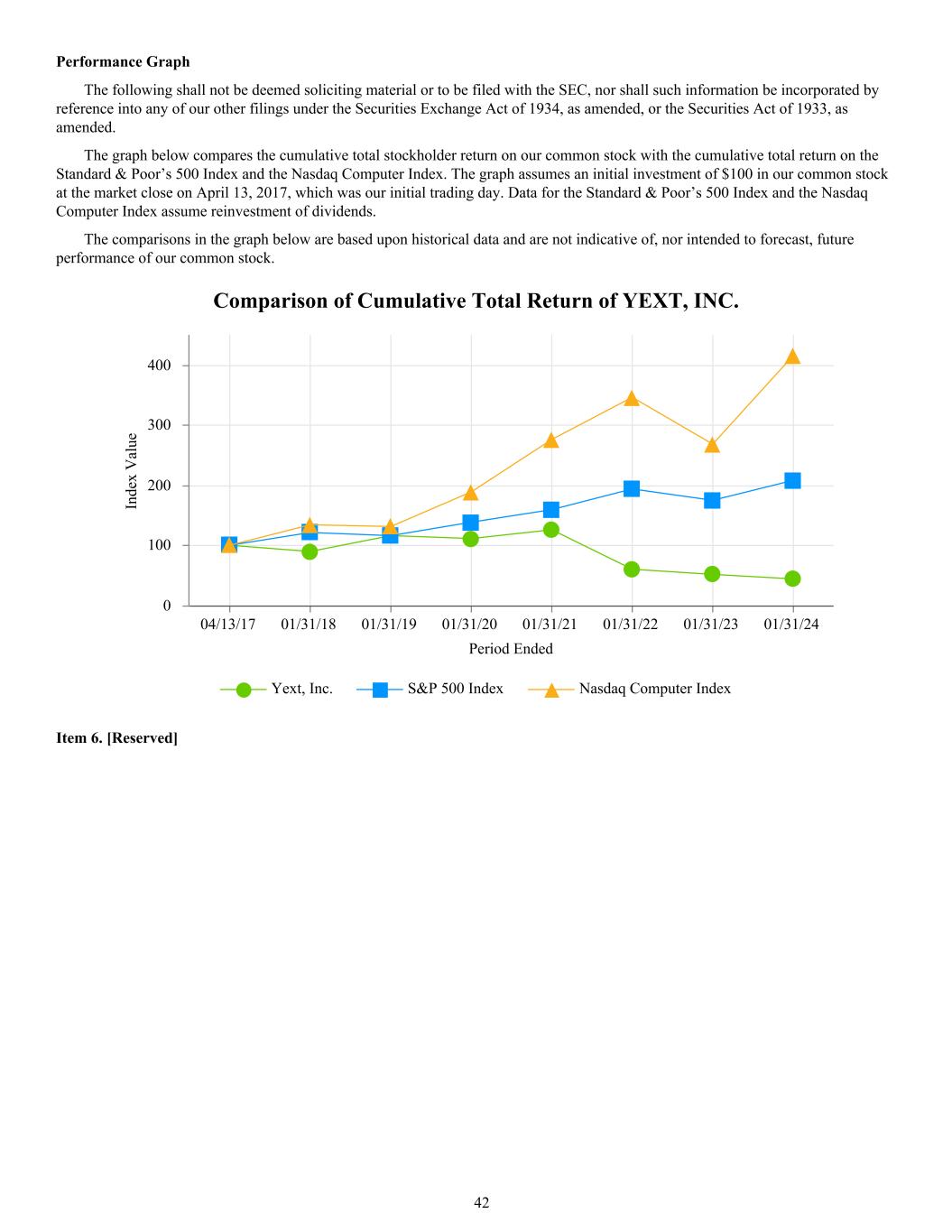 Performance Graph The following shall not be deemed soliciting material or to be filed with the SEC, nor shall such information be incorporated by reference into any of our other filings under the Securities Exchange Act of 1934, as amended, or the Securities Act of 1933, as amended. The graph below compares the cumulative total stockholder return on our common stock with the cumulative total return on the Standard & Poor’s 500 Index and the Nasdaq Computer Index. The graph assumes an initial investment of $100 in our common stock at the market close on April 13, 2017, which was our initial trading day. Data for the Standard & Poor’s 500 Index and the Nasdaq Computer Index assume reinvestment of dividends. The comparisons in the graph below are based upon historical data and are not indicative of, nor intended to forecast, future performance of our common stock. Period Ended In de x V al ue Comparison of Cumulative Total Return of YEXT, INC. Yext, Inc. S&P 500 Index Nasdaq Computer Index 04/13/17 01/31/18 01/31/19 01/31/20 01/31/21 01/31/22 01/31/23 01/31/24 0 100 200 300 400 Item 6. [Reserved] 42