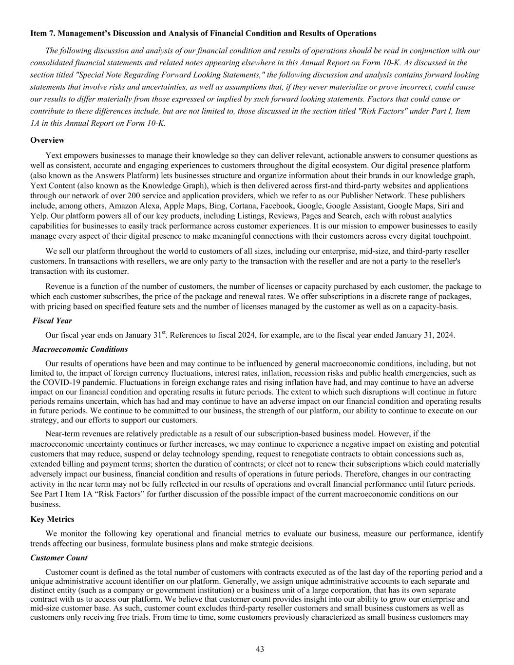 Item 7. Management’s Discussion and Analysis of Financial Condition and Results of Operations The following discussion and analysis of our financial condition and results of operations should be read in conjunction with our consolidated financial statements and related notes appearing elsewhere in this Annual Report on Form 10-K. As discussed in the section titled "Special Note Regarding Forward Looking Statements," the following discussion and analysis contains forward looking statements that involve risks and uncertainties, as well as assumptions that, if they never materialize or prove incorrect, could cause our results to differ materially from those expressed or implied by such forward looking statements. Factors that could cause or contribute to these differences include, but are not limited to, those discussed in the section titled "Risk Factors" under Part I, Item 1A in this Annual Report on Form 10-K. Overview Yext empowers businesses to manage their knowledge so they can deliver relevant, actionable answers to consumer questions as well as consistent, accurate and engaging experiences to customers throughout the digital ecosystem. Our digital presence platform (also known as the Answers Platform) lets businesses structure and organize information about their brands in our knowledge graph, Yext Content (also known as the Knowledge Graph), which is then delivered across first-and third-party websites and applications through our network of over 200 service and application providers, which we refer to as our Publisher Network. These publishers include, among others, Amazon Alexa, Apple Maps, Bing, Cortana, Facebook, Google, Google Assistant, Google Maps, Siri and Yelp. Our platform powers all of our key products, including Listings, Reviews, Pages and Search, each with robust analytics capabilities for businesses to easily track performance across customer experiences. It is our mission to empower businesses to easily manage every aspect of their digital presence to make meaningful connections with their customers across every digital touchpoint. We sell our platform throughout the world to customers of all sizes, including our enterprise, mid-size, and third-party reseller customers. In transactions with resellers, we are only party to the transaction with the reseller and are not a party to the reseller's transaction with its customer. Revenue is a function of the number of customers, the number of licenses or capacity purchased by each customer, the package to which each customer subscribes, the price of the package and renewal rates. We offer subscriptions in a discrete range of packages, with pricing based on specified feature sets and the number of licenses managed by the customer as well as on a capacity-basis. Fiscal Year Our fiscal year ends on January 31st. References to fiscal 2024, for example, are to the fiscal year ended January 31, 2024. Macroeconomic Conditions Our results of operations have been and may continue to be influenced by general macroeconomic conditions, including, but not limited to, the impact of foreign currency fluctuations, interest rates, inflation, recession risks and public health emergencies, such as the COVID-19 pandemic. Fluctuations in foreign exchange rates and rising inflation have had, and may continue to have an adverse impact on our financial condition and operating results in future periods. The extent to which such disruptions will continue in future periods remains uncertain, which has had and may continue to have an adverse impact on our financial condition and operating results in future periods. We continue to be committed to our business, the strength of our platform, our ability to continue to execute on our strategy, and our efforts to support our customers. Near-term revenues are relatively predictable as a result of our subscription-based business model. However, if the macroeconomic uncertainty continues or further increases, we may continue to experience a negative impact on existing and potential customers that may reduce, suspend or delay technology spending, request to renegotiate contracts to obtain concessions such as, extended billing and payment terms; shorten the duration of contracts; or elect not to renew their subscriptions which could materially adversely impact our business, financial condition and results of operations in future periods. Therefore, changes in our contracting activity in the near term may not be fully reflected in our results of operations and overall financial performance until future periods. See Part I Item 1A “Risk Factors” for further discussion of the possible impact of the current macroeconomic conditions on our business. Key Metrics We monitor the following key operational and financial metrics to evaluate our business, measure our performance, identify trends affecting our business, formulate business plans and make strategic decisions. Customer Count Customer count is defined as the total number of customers with contracts executed as of the last day of the reporting period and a unique administrative account identifier on our platform. Generally, we assign unique administrative accounts to each separate and distinct entity (such as a company or government institution) or a business unit of a large corporation, that has its own separate contract with us to access our platform. We believe that customer count provides insight into our ability to grow our enterprise and mid-size customer base. As such, customer count excludes third-party reseller customers and small business customers as well as customers only receiving free trials. From time to time, some customers previously characterized as small business customers may 43