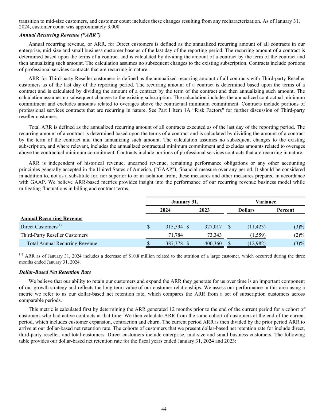 transition to mid-size customers, and customer count includes these changes resulting from any recharacterization. As of January 31, 2024, customer count was approximately 3,000. Annual Recurring Revenue ("ARR") Annual recurring revenue, or ARR, for Direct customers is defined as the annualized recurring amount of all contracts in our enterprise, mid-size and small business customer base as of the last day of the reporting period. The recurring amount of a contract is determined based upon the terms of a contract and is calculated by dividing the amount of a contract by the term of the contract and then annualizing such amount. The calculation assumes no subsequent changes to the existing subscription. Contracts include portions of professional services contracts that are recurring in nature. ARR for Third-party Reseller customers is defined as the annualized recurring amount of all contracts with Third-party Reseller customers as of the last day of the reporting period. The recurring amount of a contract is determined based upon the terms of a contract and is calculated by dividing the amount of a contract by the term of the contract and then annualizing such amount. The calculation assumes no subsequent changes to the existing subscription. The calculation includes the annualized contractual minimum commitment and excludes amounts related to overages above the contractual minimum commitment. Contracts include portions of professional services contracts that are recurring in nature. See Part I Item 1A “Risk Factors" for further discussion of Third-party reseller customers. Total ARR is defined as the annualized recurring amount of all contracts executed as of the last day of the reporting period. The recurring amount of a contract is determined based upon the terms of a contract and is calculated by dividing the amount of a contract by the term of the contract and then annualizing such amount. The calculation assumes no subsequent changes to the existing subscription, and where relevant, includes the annualized contractual minimum commitment and excludes amounts related to overages above the contractual minimum commitment. Contracts include portions of professional services contracts that are recurring in nature. ARR is independent of historical revenue, unearned revenue, remaining performance obligations or any other accounting principles generally accepted in the United States of America, ("GAAP"), financial measure over any period. It should be considered in addition to, not as a substitute for, nor superior to or in isolation from, these measures and other measures prepared in accordance with GAAP. We believe ARR-based metrics provides insight into the performance of our recurring revenue business model while mitigating fluctuations in billing and contract terms. January 31, Variance 2024 2023 Dollars Percent Annual Recurring Revenue Direct Customers(1) $ 315,594 $ 327,017 $ (11,423) (3) % Third-Party Reseller Customers 71,784 73,343 (1,559) (2) % Total Annual Recurring Revenue $ 387,378 $ 400,360 $ (12,982) (3) % (1) ARR as of January 31, 2024 includes a decrease of $10.8 million related to the attrition of a large customer, which occurred during the three months ended January 31, 2024. Dollar-Based Net Retention Rate We believe that our ability to retain our customers and expand the ARR they generate for us over time is an important component of our growth strategy and reflects the long term value of our customer relationships. We assess our performance in this area using a metric we refer to as our dollar-based net retention rate, which compares the ARR from a set of subscription customers across comparable periods. This metric is calculated first by determining the ARR generated 12 months prior to the end of the current period for a cohort of customers who had active contracts at that time. We then calculate ARR from the same cohort of customers at the end of the current period, which includes customer expansion, contraction and churn. The current period ARR is then divided by the prior period ARR to arrive at our dollar-based net retention rate. The cohorts of customers that we present dollar-based net retention rate for include direct, third-party reseller, and total customers. Direct customers include enterprise, mid-size and small business customers. The following table provides our dollar-based net retention rate for the fiscal years ended January 31, 2024 and 2023: 44