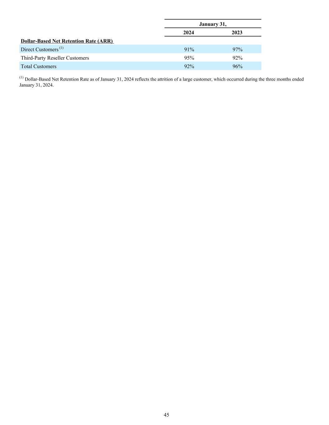 January 31, 2024 2023 Dollar-Based Net Retention Rate (ARR) Direct Customers (1) 91% 97% Third-Party Reseller Customers 95% 92% Total Customers 92% 96% (1) Dollar-Based Net Retention Rate as of January 31, 2024 reflects the attrition of a large customer, which occurred during the three months ended January 31, 2024. 45