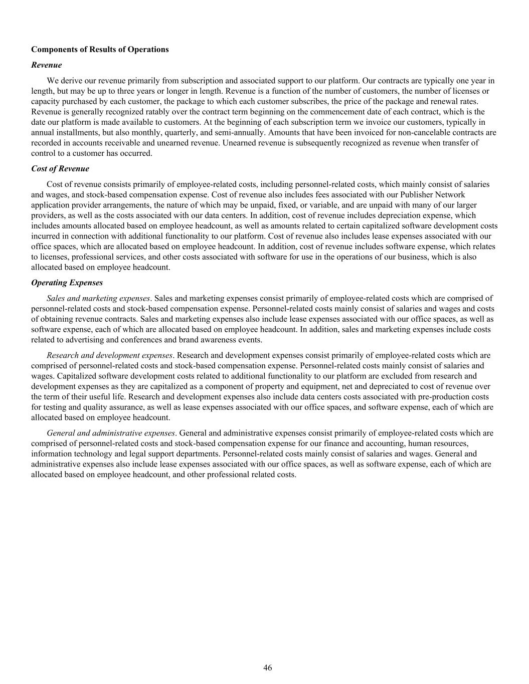 Components of Results of Operations Revenue We derive our revenue primarily from subscription and associated support to our platform. Our contracts are typically one year in length, but may be up to three years or longer in length. Revenue is a function of the number of customers, the number of licenses or capacity purchased by each customer, the package to which each customer subscribes, the price of the package and renewal rates. Revenue is generally recognized ratably over the contract term beginning on the commencement date of each contract, which is the date our platform is made available to customers. At the beginning of each subscription term we invoice our customers, typically in annual installments, but also monthly, quarterly, and semi-annually. Amounts that have been invoiced for non-cancelable contracts are recorded in accounts receivable and unearned revenue. Unearned revenue is subsequently recognized as revenue when transfer of control to a customer has occurred. Cost of Revenue Cost of revenue consists primarily of employee-related costs, including personnel-related costs, which mainly consist of salaries and wages, and stock-based compensation expense. Cost of revenue also includes fees associated with our Publisher Network application provider arrangements, the nature of which may be unpaid, fixed, or variable, and are unpaid with many of our larger providers, as well as the costs associated with our data centers. In addition, cost of revenue includes depreciation expense, which includes amounts allocated based on employee headcount, as well as amounts related to certain capitalized software development costs incurred in connection with additional functionality to our platform. Cost of revenue also includes lease expenses associated with our office spaces, which are allocated based on employee headcount. In addition, cost of revenue includes software expense, which relates to licenses, professional services, and other costs associated with software for use in the operations of our business, which is also allocated based on employee headcount. Operating Expenses Sales and marketing expenses. Sales and marketing expenses consist primarily of employee-related costs which are comprised of personnel-related costs and stock-based compensation expense. Personnel-related costs mainly consist of salaries and wages and costs of obtaining revenue contracts. Sales and marketing expenses also include lease expenses associated with our office spaces, as well as software expense, each of which are allocated based on employee headcount. In addition, sales and marketing expenses include costs related to advertising and conferences and brand awareness events. Research and development expenses. Research and development expenses consist primarily of employee-related costs which are comprised of personnel-related costs and stock-based compensation expense. Personnel-related costs mainly consist of salaries and wages. Capitalized software development costs related to additional functionality to our platform are excluded from research and development expenses as they are capitalized as a component of property and equipment, net and depreciated to cost of revenue over the term of their useful life. Research and development expenses also include data centers costs associated with pre-production costs for testing and quality assurance, as well as lease expenses associated with our office spaces, and software expense, each of which are allocated based on employee headcount. General and administrative expenses. General and administrative expenses consist primarily of employee-related costs which are comprised of personnel-related costs and stock-based compensation expense for our finance and accounting, human resources, information technology and legal support departments. Personnel-related costs mainly consist of salaries and wages. General and administrative expenses also include lease expenses associated with our office spaces, as well as software expense, each of which are allocated based on employee headcount, and other professional related costs. 46