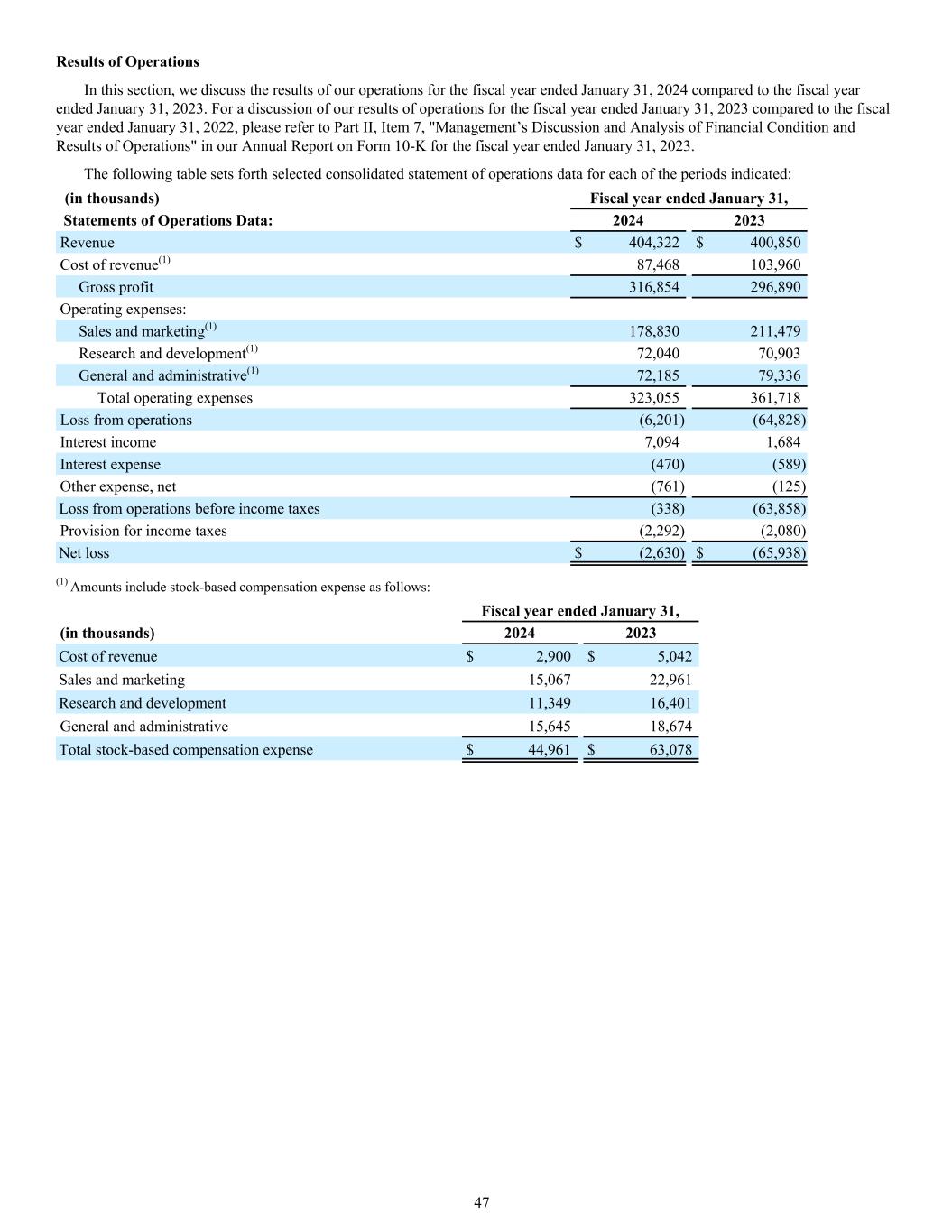 Results of Operations In this section, we discuss the results of our operations for the fiscal year ended January 31, 2024 compared to the fiscal year ended January 31, 2023. For a discussion of our results of operations for the fiscal year ended January 31, 2023 compared to the fiscal year ended January 31, 2022, please refer to Part II, Item 7, "Management’s Discussion and Analysis of Financial Condition and Results of Operations" in our Annual Report on Form 10-K for the fiscal year ended January 31, 2023. The following table sets forth selected consolidated statement of operations data for each of the periods indicated: Statements of Operations Data: 2024 2023 Revenue $ 404,322 $ 400,850 Cost of revenue(1) 87,468 103,960 Gross profit 316,854 296,890 Operating expenses: Sales and marketing(1) 178,830 211,479 Research and development(1) 72,040 70,903 General and administrative(1) 72,185 79,336 Total operating expenses 323,055 361,718 Loss from operations (6,201) (64,828) Interest income 7,094 1,684 Interest expense (470) (589) Other expense, net (761) (125) Loss from operations before income taxes (338) (63,858) Provision for income taxes (2,292) (2,080) Net loss $ (2,630) $ (65,938) (in thousands) Fiscal year ended January 31, (1) Amounts include stock-based compensation expense as follows: Fiscal year ended January 31, (in thousands) 2024 2023 Cost of revenue $ 2,900 $ 5,042 Sales and marketing 15,067 22,961 Research and development 11,349 16,401 General and administrative 15,645 18,674 Total stock-based compensation expense $ 44,961 $ 63,078 47