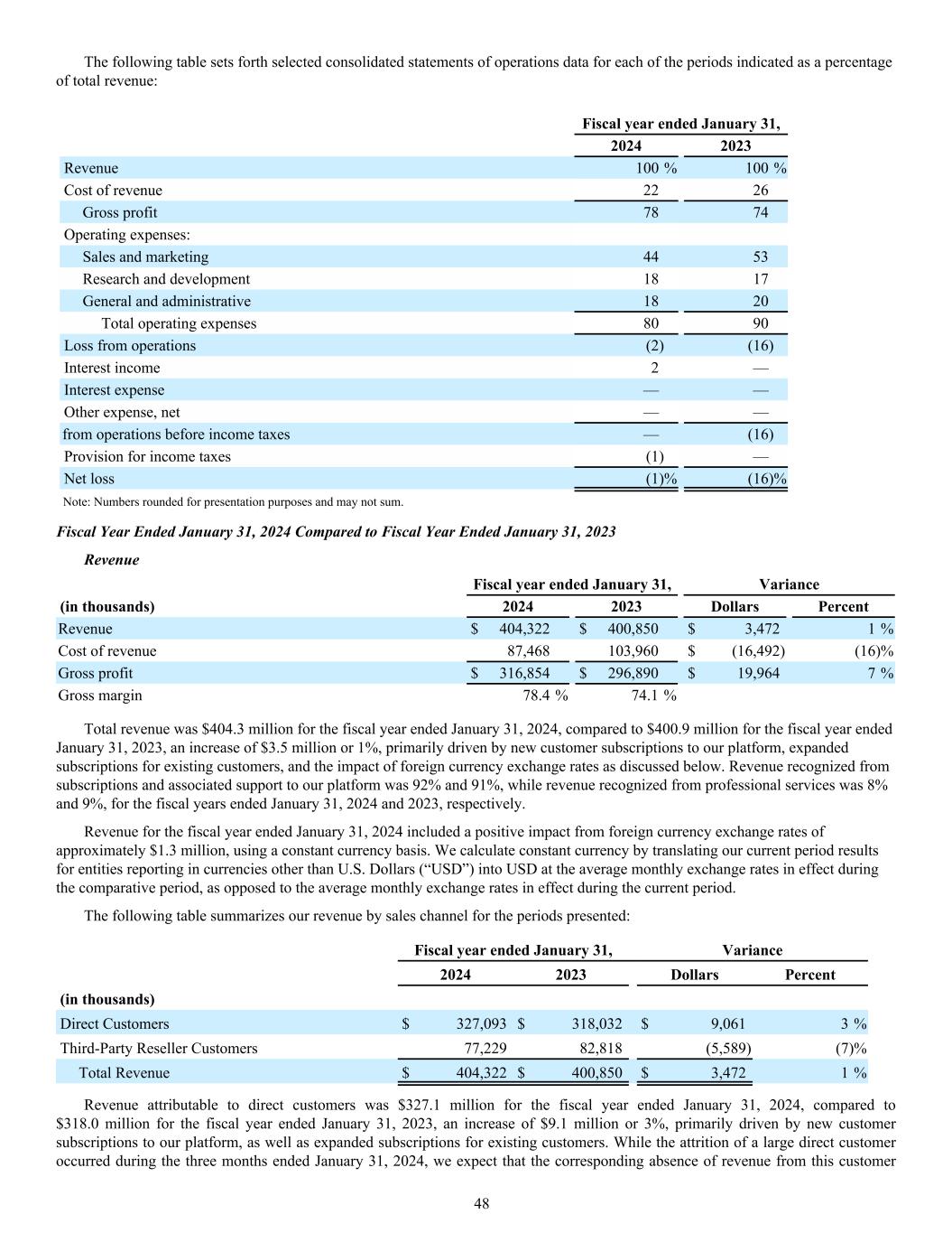 The following table sets forth selected consolidated statements of operations data for each of the periods indicated as a percentage of total revenue: Fiscal year ended January 31, 2024 2023 Revenue 100 % 100 % Cost of revenue 22 26 Gross profit 78 74 Operating expenses: Sales and marketing 44 53 Research and development 18 17 General and administrative 18 20 Total operating expenses 80 90 Loss from operations (2) (16) Interest income 2 — Interest expense — — Other expense, net — — Loss from operations before income taxes — (16) Provision for income taxes (1) — Net loss (1) % (16) % Note: Numbers rounded for presentation purposes and may not sum. Fiscal Year Ended January 31, 2024 Compared to Fiscal Year Ended January 31, 2023 Revenue Fiscal year ended January 31, Variance (in thousands) 2024 2023 Dollars Percent Revenue $ 404,322 $ 400,850 $ 3,472 1 % Cost of revenue 87,468 103,960 $ (16,492) (16) % Gross profit $ 316,854 $ 296,890 $ 19,964 7 % Gross margin 78.4 % 74.1 % Total revenue was $404.3 million for the fiscal year ended January 31, 2024, compared to $400.9 million for the fiscal year ended January 31, 2023, an increase of $3.5 million or 1%, primarily driven by new customer subscriptions to our platform, expanded subscriptions for existing customers, and the impact of foreign currency exchange rates as discussed below. Revenue recognized from subscriptions and associated support to our platform was 92% and 91%, while revenue recognized from professional services was 8% and 9%, for the fiscal years ended January 31, 2024 and 2023, respectively. Revenue for the fiscal year ended January 31, 2024 included a positive impact from foreign currency exchange rates of approximately $1.3 million, using a constant currency basis. We calculate constant currency by translating our current period results for entities reporting in currencies other than U.S. Dollars (“USD”) into USD at the average monthly exchange rates in effect during the comparative period, as opposed to the average monthly exchange rates in effect during the current period. The following table summarizes our revenue by sales channel for the periods presented: Fiscal year ended January 31, Variance 2024 2023 Dollars Percent (in thousands) Direct Customers $ 327,093 $ 318,032 $ 9,061 3 % Third-Party Reseller Customers 77,229 82,818 (5,589) (7) % Total Revenue $ 404,322 $ 400,850 $ 3,472 1 % Revenue attributable to direct customers was $327.1 million for the fiscal year ended January 31, 2024, compared to $318.0 million for the fiscal year ended January 31, 2023, an increase of $9.1 million or 3%, primarily driven by new customer subscriptions to our platform, as well as expanded subscriptions for existing customers. While the attrition of a large direct customer occurred during the three months ended January 31, 2024, we expect that the corresponding absence of revenue from this customer 48
