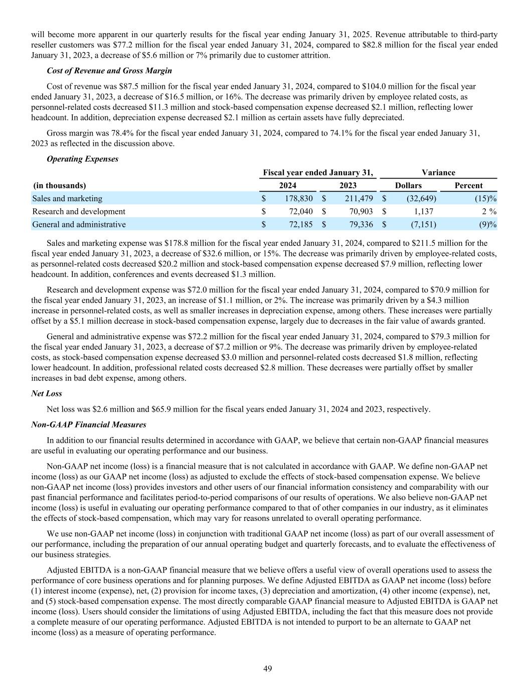 will become more apparent in our quarterly results for the fiscal year ending January 31, 2025. Revenue attributable to third-party reseller customers was $77.2 million for the fiscal year ended January 31, 2024, compared to $82.8 million for the fiscal year ended January 31, 2023, a decrease of $5.6 million or 7% primarily due to customer attrition. Cost of Revenue and Gross Margin Cost of revenue was $87.5 million for the fiscal year ended January 31, 2024, compared to $104.0 million for the fiscal year ended January 31, 2023, a decrease of $16.5 million, or 16%. The decrease was primarily driven by employee related costs, as personnel-related costs decreased $11.3 million and stock-based compensation expense decreased $2.1 million, reflecting lower headcount. In addition, depreciation expense decreased $2.1 million as certain assets have fully depreciated. Gross margin was 78.4% for the fiscal year ended January 31, 2024, compared to 74.1% for the fiscal year ended January 31, 2023 as reflected in the discussion above. Operating Expenses Fiscal year ended January 31, Variance (in thousands) 2024 2023 Dollars Percent Sales and marketing $ 178,830 $ 211,479 $ (32,649) (15) % Research and development $ 72,040 $ 70,903 $ 1,137 2 % General and administrative $ 72,185 $ 79,336 $ (7,151) (9) % Sales and marketing expense was $178.8 million for the fiscal year ended January 31, 2024, compared to $211.5 million for the fiscal year ended January 31, 2023, a decrease of $32.6 million, or 15%. The decrease was primarily driven by employee-related costs, as personnel-related costs decreased $20.2 million and stock-based compensation expense decreased $7.9 million, reflecting lower headcount. In addition, conferences and events decreased $1.3 million. Research and development expense was $72.0 million for the fiscal year ended January 31, 2024, compared to $70.9 million for the fiscal year ended January 31, 2023, an increase of $1.1 million, or 2%. The increase was primarily driven by a $4.3 million increase in personnel-related costs, as well as smaller increases in depreciation expense, among others. These increases were partially offset by a $5.1 million decrease in stock-based compensation expense, largely due to decreases in the fair value of awards granted. General and administrative expense was $72.2 million for the fiscal year ended January 31, 2024, compared to $79.3 million for the fiscal year ended January 31, 2023, a decrease of $7.2 million or 9%. The decrease was primarily driven by employee-related costs, as stock-based compensation expense decreased $3.0 million and personnel-related costs decreased $1.8 million, reflecting lower headcount. In addition, professional related costs decreased $2.8 million. These decreases were partially offset by smaller increases in bad debt expense, among others. Net Loss Net loss was $2.6 million and $65.9 million for the fiscal years ended January 31, 2024 and 2023, respectively. Non-GAAP Financial Measures In addition to our financial results determined in accordance with GAAP, we believe that certain non-GAAP financial measures are useful in evaluating our operating performance and our business. Non-GAAP net income (loss) is a financial measure that is not calculated in accordance with GAAP. We define non-GAAP net income (loss) as our GAAP net income (loss) as adjusted to exclude the effects of stock-based compensation expense. We believe non-GAAP net income (loss) provides investors and other users of our financial information consistency and comparability with our past financial performance and facilitates period-to-period comparisons of our results of operations. We also believe non-GAAP net income (loss) is useful in evaluating our operating performance compared to that of other companies in our industry, as it eliminates the effects of stock-based compensation, which may vary for reasons unrelated to overall operating performance. We use non-GAAP net income (loss) in conjunction with traditional GAAP net income (loss) as part of our overall assessment of our performance, including the preparation of our annual operating budget and quarterly forecasts, and to evaluate the effectiveness of our business strategies. Adjusted EBITDA is a non-GAAP financial measure that we believe offers a useful view of overall operations used to assess the performance of core business operations and for planning purposes. We define Adjusted EBITDA as GAAP net income (loss) before (1) interest income (expense), net, (2) provision for income taxes, (3) depreciation and amortization, (4) other income (expense), net, and (5) stock-based compensation expense. The most directly comparable GAAP financial measure to Adjusted EBITDA is GAAP net income (loss). Users should consider the limitations of using Adjusted EBITDA, including the fact that this measure does not provide a complete measure of our operating performance. Adjusted EBITDA is not intended to purport to be an alternate to GAAP net income (loss) as a measure of operating performance. 49