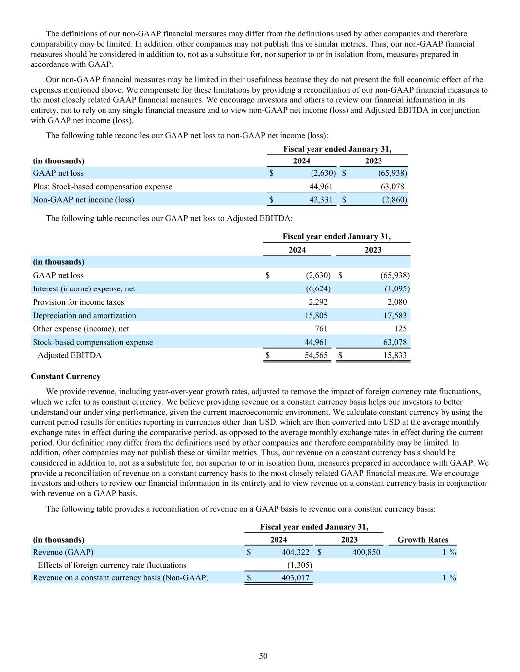 The definitions of our non-GAAP financial measures may differ from the definitions used by other companies and therefore comparability may be limited. In addition, other companies may not publish this or similar metrics. Thus, our non-GAAP financial measures should be considered in addition to, not as a substitute for, nor superior to or in isolation from, measures prepared in accordance with GAAP. Our non-GAAP financial measures may be limited in their usefulness because they do not present the full economic effect of the expenses mentioned above. We compensate for these limitations by providing a reconciliation of our non-GAAP financial measures to the most closely related GAAP financial measures. We encourage investors and others to review our financial information in its entirety, not to rely on any single financial measure and to view non-GAAP net income (loss) and Adjusted EBITDA in conjunction with GAAP net income (loss). The following table reconciles our GAAP net loss to non-GAAP net income (loss): Fiscal year ended January 31, (in thousands) 2024 2023 GAAP net loss $ (2,630) $ (65,938) Plus: Stock-based compensation expense 44,961 63,078 Non-GAAP net income (loss) $ 42,331 $ (2,860) The following table reconciles our GAAP net loss to Adjusted EBITDA: Fiscal year ended January 31, 2024 2023 (in thousands) GAAP net loss $ (2,630) $ (65,938) Interest (income) expense, net (6,624) (1,095) Provision for income taxes 2,292 2,080 Depreciation and amortization 15,805 17,583 Other expense (income), net 761 125 Stock-based compensation expense 44,961 63,078 Adjusted EBITDA $ 54,565 $ 15,833 Constant Currency We provide revenue, including year-over-year growth rates, adjusted to remove the impact of foreign currency rate fluctuations, which we refer to as constant currency. We believe providing revenue on a constant currency basis helps our investors to better understand our underlying performance, given the current macroeconomic environment. We calculate constant currency by using the current period results for entities reporting in currencies other than USD, which are then converted into USD at the average monthly exchange rates in effect during the comparative period, as opposed to the average monthly exchange rates in effect during the current period. Our definition may differ from the definitions used by other companies and therefore comparability may be limited. In addition, other companies may not publish these or similar metrics. Thus, our revenue on a constant currency basis should be considered in addition to, not as a substitute for, nor superior to or in isolation from, measures prepared in accordance with GAAP. We provide a reconciliation of revenue on a constant currency basis to the most closely related GAAP financial measure. We encourage investors and others to review our financial information in its entirety and to view revenue on a constant currency basis in conjunction with revenue on a GAAP basis. The following table provides a reconciliation of revenue on a GAAP basis to revenue on a constant currency basis: Fiscal year ended January 31, (in thousands) 2024 2023 Growth Rates Revenue (GAAP) $ 404,322 $ 400,850 1 % Effects of foreign currency rate fluctuations (1,305) Revenue on a constant currency basis (Non-GAAP) $ 403,017 1 % 50